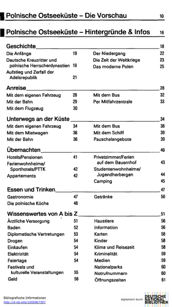 Polnische Ostseeküste - Die Vorschau 10 Polnische Ostseeküste - Hintergründe & Infos 16 Geschichte 18 Die Anfänge 19 Deutsche Kreuzritter und polnische Herrscherdynastien 19 Aufstieg und Zerfall der Adelsrepublik Der Niedergang 22 Die Zeit der Weltkriege 23 Das moderne Polen 25 21 Anreise 28 Mit dem eigenen Fahrzeug 28 Mit dem Bus 32 Mit der Bahn 29 Per Mitfahrzentrale 33 Mit dem Flugzeug 30 Unterwegs an der Küste 34 Mit dem eigenen Fahrzeug 34 Mit dem Bus 38 Mit dem Mietwagen 36 Mit dem Schiff 39 Mit der Bahn 36 Pauschalangebote 39 Hotels/Pensionen 41 Ferienwohnheime/ Sporthotels/PTTK Privatzimmer/Ferien auf dem Bauernhof 43 42 Appartements 42 Studentenwohnheime/ Jugendherbergen 44 Camping 45 Getränke 50 Übernachten 40 Essen und Trinken 47 Gastronomie 47 Die polnische Küche 48 Wissenswertes von A bis Z 51 Ärztliche Versorgung 51 Haustiere 56 Baden 52 Information 56 Diplomatische Vertretungen 53 Karten 58 Drogen 54 Kinder 58 Einkaufen 54 Klima und Reisezeit 58 Elektrizität 54 Kriminalität 59 Feiertage 54 Medien 59 Festivals und kulturelle Veranstaltungen Geld http://d-nb.info/1055967397 Nationalparks 60 55 Notrufnummern 60 56 Öffnungszeiten 61 Ortsbezeichnungen/ Geografische Begriffe Reisen mit Handicap 64 62 Sport 64 Post 62 Telefon und Internet 65 Preise 63 Toiletten 66 Rauchen 63 Zoll 66 Reisepapiere 64 Polnische Ostseeküste - Reiseziele 68 Stettin (Szczecin) 70 Die Insel Wolin Wolin äwinoujäcie Mi@dzyzdroje 90 90 93 Wolirtski Park Narodowny (Wolliner Nationalpark) 105 100 Die Küste Pommerns 108 Dziwnöw 109 Ustka 136 Kamiert Pomorski 109 Stupsk 140 Trzebiatöw 115 Kotobrzeg 115 Koszalin 126 Stowiriski Park Narodowy (Slowinzischer Nationalpark) 149 Rowy 148 Mielno 130 Gardna Wielka 150 Dartowo 132 Smofdzino 150 Dartöwko 136 Leba 151 Kaschubische Küste und Kaschubische Schweiz 158 Kaschubische Küste 158 Hei 167 Krokowa 159 160 Puck Wejherowo 169 D§bki Karwia 161 Jastrz$bia Göra 161 Szwajcaria Kaszubska (Kaschubische Schweiz) Halbinsel Hei 163 Kartuzy 175 175 Wtadystawowo 163 Chmielno 176 Jastarnia 165 Wdzydze 177 Tröimiasto - die Dreistadt Gdynia 173 178 178 Altstadt (Stare Miasto) Sopot 188 Danzig (Gdaiisk) 199 Alte Rechtstadt (Gtöwne Miasto) Leninwerft (Stocznia Gdarfska) 222 Alte Vorstadt (Stare Przedmiegcie) 223 214 Oliwa 220 226 Weichseldelta, Frische Nehrung und Frisches Haff 228 Sztutowo 229 Malbork 234 Katy Rybackie 230 Elblag 240 Krynica Morska Gniew 230 231 Der Elblag-Oströda-Kanal (Kanat Elblaski) Frombork 245 246 ~~| Kleiner Wanderführer 252 Wanderung 1 Strandtour von Mi^dzyzdroje nach Wiseika 255 Wanderung 2 Zum Wisentgehege und nach Kotczewo 258 Wanderung 3 Entlang des Stettiner Haffs nach Wolin 259 Wanderung 4 Durch den Slowinzischen Nationalpark 262 Wanderung 5 Zur großen Düne Wydma Czotpiriska und zum Leuchtturm 264 Wanderung 6 Am Strand entlang zur Wanderdüne 266 Wanderung 7 Rundtour ab Ryjewo zur Wehrburg in Gniew 268 Etwas Polnisch 272 Register 283 Kartenverzeichnis Übersicht Polnische Ostseeküste Dartowo (Rügenwalde) Elblag (Elbing) Frombork (Frauenburg) Gdarisk (Danzig) Gdynia (Gdingen) Kamierf Pomorski (Cammin) Kotobrzeg (Kolberg) Koszalin (Köslin) Leba(Leba) Malbork (Marienburg) 135 243 247 208/209 183 111 120/121 128/129 154/155 237 Umschlagklappen Miedzyzdroje (Misdroy) Puck (Putzig) Slupsk (Stolp) 103 171 143 Sopot (Zoppot) Öwinoujäcie (Swinemünde) Szczecin (Stettin) Tröjmiasto - die Dreistadt Ustka (Stolpmünde) Übersicht der Wanderungen 193 97 75 181 139 254 Stanislaw Ignacy Witkiewicz, „Witkacy" (1885-1939): Allroundtalent mit exzentrischem Lebensstil Der ultimative Biertest Günter Grass (* 16. Oktober 1927) Dr. Rudolf Spanner (1895-1960) Solidarno££ Der Deutsche Orden Nikolaus Kopernikus (Mikotaj Kopernik. 1473-1543) 145 172 221 222 224 232 Alles im Kasten Die Henkerin von Stettin Vineta - die versunkene Stadt Von den Fährnissen eines Bades im Meer Doktor Pommer „Kolberg" - ein NSPropagandafilm von Veit Harlan (1944) Piratenkönig und letzter Wikinger 85 91 110 113 117 133 248