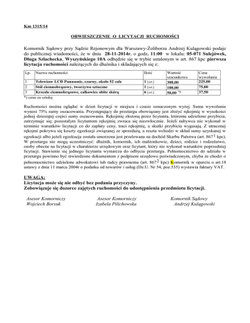 Km 1315/14 OBWIESZCZENIE O LICYTACJI RUCHOMOŚCI Komornik Sądowy przy Sądzie Rejonowym dla Warszawy-Żoliborza Andrzej Kulągowski podaje do publicznej wiadomości, że w dniu 28-11-2014r. o godz. 11:00 w lokalu: 05-071 Sulejówek, Długa Szlachecka, Wyszyńskiego 10A odbędzie się w trybie ustalonym w art. 867 kpc pierwsza licytacja ruchomości należących do dłużnika i składających się z: Lp. Nazwa ruchomości Ilość 1 Telewizor LCD Panasonic, czarny, około 52 cale 2 Stół ciemnobrązowy, tworzywo sztuczne 3 Krzesło ciemnobrązowe, całkowice obite skórą *) cena za sztukę 1 [szt.] 1 [szt.] 6 [szt.] Wartość szacunkowa 300,00 100,00 50,00 *) Cena wywołania 225,00 75,00 37,50 Ruchomości można oglądać w dzień licytacji w miejscu i czasie oznaczonym wyżej. Suma wywołania wynosi 75% sumy oszacowania. Przystępujący do przetargu obowiązany jest złożyć rękojmię w wysokości jednej dziesiątej części sumy oszacowania. Rękojmię złożoną przez licytanta, któremu udzielono przybicia, zatrzymuje się; pozostałym licytantom rękojmię zwraca się niezwłocznie. Jeżeli nabywca nie wykonał w terminie warunków licytacji co do zapłaty ceny, traci rękojmię, a skutki przybicia wygasają. Z utraconej rękojmi pokrywa się koszty egzekucji związanej ze sprzedażą, a reszta wchodzi w skład sumy uzyskanej w egzekucji albo jeżeli egzekucja została umorzona jest przelewana na dochód Skarbu Państwa (art. 867 1 kpc). W przetargu nie mogą uczestniczyć: dłużnik, komornik, ich małżonkowie, dzieci, rodzice i rodzeństwo, osoby obecne na licytacji w charakterze urzędowym oraz licytant, który nie wykonał warunków poprzedniej licytacji. Stawienie się jednego licytanta wystarcza do odbycia przetargu. Pełnomocnictwo do udziału w przetargu powinno być stwierdzone dokumentem z podpisem urzędowo poświadczonym, chyba że chodzi o pełnomocnictwo udzielone adwokatowi lub radcy prawnemu (art. 867 2 kpc) Komornik w oparciu o art.18 ustawy z dnia 11 marca 2004r o podatku od towarów i usług (Dz.U. Nr 54, poz.535) wystawia faktury VAT. UWAGA: Licytacja może się nie odbyć bez podania przyczyny. Zobowiązuje się dozorce zajętych ruchomości do udostępnienia przedmiotu licytacji. Asesor Komorniczy Wojciech Borsuk Asesor Komorniczy Izabela Pilichowska Komornik Sądowy Andrzej Kulągowski