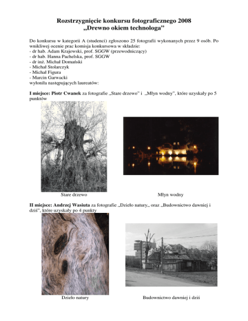 Rozstrzygni cie konkursu fotograficznego 2008 „Drewno okiem technologa” Do konkursu w kategorii A (studenci) zgłoszono 25 fotografii wykonanych przez 9 osób. Po wnikliwej ocenie prac komisja konkursowa w składzie: - dr hab. Adam Krajewski, prof. SGGW (przewodnicz cy) - dr hab. Hanna Pachelska, prof. SGGW - dr in . Michał Doma ski - Michał Stolarczyk - Michał Figura - Marcin Garwacki wyłoniła nast puj cych laureatów: I miejsce: Piotr Cwanek za fotografie „Stare drzewo” i „Młyn wodny”, które uzyskały po 5 punktów Stare drzewo Młyn wodny II miejsce: Andrzej Wasiuta za fotografie „Dzieło natury„ oraz „Budownictwo dawniej i dzi ”, które uzyskały po 4 punkty Dzieło natury Budownictwo dawniej i dzi 3 x III miejsce: Piotr Michałowski za fotografi „Reinkarnacja” – 3 punkty Aleksandra Warchulska za fotografi „Zakr cone” – 3 punkty Bartosz Szafranek za fotografi „Unikalna wi ba dachowa” – 3 punkty Reinkarnacja Zakr cone Unikalna wi ba dachowa Do konkursu w kategorii B (pracownicy) zgłoszono11 fotografii. Ze wzgl du na niewielk ilo prac postanowiono nie ró nicowa miejsc, przyznaj c 3 wyró nienia: Piotr Borysiuk – „Poł czenie bezolejowe” Marcin Klimczewski - „F1” Paweł Kozakiewicz - „Białowieski skansen” Poł czenie bezolejowe F1 Białowieski skansen Dziekan Wydziału Technologii Drewna Dr hab. Adam Krajewski, prof. SGGW