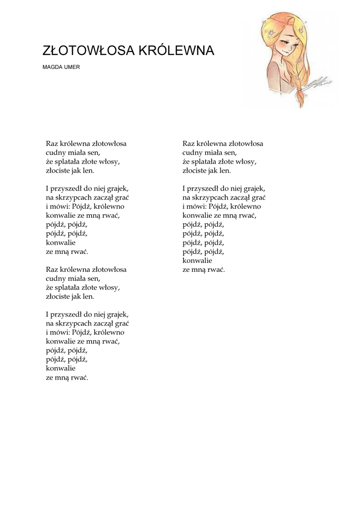 ZŁOTOWŁOSA KRÓLEWNA MAGDA UMER Raz królewna złotowłosa cudny miała sen, że splatała złote włosy, złociste jak len. Raz królewna złotowłosa cudny miała sen, że splatała złote włosy, złociste jak len. I przyszedł do niej grajek, na skrzypcach zaczął grać i mówi: Pójdź, królewno konwalie ze mną rwać, pójdź, pójdź, pójdź, pójdź, konwalie ze mną rwać. I przyszedł do niej grajek, na skrzypcach zaczął grać i mówi: Pójdź, królewno konwalie ze mną rwać, pójdź, pójdź, pójdź, pójdź, pójdź, pójdź, pójdź, pójdź, konwalie ze mną rwać. Raz królewna złotowłosa cudny miała sen, że splatała złote włosy, złociste jak len. I przyszedł do niej grajek, na skrzypcach zaczął grać i mówi: Pójdź, królewno konwalie ze mną rwać, pójdź, pójdź, pójdź, pójdź, konwalie ze mną rwać.