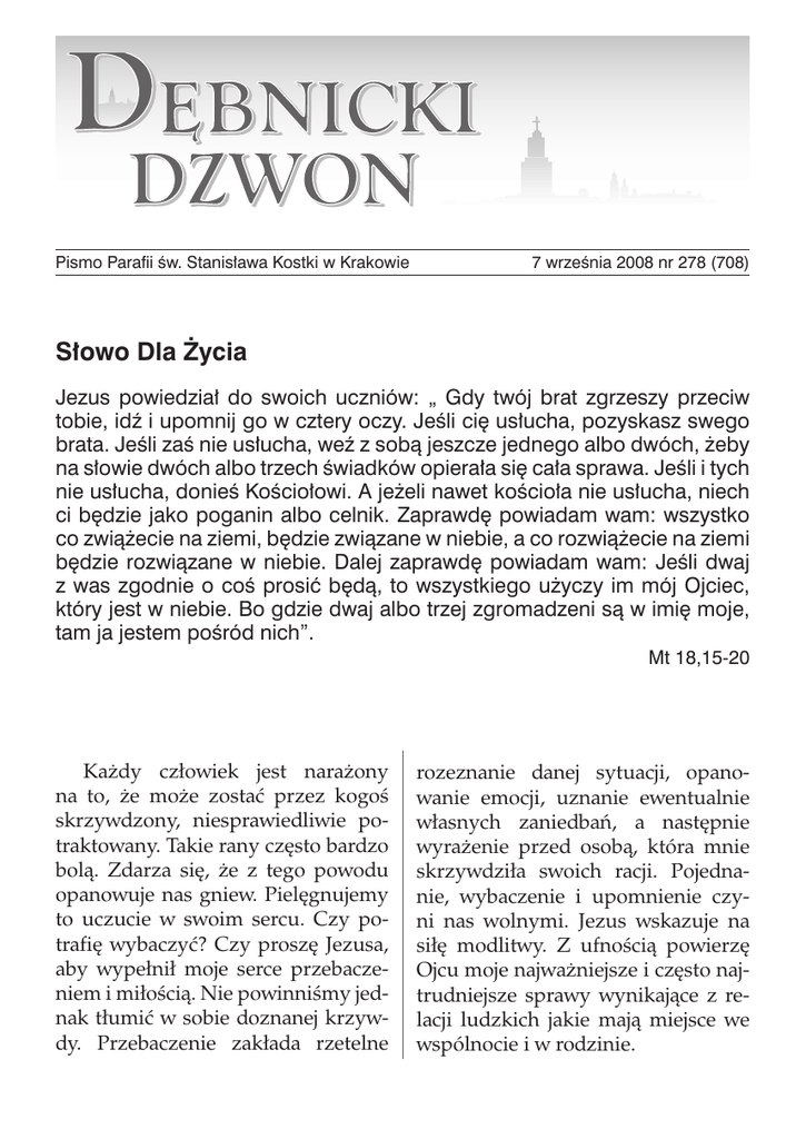 Pismo Parafii św. Stanisława Kostki w Krakowie 7 września 2008 nr 278 (708) Słowo Dla Życia Jezus powiedział do swoich uczniów: „ Gdy twój brat zgrzeszy przeciw tobie, idź i upomnij go w cztery oczy. Jeśli cię usłucha, pozyskasz swego brata. Jeśli zaś nie usłucha, weź z sobą jeszcze jednego albo dwóch, żeby na słowie dwóch albo trzech świadków opierała się cała sprawa. Jeśli i tych nie usłucha, donieś Kościołowi. A jeżeli nawet kościoła nie usłucha, niech ci będzie jako poganin albo celnik. Zaprawdę powiadam wam: wszystko co zwiążecie na ziemi, będzie związane w niebie, a co rozwiążecie na ziemi będzie rozwiązane w niebie. Dalej zaprawdę powiadam wam: Jeśli dwaj z was zgodnie o coś prosić będą, to wszystkiego użyczy im mój Ojciec, który jest w niebie. Bo gdzie dwaj albo trzej zgromadzeni są w imię moje, tam ja jestem pośród nich”. Mt 18,15-20 Każdy człowiek jest narażony na to, że może zostać przez kogoś skrzywdzony, niesprawiedliwie potraktowany. Takie rany często bardzo bolą. Zdarza się, że z tego powodu opanowuje nas gniew. Pielęgnujemy to uczucie w swoim sercu. Czy potrafię wybaczyć? Czy proszę Jezusa, aby wypełnił moje serce przebaczeniem i miłością. Nie powinniśmy jednak tłumić w sobie doznanej krzywdy. Przebaczenie zakłada rzetelne rozeznanie danej sytuacji, opanowanie emocji, uznanie ewentualnie własnych zaniedbań, a następnie wyrażenie przed osobą, która mnie skrzywdziła swoich racji. Pojednanie, wybaczenie i upomnienie czyni nas wolnymi. Jezus wskazuje na siłę modlitwy. Z ufnością powierzę Ojcu moje najważniejsze i często najtrudniejsze sprawy wynikające z relacji ludzkich jakie mają miejsce we wspólnocie i w rodzinie. DEKRET ARCYBISKUPA METROPOLITY KRAKOWSKIEGO O MOŻLIWOŚCI UZYSKANIA ŁASKI ODPUSTU ZUPEŁNEGO W ROKU ŚW. PAWŁA W ARCHIDIECEZJI KRAKOWSKIEJ Św. Paweł Apostoł należy do najwybitniejszych świętych Kościoła. Jest w liturgii czczony wraz ze św. Piotrem, gdyż od początku tradycja chrześcijańska uważała obydwu Apostołów za nieodłącznych, chociaż każdy miał inną misję do spełnienia: „Piotr jako pierwszy wyznał wiarę w Chrystusa, Paweł otrzymał w darze możliwość pogłębienia jej bogactwa. Piotr założył pierwszą wspólnotę chrześcijan, pochodzących z narodu wybranego, Paweł został apostołem pogan. Poprzez odmienne charyzmaty zabiegali o tę samą sprawę: budowę Kościoła Chrystusowego” – mówił Ojciec Święty Benedykt XVI zapowiadając Rok św. Pawła, w związku z dwutysięczną rocznicą narodzin Apostoła Narodów. Rok ten będzie trwał od 29 czerwca 2008 roku do 29 czerwca 2009 roku. Papież zaprasza członków Kościoła, aby poznawali niezwykłą postać św. Pawła i jego naukę oraz rozpalali w sobie gorliwość w głoszeniu Ewangelii światu. 2 W tym roku, zgodnie z dekretem Penitencjarii Apostolskiej z dnia 10 maja 2008 r., istnieje dodatkowa możliwość zyskiwania odpustu zupełnego. Wierni mogą uzyskać tę łaskę w następujących okolicznościach i miejscach: I. Nawiedzenie Bazyliki św. Pawła w Rzymie W ciągu całego roku św. Pawła każdy wierny, który oczyszczony w sakramencie pokuty przyjął Komunię św., może uzyskać odpust zupełny (jeden raz w ciągu dnia), który można ofiarować za żyjących i zmarłych, za nabożne nawiedzenie Papieskiej Bazyliki św. Pawła za Murami w Rzymie i modlitwę w intencjach Ojca św. Wierni powinni pobożnie odmówić dowolną modlitwę przed Najświętszym Sakramentem, a następnie przy ołtarzu konfesji nad grobem Apostoła Narodów odmówić Ojcze Nasz i Credo, oraz wezwanie ku czci Matki Bożej i św. Pawła. Ten akt pobożności jest ściśle związany ze wspomnieniem także św. Piotra, Księcia Apostołów. II. Udział w nabożeństwie w dniu inauguracji lub zakończenia Roku św. Pawła Każdy wierny, który spełnił zwyczajne warunki (spowiedź sakramentalna, Komunia eucharystyczna i modlitwa w intencjach Ojca św.) i wykluczył wszelkie przywiązanie do grzechu, może uzyskać odpust zupełny we wszystkich kościołach i kaplicach za uczestniczenie w celebracji liturgicznej lub innym nabożeństwie sprawowanym w pierwszym dniu Roku Pawłowego (29 czerwca 2008r.) oraz w dniu jego zakończenia (29 czerwca 2009r.). III. Udział w nabożeństwie sprawowanym w określonych dniach w wybranych kościołach Archidiecezji Krakowskiej Po spełnieniu wymogów podanych w p. II, odpust zupełny można uzyskać uczestnicząc w celebracji liturgicznej lub innym nabożeństwie sprawowanym ku czci Apostoła Narodów 29. dnia każdego miesiąca Roku św. Pawła (oraz 28 lutego 2009r.) w następujących świątyniach Archidiecezji Krakowskiej: • Kościół p.w. św. Apostołów Piotra i Pawła w Krakowie przy ul. Grodzkiej, • Kościół p.w. Nawrócenia św. Pawła Apostoła w Krakowie przy ul. Stradomskiej (Księża Misjonarze), • Kościół p.w. św. Apostołów Piotra i Pawła w Tyńcu (OO. Benedyktyni), • Bazylika Matki Boskiej Anielskiej w Kalwarii Zebrzydowskiej (OO. Bernardyni), • Kościół p.w. św. Apostołów Piotra i Pawła w Trzebini, • Kościół p.w. NMP Niepokalanej Objawiającej Cudowny Medalik w Zakopanem – Olczy (Księża Misjonarze). IV. Duchowe uczestnictwo chorych w nabożeństwie ku czci św. Pawła Odpust zupełny w Roku św. Pawła mogą również uzyskać osoby, które z powodu choroby lub innej uzasadnionej i poważnej przyczyny nie są w stanie fizycznie dopełnić warunków wyżej wskazanych. Muszą postanowić, że spełnią je, gdy tylko będzie to możliwe i włączyć się duchowo w któreś z jubileuszowych nabożeństw ku czci św. Pawła, wykluczywszy wszelkie przywiązanie do grzechu, ofiarując Bogu swe modlitwy i cierpienia w intencji jedności chrześcijan. Kraków,10 czerwca 2008 r. Arcybiskup Metropolita Krakowski 3 NOWI KAPŁANI W NASZEJ PARAFII Ks. Jan Dubas urodzony 28.09.1965 w Staniątkach 22.08.198