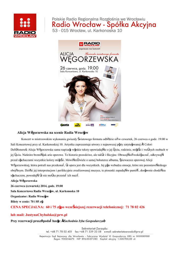 Alicja Węgorzewska na scenie Radia Wrocław Koncert w mistrzowskim wykonaniu gwiazdy światowego formatu odbędzie się w czwartek, 26 czerwca o godz. 19:00 w Sali Koncertowej przy ul. Karkonoskiej 10. Artystka zaprezentuje utwory z najnowszej płyty zatytułowanej „I Colori Dell’Amore”. Alicja Węgorzewska sama napisała włoskie teksty opowiadające o jej życiu, rodzinie, miłości i ważnych osobach w jej życiu. Niektóre brzmią jak arie operowe. To historie prawdziwe, ale także i fikcyjne. Obracają się wokół uczuć, odkrywają przed słuchaczami wszystkie kolory miłości. Mówią też wiele o samej bohaterce albumu, śpiewaczce operowej Alicji Węgorzewskiej, która potrafi nas przekonać, że opera jest dla wszystkich. Jej głos wzbudza emocje, które nie pozostawią nikogo obojętnym. Dzięki jej interpretacjom i perfekcyjnie zrealizowanej muzyce, te piosenki zapadają w pamięć, dosłownie chodzą za słuchaczem, powodują, że nie można przestać ich nucić. Alicja Węgorzewska 26 czerwca (czwartek) 2014, godz. 19:00 Sala Koncertowa Radia Wrocław, ul. Karkonoska 10 Organizator: Radio Wrocław Bilety w cenie: 70 i 85 zł CENA SPECJALNA: 60 i 75 zł po wcześniejszej rezerwacji telefonicznej: 71 78 02 426 lub mail: [email protected] Przy rezerwacji proszę podać hasło: „Zachodnia Izba Gospodarcza”