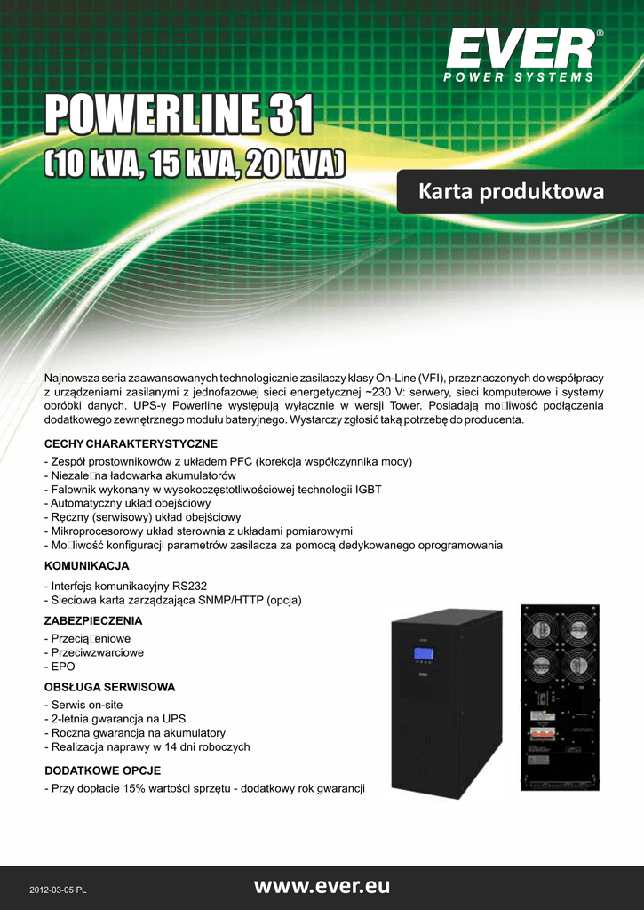 POWERLINE 31 (10 kVA, 15 kVA, 20 kVA) Karta produktowa Najnowsza seria zaawansowanych technologicznie zasilaczy klasy On-Line (VFI), przeznaczonych do współpracy z urządzeniami zasilanymi z jednofazowej sieci energetycznej ~230 V: serwery, sieci komputerowe i systemy obróbki danych. UPS-y Powerline występują wyłącznie w wersji Tower. Posiadają możliwość podłączenia dodatkowego zewnętrznego modułu bateryjnego. Wystarczy zgłosić taką potrzebę do producenta. CECHY CHARAKTERYSTYCZNE - Zespół prostownikowów z układem PFC (korekcja współczynnika mocy) - Niezależna ładowarka akumulatorów - Falownik wykonany w wysokoczęstotliwościowej technologii IGBT - Automatyczny układ obejściowy - Ręczny (serwisowy) układ obejściowy - Mikroprocesorowy układ sterownia z układami pomiarowymi - Możliwość konfiguracji parametrów zasilacza za pomocą dedykowanego oprogramowania KOMUNIKACJA - Interfejs komunikacyjny RS232 - Sieciowa karta zarządzająca SNMP/HTTP (opcja) ZABEZPIECZENIA - Przeciążeniowe - Przeciwzwarciowe - EPO OBSŁUGA SERWISOWA - Serwis on-site - 2-letnia gwarancja na UPS - Roczna gwarancja na akumulatory - Realizacja naprawy w 14 dni roboczych DODATKOWE OPCJE - Przy dopłacie 15% wartości sprzętu - dodatkowy rok gwarancji 2012-03-05 PL www.ever.eu POWERLINE 31 (10 kVA, 15 kVA, 20 kVA) PARAMETRY TECHNICZNE PARAMETR / MODEL Moc wyjściowa 1) Środowisko pracy POWERLINE 31 Model 10k Model 15k Model 20k 10 kVA / 7 kW 15 kVA / 7kW 20 kVA / 7kW Pomieszczenia biurowe lub przemysłowe o niskim poziomie zanieczyszczeń Temperatura pracy 2) 0 ÷ + 40 C Temperatura przechowywania 0 ÷ + 40 0C 0 Wilgotność względna w czasie pracy < 95 % (bez kondensacji) Wilgotność względna w czasie przechowywania < 95 % (bez kondensacji) Wysokość n.p.m. 3) Do 1000 m Maksymalna długość przewodów wyjściowych < 10 m PRACA SIECIOWA Napięcie wejściowe międzyfazowe ~304 V ÷ 478 V ± 2 % Częstotliwość napięcia wejściowego 46 - 54 Hz ± 1 Hz Napięcie wyjściowe ~230 V ± 1 % Progi przełączenia: sieć - UPS ~304 V / ~478 V ± 2 % Kształt napięcia wyjściowego Sinus Czas przełączenia na UPS 0 PRACA REZERWOWA (BATERYJNA) Napięcie wyjściowe (wartość skuteczna) ~230 V ± 1 % Kształt napięcia wyjściowego Sinus Uwaga! Producent zastrzega sobie prawo do zmiany w/w parametrów bez uprzedniego powiadamiania. Progi przełączania: UPS - sieć ~311 V / ~450 V ± 2 % Częstotliwość napięcia wyjściowego 50 Hz ± 1 Hz Filtracja napięcia wyjściowego LC Zabezpieczenie przeciwzwarciowe Elektroniczne Zabezpieczenie przeciążeniowe Elektroniczne Czas powrotu na pracę sieciową 0 ms Czas podtrzymania z baterii wewn. zasilacza (100 % / 80 % / 50 % Pmax) 12 / 15 / 34 min * 25 / 32 / 65 min ** 18 / 23 / 48 min *** Moduły dodatkowe 7 Ah 40 Ah 40 Ah Maksymalny czas ładowania 1 modułu (po rozładowaniu mocą 80 % Pmax) <2h <8h <8h PARAMETRY MECHANICZNE 717 x 260 x 570 Wymiary - (szer. x wys x gł.) Masa zasilacza 39 kg 55 kg 55 kg Masa modułu bateryjnego [kg] 133 kg 321 kg 321 kg WYPOSAŻENIE Gniazda wyjściowe Listwa zasilająca, terminale śrubowe Sygnalizacja Bezpiecznik Interfejs komunikacyjny Akustyczno-diodowa 3 x automatyczny D 50 A -zabezpieczenie od strony zasilania 3 x automatyczny D 100 A -zabezpieczenie od strony zasilania 3 x automatyczny D 100 A -zabezpieczenie od strony zasilania RS 232, sieciowa karta zarządzająca SNMP/HTTP-opcja * Czas dla przykładowego 1 modułu 2 x 20 x 7 Ah. Istnieje możliwość podłączenia innych dedykowanych modułów ** Czas dla przykładowego 1 modułu 1 x 20 x 40 Ah. Istnieje możliwość podłączenia innych dedykowanych modułów *** Czas dla przykładowego 1 modułu 1 x 20 x 40 Ah. Istnieje możliwość podłączenia innych dedykowanych modułów 1) Dla normalnej pracy zasilacza obciążenie dołączone na jego wyjście nie powinno przekraczać 80% wartości podanej w tabeli. Zapas mocy jest niezbędny dla zachowania ciągłości pracy dołączanych urządzeń w przypadku chwilowych skoków prądu obciążenia. 2) Stałe narażenie zasilacza na działanie temperatury otoczenia powyżej +25°C powoduje obniżenie żywotności baterii. 3) Wraz ze wzrostem wysokości nad poziomem morza powyżej podanego limitu obniża się dopuszczalna moc obciążenia zasilacza. 2012-03-05 PL www.ever.eu POWERLINE 31 (10 kVA, 15 kVA, 20 kVA) WYTYCZNE INSTALACYJNE TYP / PARAMETRY Moc wyjściowa POWERLINE 31 Model 10 k Model 15 k Model 20 k 10 kVA / 7 kW 15 kVA / 10,5 kW 20 kVA / 14 kW Parametry zasilania Topologia instalacji zasilającej 3P5W Znamionowe napięcie wejściowe ~400 V Znamionowy prąd wejściowy 9A Maksymalny prąd wejściowy 47 A Znamionowa częstotliwość wejściowa Uwaga! Producent zastrzega sobie prawo do zmiany w/w parametrów bez uprzedniego powiadamiania. Zabezpieczenia linii 16 A 69 A 90 A 50 Hz > 90 % Sprawność Minimalny przekrój kabli 12 A 2 10 mm 4 x 50 A (chk C) 16 mm2 25 mm2 4 x 80 A (chk C) 4 x 100 A (chk C) Parametry wyjściowe Topologia instalacji wyjściowej 1P3W Znamionowe napięcie wyjściowe 230 V Znamionowy prąd wyjściowy Maksymalny prąd wyjściowy Minimalny przekrój kabli Zabezpieczenia linii 31 A 46 A 43 A 65 A 2 61 A 86 A 2 10 mm 16 mm 25 mm2 2 x 50 A (chk B) 2 x 80 A (chk B) 2 x 100 A (chk B) Parametry środowiskowe Ilość wydzielanego ciepła dla nominalnych warunków pracy 2400 BTU 3600 BTU Temperatura pracy 0 - 400C Temperatura przechowywania 0 - 400C Wilgotność 3600 BTU < 95 % Do 1000 m Wysokość n.p.m. Parametry mechaniczne Wymiary (szer. x gł. x wys) Waga 260 x 570 x 717 mm 55 kg 39 kg Front: > 200 mm Boki: > 100 mm Tył: > 300 mm Dystans eksploatacyjny MONTAŻ ZASILACZA Przy wyborze miejsca instalacji, należy wziąć pod uwagę masę urządzenia. Zasilacz powinien być używany tylko w pomieszczeniach, w których zapylenie, temperatura i wilgotność są zgodne ze specyfikacją urządzenia. Dla prawidłowej pracy zasilacza muszą być zapewnione odpowiednie warunki chłodzenia