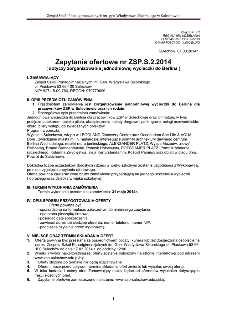 Zespół Szkół Ponadgimnazjalnych im. gen. Władysława Sikorskiego w Sulechowie Załącznik nr 2 REGULAMIN UDZIELANIA ZAMÓWIEŃ PUBLICZNYCH O WARTOŚCI DO 14.000 EURO Sulechów, 07.03.2014r.. Zapytanie ofertowe nr ZSP.S.2.2014 ( dotyczy zorganizowania jednodniowej wycieczki do Berlina ) I. ZAMAWIAJĄCY Zespół Szkół Ponadgimnazjalnych im. Gen. Władysława Sikorskiego ul. Piaskowa 53 66-100 Sulechów NIP: 927-15-09-766, REGON: 970779699 II. OPIS PRZEDMIOTU ZAMÓWIENIA 1. Przedmiotem zamówienia jest zorganizowanie jednodniowej wycieczki do Berlina dla pracowników ZSP w Sulechowie oraz ich rodzin. 2. Szczegółowy opis przedmiotu zamówienia: Jednodniowa wycieczka do Berlina dla pracowników ZSP w Sulechowie oraz ich rodzin, w tym: przejazd autokarem, opieka pilota, ubezpieczenie, opłaty drogowe i parkingowe, usługi przewodnickie, obiad, bilety wstępu do zwiedzanych obiektów. Program wycieczki: Wyjazd z Sulechowa, wizyta w LEGOLAND Discovery Centre oraz Oceanarium See Life & AQUA Dom , zwiedzanie miasta m. in. najbardziej interesujące pomniki architektury dawnego centrum Berlina Wschodniego, resztki muru berlińskiego, ALEKSANDER PLATZ, Wyspa Muzeów, „nowy” Reichstag, Brama Brandenburska, Pomnik Holocaustu, POTSDAMER PLATZ, Pomnik żołnierza radzieckiego, Kolumna Zwycięstwa, aleja Kurfurstendamm, Kościół Pamięci oraz obiad w ciągu dnia. Powrót do Sulechowa. Dokładna liczba uczestników dorosłych i dzieci w wieku szkolnym zostanie uzgodniona z Wykonawcą, po rozstrzygnięciu zapytania ofertowego. Oferta powinna zawierać cenę brutto zamówienie przypadającą na jednego uczestnika wycieczki ( dorosłego oraz dziecka w wieku szkolnym). III. TERMIN WYKONANIA ZAMÓWIENIA Termin wykonania przedmiotu zamówienia: 31 maja 2014r. IV. OPIS SPOSBU PRZYGOTOWANIA OFERTY Oferta powinna być: - sporządzona na formularzu załączonym do niniejszego zapytania - opatrzona pieczątką firmową, - posiadać datę sporządzenia, - zawierać adres lub siedzibę oferenta, numer telefonu, numer NIP, - podpisana czytelnie przez wykonawcę. V. MIEJSCE ORAZ TERMIN SKŁADANIA OFERT 1. Oferta powinna być przesłana za pośrednictwem poczty, kuriera lub też dostarczona osobiście na adres: Zespołu Szkół Ponadgimnazjalnych im. Gen. Władysława Sikorskiego ul. Piaskowa 53 66100 Sulechów do dnia 17.03.2014 r. do godziny 12:00. 2. Wyniki i wybór najkorzystniejszej oferty zostanie ogłoszony na stronie internetowej pod adresem www.zsp-sulechow.edu.pl/bip 3. Oferty złożone po terminie nie będą rozpatrywane 4. Oferent może przed upływem terminu składania ofert zmienić lub wycofać swoją ofertę. 5. W toku badania i oceny ofert Zamawiający może żądać od oferentów wyjaśnień dotyczących treści złożonych ofert. 6. Zapytanie ofertowe zamieszczono na stronie: www.zsp-sulechow.edu.pl/bip 1 Zespół Szkół Ponadgimnazjalnych im. gen. Władysława Sikorskiego w Sulechowie VI. OCENA OFERT Zamawiający dokona oceny ważnych ofert na podstawie następujących kryteriów: 1 – 100% cena brutto VII. INFORMACJE DOTYCZĄCE WYBORU NAJKORZYSTNIEJSZEJ OFERTY O wyborze najkorzystniejszej oferty Zamawiający zawiadomi oferentów za pośrednictwem strony internetowej znajdującej się pod adresem www. zsp-sulechow.edu.pl/bip VIII. DODATKOWE INFORMACJE Dodatkowych informacji udzielają: Agnieszka Nowak i Małgorzata Nocuń pod numerem telefonu 68 457 5679 oraz adresem email: [email protected] IX. ZAŁĄCZNIKI Wzór formularza ofertowego. 2 Zespół Szkół Ponadgimnazjalnych im. gen. Władysława Sikorskiego w Sulechowie Załącznik nr 3 REGULAMIN UDZIELANIA ZAMÓWIEŃ PUBLICZNYCH O WARTOŚCI DO 14.000 EURO OFERTA W odpowiedzi na zapytanie ofertowe z dnia ………… dotyczące zamówienia publicznego realizowanego na podstawie art. 4 ust. 8 ustawy z dnia 29 stycznia 2004 r. - Prawo zamówień publicznych pn. ………………………………………………………………………………………………….. (wpisać nazwę nadaną zamówieniu) niniejszym składamy ofertę następującej treści: 1. Oferujemy wykonanie zamówienia za cenę netto …………….. zł obowiązujący podatek VAT …………. % ………………… zł cena brutto ……………….. zł (słownie …………………………………………………………………………………) 2. Przyjmujemy do realizacji postawione przez zamawiającego w zapytaniu ofertowym warunki. 3. Oświadczamy, iż jesteśmy związani niniejszą ofertą przez ……………….. dni. Załączniki: 1. …………………… 2. …………………... ……………………………………………… (Podpis(y) i pieczęć imienna osób uprawnionych do reprezentowania Wykonawcy) 3