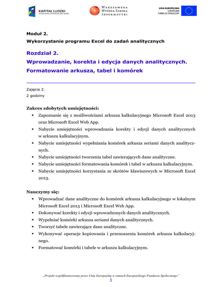 Moduł 2. Wykorzystanie programu Excel do zadań analitycznych Rozdział 2. Wprowadzanie, korekta i edycja danych analitycznych. Formatowanie arkusza, tabel i komórek Zajęcia 2. 2 godziny Zakres zdobytych umiejętności: Zapoznanie się z możliwościami arkusza kalkulacyjnego Microsoft Excel 2013 oraz Microsoft Excel Web App. Nabycie umiejętności wprowadzania korekty i edycji danych analitycznych w arkuszu kalkulacyjnym. Nabycie umiejętności wypełniania komórek arkusza seriami danych analitycznych. Nabycie umiejętności tworzenia tabel zawierających dane analityczne. Nabycie umiejętności formatowania komórek i tabel w arkuszu kalkulacyjnym. Nabycie umiejętności korzystania ze skrótów klawiszowych w Microsoft Excel 2013. Nauczymy się: Wprowadzać dane analityczne do komórek arkusza kalkulacyjnego w lokalnym Microsoft Excel 2013 i Microsoft Excel Web App. Dokonywać korekty i edycji wprowadzonych danych analitycznych. Wypełniać komórki arkusza seriami danych analitycznych. Tworzyć tabele zawierające dane analityczne. Wykonywać operacje kopiowania i przenoszenia komórek arkusza kalkulacyjnego. Formatować komórki i tabele w arkuszu kalkulacyjnym. „Projekt współfinansowany przez Unię Europejską w ramach Europejskiego Funduszu Społecznego” 1 Korzystać ze skrótów klawiszowych w arkuszu kalkulacyjnym Microsoft Excel 2013. Praktyczne zastosowanie zdobytej wiedzy Zanim zaczniemy wykonywać obliczenia i analizować dane w arkuszu kalkulacyjnym, najpierw należy je tam umieścić. Wiele z nich to dane seryjne − kolejne liczby, kolejne daty − zamiast wprowadzać je pojedynczo, po ustaleniu reguł zmiany wartości (np. przyrastają, co 1 albo co 3, daty co 30 dni czy co miesiąc itd.) można wypełnić komórki arkusza serią danych. Kiedy dane zostaną wprowadzone do arkusza, często zachodzi potrzeba ich korekty. Może ona być wykonana na dwa sposoby: poprzez zastąpienie starej wartości nową lub przez edycję, stosowaną szczególnie w przypadku złożonych formuł. Omówienie zagadnienia Większość czynności edycji i formatowania danych w arkuszu kalkulacyjnym może być wykonana zarówno w lokalnie zainstalowanym Microsoft Excel 2013, jak i Microsoft Excel Web App (np. w bezpłatnym OneDrive). W przeglądarce internetowej nie są obsługiwane jedynie bardziej zaawansowane działania, które wymagają pracy tylko na lokalnie zainstalowanym Excelu (w alternatywnych arkuszach kalkulacyjnych, np. Calc LibreOffice, również można wykonać większość działań, istnieją jednak różnice w układzie menu, choć nie mniejsze niż pomiędzy wersjami Microsoft Excel 2003, 2007, 2010 i 2013). Na rysunku 1 przedstawiono fragmenty okien arkuszy kalkulacyjnych Microsoft Excel Web App i Microsoft Excel 2013 (zainstalowany lokalnie). „Projekt współfinansowany przez Unię Europejską w ramach Europejskiego Funduszu Społecznego” 2 Rysunek 1. Porównanie narzędzi Microsoft Excel Web App i Microsoft Excel 2013 zainstalowanych lokalnie Jeśli w Microsoft Excel Web App brak jakiegoś narzędzia, wciskając przycisk można wykonać zaawansowaną czynność w Microsoft Excel 2013 (o ile jest lokalnie zainstalowany). Innym powodem wykorzystania lokalnie zainstalowanego arkusza kalkulacyjnego jest słabe łącze do Internetu. Ale najważniejszym motywem jest obawa przed powierzeniem cennych danych zewnętrznemu dostawcy. Jest to szczególnie istotne, gdy przetwarzanie i ochronę tych danych regulują odpowiednie przepisy (istnieje możliwość zainstalowania Microsoft Office Web App na własnym serwerze, co w przypadku małej firmy często nie ma uzasadnienia ekonomicznego). Większość czynności w arkuszach kalkulacyjnych realizuje się na wiele sposobów, więc będą omawiane tylko te najbardziej popularne lub, zdaniem autora, najłatwiejsze lub najwygodniejsze dla użytkownika. „Projekt współfinansowany przez Unię Europejską w ramach Europejskiego Funduszu Społecznego” 3 Do arkusza kalkulacyjnego dane wprowadzamy do wybranej, zaznaczonej komórki. Gdy zaczniemy pisać, zaznaczona komórka przechodzi w tryb wprowadzania danych (w komórce miga kursor w formie pionowej kreski). Umieszczanie danych kończymy zazwyczaj wciskając klawisz [ENTER], natomiast rezygnacja z wprowadzanych danych następuje przez wciśnięcie klawisza [ESC]. Po wpisaniu nowych danych, zmiany można również zaakceptować wciskając klawisz jednej z czterech strzałek. Kiedy w komórce znajdują się już dane i po jej zaznaczeniu zaczniemy wprowadzać nowe, po akceptacji zmian stare dane zostaną usunięte i zastąpione nowymi, natomiast po rezygnacji − w komórce pozostaną poprzednie dane. W sytuacji, kiedy w komórce istnieją dane, które chcielibyśmy poprawić, a nie zastąpić nowymi (np. jest to złożona formuła), można wyedytować zawartość komórki wciskając klawisz [F2] (aby edytować w komórce) lub klikając w pasek formuły, aby edytować w pasku formuły. Przy większej liczbie danych w komórce zazwyczaj edycja w pasku formuły, znajdującym się nad komórkami arkusza, jest wygodniejsza. Dla zaznaczonej komórki jej zawartość jest wyświetlana w pasku formuły, za wyjątkiem sytuacji, gdy w komórce wprowadzona jest formuła do wykonywania obliczeń − wtedy w komórce wyświetlany jest wynik działania formuły, a na pasku formuły widać kod formuły. Edycję komórki kończymy wciskając klawisz [ENTER]. Rysunek 2 przedstawia przykład korekty zawartości komórki o adresie A1 w pasku formuły. UWAGA: W trybie edycji komórki (w tym na pasku formuły) strzałki pozwalają poruszać się po edytowanej zawartości, a nie przechodzić do innej komórki jak w trybie wprowadzania. „Projekt współfinansowany przez Unię Europejską w ramach Europejskiego Funduszu Społecznego” 4 Rysunek 2. Poprawianie w pasku formuły tekstu, znajdującego się w komórce A1 Po akceptacji wprowadzonych lub edytowanych danych, można je wycofać wciskając w 