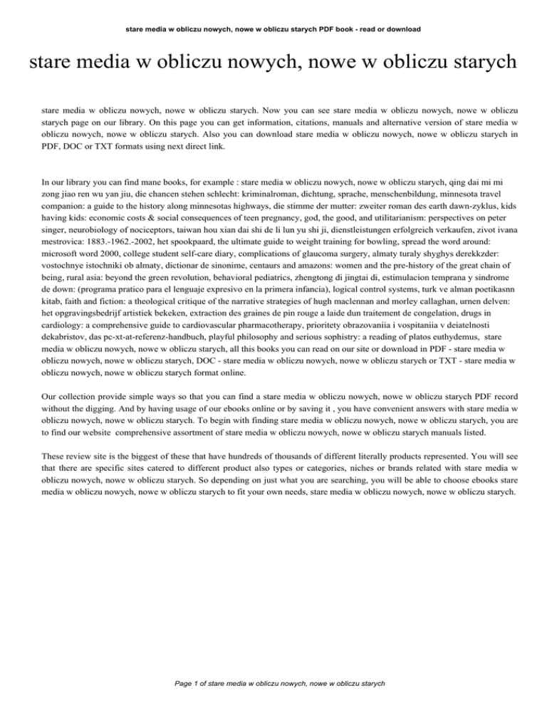 stare media w obliczu nowych, nowe w obliczu starych PDF book - read or download stare media w obliczu nowych, nowe w obliczu starych stare media w obliczu nowych, nowe w obliczu starych. Now you can see stare media w obliczu nowych, nowe w obliczu starych page on our library. On this page you can get information, citations, manuals and alternative version of stare media w obliczu nowych, nowe w obliczu starych. Also you can download stare media w obliczu nowych, nowe w obliczu starych in PDF, DOC or TXT formats using next direct link. In our library you can find mane books, for example : stare media w obliczu nowych, nowe w obliczu starych, qing dai mi mi zong jiao ren wu yan jiu, die chancen stehen schlecht: kriminalroman, dichtung, sprache, menschenbildung, minnesota travel companion: a guide to the history along minnesotas highways, die stimme der mutter: zweiter roman des earth dawn-zyklus, kids having kids: economic costs & social consequences of teen pregnancy, god, the good, and utilitarianism: perspectives on peter singer, neurobiology of nociceptors, taiwan hou xian dai shi de li lun yu shi ji, dienstleistungen erfolgreich verkaufen, zivot ivana mestrovica: 1883.-1962.-2002, het spookpaard, the ultimate guide to weight training for bowling, spread the word around: microsoft word 2000, college student self-care diary, complications of glaucoma surgery, almaty turaly shyghys derekkzder: vostochnye istochniki ob almaty, dictionar de sinonime, centaurs and amazons: women and the pre-history of the great chain of being, rural asia: beyond the green revolution, behavioral pediatrics, zhengtong di jingtai di, estimulacion temprana y sindrome de down: (programa pratico para el lenguaje expresivo en la primera infancia), logical control systems, turk ve alman poetikasnn kitab, faith and fiction: a theological critique of the narrative strategies of hugh maclennan and morley callaghan, urnen delven: het opgravingsbedrijf artistiek bekeken, extraction des graines de pin rouge a laide dun traitement de congelation, drugs in cardiology: a comprehensive guide to cardiovascular pharmacotherapy, prioritety obrazovaniia i vospitaniia v deiatelnosti dekabristov, das pc-xt-at-referenz-handbuch, playful philosophy and serious sophistry: a reading of platos euthydemus, stare media w obliczu nowych, nowe w obliczu starych, all this books you can read on our site or download in PDF - stare media w obliczu nowych, nowe w obliczu starych, DOC - stare media w obliczu nowych, nowe w obliczu starych or TXT - stare media w obliczu nowych, nowe w obliczu starych format online. Our collection provide simple ways so that you can find a stare media w obliczu nowych, nowe w obliczu starych PDF record without the digging. And by having usage of our ebooks online or by saving it , you have convenient answers with stare media w obliczu nowych, nowe w obliczu starych. To begin with finding stare media w obliczu nowych, nowe w obliczu starych, you are to find our website comprehensive assortment of stare media w obliczu nowych, nowe w obliczu starych manuals listed. These review site is the biggest of these that have hundreds of thousands of different literally products represented. You will see that there are specific sites catered to different product also types or categories, niches or brands related with stare media w obliczu nowych, nowe w obliczu starych. So depending on just what you are searching, you will be able to choose ebooks stare media w obliczu nowych, nowe w obliczu starych to fit your own needs, stare media w obliczu nowych, nowe w obliczu starych. Page 1 of stare media w obliczu nowych, nowe w obliczu starych