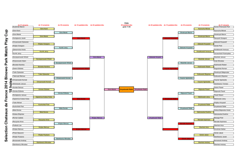 Selection Chateaux de France 2014 Binowo Park Match Play Cup 18 holes do 31 sierpnia Dudziński Marcin do 14 września do 30 września do 12 października FINAŁ 25 października godz 11:00 do 22 października do 22 października do 12 października do 30 września Góra Karol do 14 września Góra Karol Kaznocha Michał Góra Marek Strzelczyk Marcin Góra Marek Strzelczyk Marcin Góra Marek Strzelczyk Marcin Góra Marek Hordyjewicz Jacek Zalewski Krzysztof Raczycki Grzegorz Chrzanowski Sylwester Zalewski Krzysztof Wojtas Grzegorz Zalewski Krzysztof Górski Piotr Wojtas Grzegorz Kumik Jerzy Zalewski Krzysztof Zatwarnicka Aneta Kwiatkowski Ireneusz Kumik Jerzy Kwiatkowski Ireneusz Szczeciński Przemysław Kumik Jerzy Góra Marek Szczepanowski Witold Kłosiński Janusz Zalewski Krzystof Kłosiński Janusz Szczepanowski Witold Grab Mirosław Wojnarowski Adam Kłosiński Janusz Szczepanowski Witold Brzoska Karolina Kiedrowski Robert Brzoska Karolina Kiedrowski Robert Zwierz Elżbieta Szczepanowski Witold Rogoziński Roman Cwynar Agnieszka Strzelczyk Małgorzata Tutko Sylwester Tutko Sylwester Estkowski Zbigniew Talerczyk Mariusz Estkowski Zbigniew Chrzanowski Konrad Cwynar Agnieszka Chrzanowski Konrad Cwynar Agnieszka Chrzanowski Konrad Cwynar Agnieszka Wiśniewski Janusz Stankiewicz Tomasz Zwierz Paweł Kuriata Dariusz Górska Elżbieta Góra Marek Zmysłowski Rafał Zmysłowski Rafał Majewski Paweł Górska Elżbieta Majewski Paweł Górska Elżbieta Majewski Paweł Hordyjewicz Janusz Piesik Robert Gąsienica-Ciułacz Kuba Maćkowski Jerzy Gąsienica-Ciułacz Kuba Zmysłowski Rafał Mida Dorota Maćkowski Jerzy Tutko Michał Wojtkun Krzystof Kuchciński Piotr Zmysłowski Rafał Kuchciński Piotr Zmysłowski Rafał Zmysłowski Rafał Mida Dorota Mida Dorota Aloksa-Majewska Aneta Mida Dorota Zakrzewska Ewelina Kolasa Zbigniew Zakrzewska Ewelina Roman Izabela Wojtas Mariusz Zmysłowski Rafał Biesaga Piotr Raczycka Anna Mendak Kazimierz Raczycka Anna Mendak Kazimierz Wojtas Mariusz Mendak Kazimierz Śliwiński Artur Podlecki Jan Śliwiński Artur Wojtas Mariusz Wojtas Mariusz Smoliński Stefan Wojtas Mariusz Piński Sławomir Górski Jakub Górski Jakub Wojdyr Krystyna Wojdyr Krystyna Stankiewicz Jacek Stankiewicz Mirosław Górski Jakub Brzozowski Andrzej Borowiecki Andrzej Stankiewicz Mirosław Stankiewicz Mirosław do 31 sierpnia Korwin-Piotrowski Piotr Kaznocha Michał Śliwiński Andrzej Śliwiński Andrzej