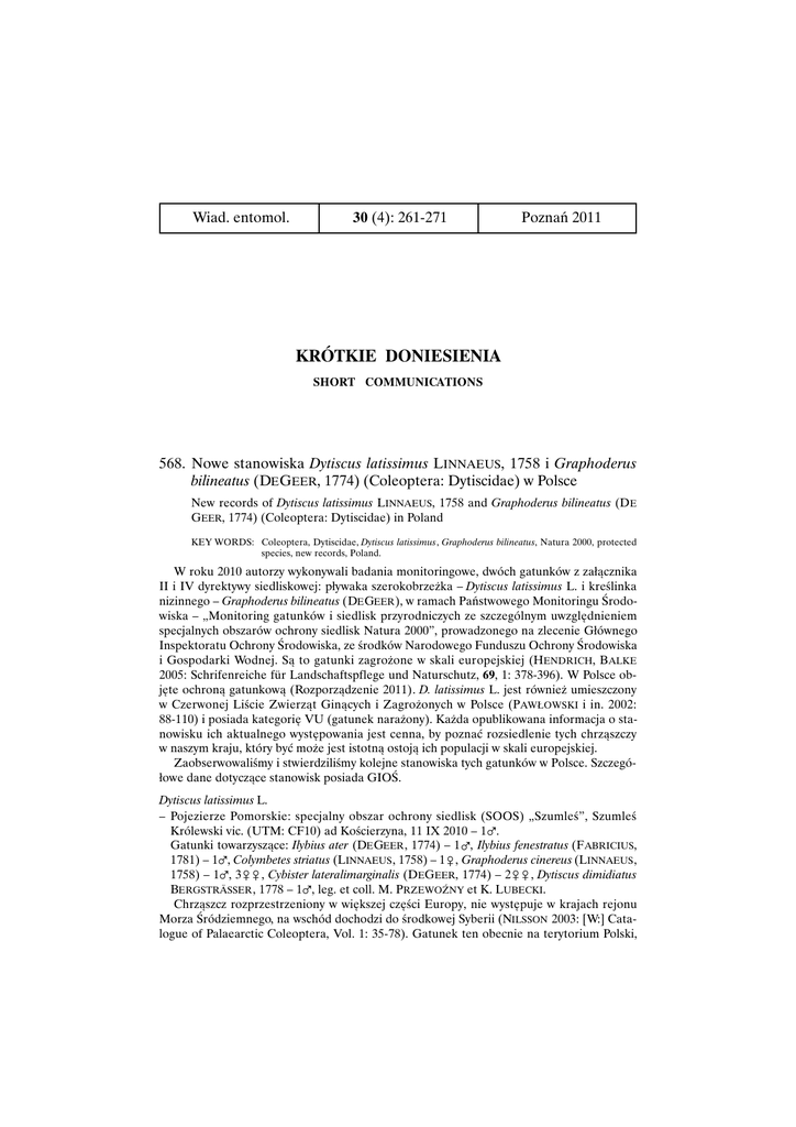 Wiad. entomol. 30 (4): 261-271 Poznań 2011 KRÓTKIE DONIESIENIA SHORT COMMUNICATIONS 568. Nowe stanowiska Dytiscus latissimus L INNAEUS, 1758 i Graphoderus bilineatus (DE GEER, 1774) (Coleoptera: Dytiscidae) w Polsce New records of Dytiscus latissimus LINNAEUS, 1758 and Graphoderus bilineatus (DE GEER, 1774) (Coleoptera: Dytiscidae) in Poland KEY WORDS: Coleoptera, Dytiscidae, Dytiscus latissimus, Graphoderus bilineatus, Natura 2000, protected species, new records, Poland. W roku 2010 autorzy wykonywali badania monitoringowe, dwóch gatunków z załącznika II i IV dyrektywy siedliskowej: pływaka szerokobrzeżka – Dytiscus latissimus L. i kreślinka nizinnego – Graphoderus bilineatus (DE GEER ), w ramach Państwowego Monitoringu Środowiska – „Monitoring gatunków i siedlisk przyrodniczych ze szczególnym uwzględnieniem specjalnych obszarów ochrony siedlisk Natura 2000”, prowadzonego na zlecenie Głównego Inspektoratu Ochrony Środowiska, ze środków Narodowego Funduszu Ochrony Środowiska i Gospodarki Wodnej. Są to gatunki zagrożone w skali europejskiej (HENDRICH, B ALKE 2005: Schrifenreiche für Landschaftspflege und Naturschutz, 69, 1: 378-396). W Polsce objęte ochroną gatunkową (Rozporządzenie 2011). D. latissimus L. jest również umieszczony w Czerwonej Liście Zwierząt Ginących i Zagrożonych w Polsce (PAWŁOWSKI i in. 2002: 88-110) i posiada kategorię VU (gatunek narażony). Każda opublikowana informacja o stanowisku ich aktualnego występowania jest cenna, by poznać rozsiedlenie tych chrząszczy w naszym kraju, który być może jest istotną ostoją ich populacji w skali europejskiej. Zaobserwowaliśmy i stwierdziliśmy kolejne stanowiska tych gatunków w Polsce. Szczegółowe dane dotyczące stanowisk posiada GIOŚ. Dytiscus latissimus L. – Pojezierze Pomorskie: specjalny obszar ochrony siedlisk (SOOS) „Szumleś”, Szumleś Królewski vic. (UTM: CF10) ad Kościerzyna, 11 IX 2010 – 1%. Gatunki towarzyszące: Ilybius ater (DE GEER , 1774) – 1%, Ilybius fenestratus (F ABRICIUS, 1781) – 1%, Colymbetes striatus (LINNAEUS , 1758) – 1&, Graphoderus cinereus (LINNAEUS , 1758) – 1%, 3&& , Cybister lateralimarginalis (DEGEER, 1774) – 2&& , Dytiscus dimidiatus BERGSTRÄSSER , 1778 – 1%, leg. et coll. M. PRZEWOŹNY et K. LUBECKI. Chrząszcz rozprzestrzeniony w większej części Europy, nie występuje w krajach rejonu Morza Śródziemnego, na wschód dochodzi do środkowej Syberii (NILSSON 2003: [W:] Catalogue of Palaearctic Coleoptera, Vol. 1: 35-78). Gatunek ten obecnie na terytorium Polski, 262 KRÓTKIE DONIESIENIA jak również w całej Europie, znajduje się w bardzo dużym regresie. Stanowiska jego jeszcze 100 lat temu liczne, obecnie szybko znikają. Przyczyna tego zjawiska nie jest znana i wymaga dalszych badań, w szczególności w odniesieniu do jego biologii i wymagań siedliskowych. Wykazywany był z 11, a zatem prawie wszystkich niżowych krain Polski (BURAKOWSKI i in. 1976: Kat. Fauny Pol., XXIII, 4: 1-307). Współcześnie podany tylko z trzech stanowisk na Pojezierzu Pomorskim: Tucholski Park Krajobrazowy, Szumleś Królewski (K LUKOWSKA , TOŃCZYK 2002: [W]: Tucholski Park Krajobrazowy 1985–2000, stan poznania. Wydawnictwo Uniwersytetu Łódzkiego: 441-450; ZAREMBSKA , ZAREMBSKA 2009: Parki nar. Rez. Przyr., 28, 1: 69-74), dwóch na Nizinie Wielkopolsko-Kujawskiej: Jezioro Budzyńskie i Bujnów (CERBIN 1997: Wiad. entomol., 16 (2): 119; PRZEWOŹNY, LUBECKI 2004: Wiad. entomol., 23, 4: 215-220) oraz dwóch na Wyżynie Lubelskiej: Poleski Park Narodowy i Kozłowiecki Park Krajobrazowy (BUCZYŃSKI, PIOTROWSKI 2002: Parki nar. Rez. Przyr., 21, 2: 185-194; B UCZYŃSKI i in. 2007: Parki nar. Rez. Przyr., 26, 2: 93-111). Stanowisko odkryte przez autorów potwierdza utrzymywanie się omawianego gatunku w ostoi Natura 2000 „Szumleś”, gdzie chrząszcz ten został niedawno wykazany z innego zbiornika (ZAREMBSKA, ZAREMBSKA 2009: ibid.). Autorzy mieli też możliwość skontrolowania stanowiska na jeziorze Budzyńskim, lecz aktualnego występowania tego gatunku nie potwierdzono. Przez okres czasu od stwierdzenia D. latissimus L. (14 lat) warunki w tym jeziorze uległy pogorszeniu i bardzo prawdopodobne jest, że gatunek wyginął. Wydaje się że obszar Pojezierza Pomorskiego jest obecnie refugium dla tego chrząszcza na terenie kraju, gdyż z tej krainy jest on w ostatnich latach systematycznie potwierdzany. Graphoderus bilineatus (DEGEER ) – Pojezierze Pomorskie: SOOS „Szumleś”, Kamionki vic. (CF10) ad Kościerzyna, 11 IX 2010 – 2%%. Gatunki towarzyszące: I. fenestratus (FABR .) – 9%% 2&&, Platambus maculatus (LINNAEUS, 1758) – 1&, Acilius canaliculatus (NICOLAI, 1822) – 1&, Graphoderus cinereus (L.) – 1&, leg. et coll. M. PRZEWOŹNY et K. LUBECKI. – Pojezierze Pomorskie: SOOS „Dolina Piławy”, Nadarzyce vic. (WV92) ad Borne Sulinowo, stanowisko 1, 12 IX 2010 – 2%% 1&. Gatunki towarzyszące: Haliplus immaculatus GERHARDT, 1877 – 1 & , I. fenestratus (FABR.), 3%% 3&&, Hyphydrus ovatus (LINNAEUS, 1761) – 1 ex., leg. et coll. M. PRZEWOŹNY et K. LUBECKI. – Pojezierze Pomorskie: SOOS „Dolina Piławy”, Nadarzyce vic. (WV92) ad Borne Sulinowo, stanowisko 2, 12 IX 2010 – 1%. Gatunki towarzyszące: I. fenestratus (F ABR.) – 1% 1 F, Hydaticus transversalis (PONTOPPIDAN , 1763) – 1&, leg. et coll. M. PRZEWOŹNY. – Nizina Wielkopolsko Kujawska: Rogaliński Park Krajobrazowy, rez. „Krajkowo” (XT38) ad Mosina, 14 IX 2010 – 1%. Gatunki towarzyszące: I. fenestratus (FABR .) – 1 %, Colymbetes fuscus (LINNAEUS , 1758) – 1%, Hydroporus palustris (LINNAEUS, 1761) – 1 ex., Hygrotus versicolor (SCHALLER, 1783) – 1 ex., Hyphydrus ovatus (L.) – 1 ex., leg. et coll. M. PRZEWOŹNY. Chrząszcz rozprzestrzeniony w większej części Europy, nie występuje w krajach rejonu Morza Śródziemnego, na wschód dochodzi do środkowej Syberii (NILSSON 2003: ibid.). Gatunek w Polsce o wyraźnie nizinnym za