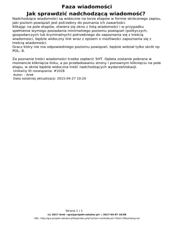 Faza wiadomości Jak sprawdzić nadchodzącą wiadomość? Nadchodzące wiadomości są widoczne na torze etapów w formie skróconego zapisu, jaki poziom powiązań jest potrzebny do poznania ich zawartości. Klikając na pole etapów, otwiera się okno z listą wiadomości i w przypadku spełnienia wymogu posiadania minimalnego poziomu powiązań (polityczych, gospodarczych lub kryminalnych) potrzebnego do zapoznania się z treścią wiadomosci, będzie widoczny link wraz z opisem o możliwości zapoznania się z treścią wiadomości. Gracz który nie ma odpowiedniego poziomu powiązań, będzie widział tylko skrót np POL: 8. Za poznanie treści wiadomości trzeba zapłacić 5HT. Opłata zostanie pobrana w momencie kliknięcia linku, a po przeładowaniu strony i ponownym kliknięciu na pole etapu, w oknie będzie widoczna treść nadchodzących wydarzeń/okazji. Unikalny ID rozwiązania: #1028 Autor: : Arek Data ostatniej aktualizacji: 2015-04-27 10:20 Strona 1 / 1 (c) 2017 Arek <[email protected]> | 2017-03-07 18:08 URL: http://gra.projekt-sekator.pl/faq/index.php?action=artikel&cat=7&id=29&artlang=pl Powered by TCPDF (www.tcpdf.org)