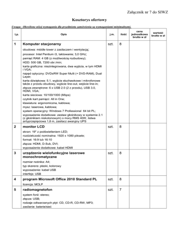 Załącznik nr 7 do SIWZ Kosztorys ofertowy Uwaga: Określone niżej wymagania dla przedmiotu zamówienia są wymaganiami minimalnymi. Lp. 1 Opis Komputer stacjonarny j.m. ilość szt. 8 szt. 8 szt. 8 szt. 8 szt. 7 obudowa: middle tower z zasilaczem i wentylacją; procesor: Intel Pentium i3, taktowanie; 3,0 GHz; pamięć RAM: 4 GB (z możliwością rozbudowy); HDD: 500 GB, 7200 obr./min; karta graficzna: niezintegrowana, dwa wyjścia, w tym HDMI i VGA; napęd optyczny: DVD±RW Super Multi (+ DVD-RAM), Dual Layer; karta dźwiękowa: 5.1, wyjście słuchawkowe i mikrofonowe także z przodu obudowy, wyjście line-out, wejście line-in; złącza zewnętrzne: 6 x USB 2.0 (2 z przodu), USB 3.0, HDMI, VGA; karta sieciowa: 10/100/1000 (Mbps) czytnik kart pamięci: All in One; klawiatura: ergonomiczna, kablowa; mysz: laserowa, kablowa; system operacyjny: Windows 7 Professional 64 bit PL; wyposażenie dodatkowe: zestaw głośnikowy w systemie 2.1 (z głośnikiem niskotonowym) o mocy RMS 40W, listwa antyprzepięciowa 1,8 m, zasilacz awaryjny UPS 2 monitor LCD ekran: 19'' z podświetleniem LED; rozdzielczość nominalna: 1920 x 1080 piksele; format: 16:9 lub 16:10 złącza: HDMI, D-Sub, DVI; wyposażenie dodatkowe: kabel HDMI 3 urządzenie wielofunkcyjne laserowe monochromatyczne rozmiar nośnika: A4; typ skanera: płaski, kolorowy wyposażenie: kabel USB interfejs: USB 4 program Microsoft Office 2010 Standard PL licencja: MOLP 5 radiomagnetofon system fonii: stereo; złącza: USB; rodzaje odtwarzanych płyt: CD, CD-R, CD-RW, MP3; zasilanie: baterie/sieć cena jednostkowa brutto w zł wartość brutto w zł