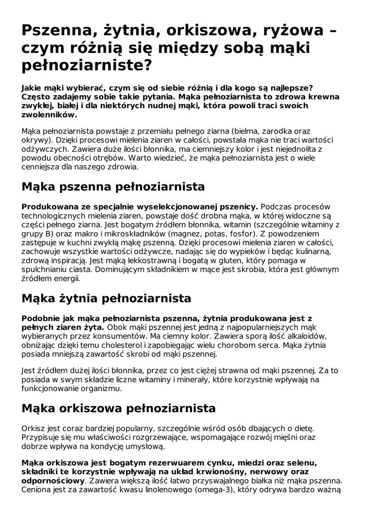 Pszenna, żytnia, orkiszowa, ryżowa – czym różnią się między sobą mąki pełnoziarniste? Jakie mąki wybierać, czym się od siebie różnią i dla kogo są najlepsze? Często zadajemy sobie takie pytania. Mąka pełnoziarnista to zdrowa krewna zwykłej, białej i dla niektórych nudnej mąki, która powoli traci swoich zwolenników. Mąka pełnoziarnista powstaje z przemiału pełnego ziarna (bielma, zarodka oraz okrywy). Dzięki procesowi mielenia ziaren w całości, powstała mąka nie traci wartości odżywczych. Zawiera duże ilości błonnika, ma ciemniejszy kolor i jest niejednolita z powodu obecności otrębów. Warto wiedzieć, że mąka pełnoziarnista jest o wiele cenniejsza dla naszego zdrowia. Mąka pszenna pełnoziarnista Produkowana ze specjalnie wyselekcjonowanej pszenicy. Podczas procesów technologicznych mielenia ziaren, powstaje dość drobna mąka, w której widoczne są części pełnego ziarna. Jest bogatym źródłem błonnika, witamin (szczególnie witaminy z grupy B) oraz makro i mikroskładników (magnez, potas, fosfor). Z powodzeniem zastępuje w kuchni zwykłą mąkę pszenną. Dzięki procesowi mielenia ziaren w całości, zachowuje wszystkie wartości odżywcze, nadając się do wypieków i będąc kulinarną, zdrową inspiracją. Jest mąką lekkostrawną i bogatą w gluten, który pomaga w spulchnianiu ciasta. Dominującym składnikiem w mące jest skrobia, która jest głównym źródłem energii. Mąka żytnia pełnoziarnista Podobnie jak mąka pełnoziarnista pszenna, żytnia produkowana jest z pełnych ziaren żyta. Obok mąki pszennej jest jedną z najpopularniejszych mąk wybieranych przez konsumentów. Ma ciemny kolor. Zawiera sporą ilość alkaloidów, obniżając dzięki temu cholesterol i zapobiegając wielu chorobom serca. Mąka żytnia posiada mniejszą zawartość skrobi od mąki pszennej. Jest źródłem dużej ilości błonnika, przez co jest ciężej strawna od mąki pszennej. Za to posiada w swym składzie liczne witaminy i minerały, które korzystnie wpływają na funkcjonowanie organizmu. Mąka orkiszowa pełnoziarnista Orkisz jest coraz bardziej popularny, szczególnie wśród osób dbających o dietę. Przypisuje się mu właściwości rozgrzewające, wspomagające rozwój mięśni oraz dobrze wpływa na kondycję umysłową. Mąka orkiszowa jest bogatym rezerwuarem cynku, miedzi oraz selenu, składniki te korzystnie wpływają na układ krwionośny, nerwowy oraz odpornościowy. Zawiera większą ilość łatwo przyswajalnego białka niż mąka pszenna. Ceniona jest za zawartość kwasu linolenowego (omega-3), który odrywa bardzo ważną rolę w organizmie człowieka. Cenne składniki, zawartość błonnika i smak, czynią mąkę orkiszową zdrowym substytutem zwykłej mąki pszennej oraz ciekawym urozmaiceniem potraw. Mąka ryżowa pełnoziarnista Pochodzi z pełnego przemiału ziaren ryżu. Dobrze łączy się z innymi mąkami, co ma znaczenie w przemyśle spożywczym. Posiada lekko słodkawy smak i świetnie nadaje się do wypieków – ciast, ciastek, naleśników oraz w przyrządzaniu innych dań. Mąka ryżowa pełnoziarnista posiada ciemny kolor i zawiera wszystkie cenne składniki, które nie są niszczone w procesie produkcji. Zawiera sporą ilość białka i co ważne pozbawiona jest glutenu – może być stosowana przez osoby chore na celiakię. Oprócz tego jest bogatym źródłem wapnia, potasu, fosforu, magnezu, miedzi, sodu oraz witamin (B1, B2 oraz PP). Jak widać mąka pełnoziarnista jest znacznie cenniejszym produktem niż mąka powstała z oczyszczonych ziaren. Zawiera mnóstwo witamin i minerałów. Jest także bogatym źródłem błonnika. Warto więc przestawić się na pełne ziarno i wybrać swój ulubiony rodzaj mąki. Kup mąkę pełnoziarnistą z rabatem 3% już teraz ! (wpisz bonavita w polu „kod specjalny” w koszyku) Author: Aleksandra Musiał Link do artykułu: http://bonavita.pl/pszenna-zytnia-orkiszowa-ryzowa-czym-roznia-siemiedzy-soba-maki-pelnoziarniste
