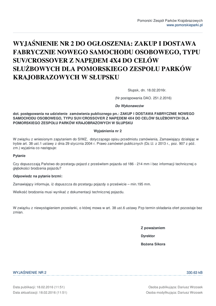 Pomorski Zespół Parków Krajobrazowych www.pomorskieparki.pl WYJAŚNIENIE NR 2 DO OGŁOSZENIA: ZAKUP I DOSTAWA FABRYCZNIE NOWEGO SAMOCHODU OSOBOWEGO, TYPU SUV/CROSSOVER Z NAPĘDEM 4X4 DO CELÓW SŁUŻBOWYCH DLA POMORSKIEGO ZESPOŁU PARKÓW KRAJOBRAZOWYCH W SŁUPSKU Słupsk, dn. 18.02.2016r. (Nr postępowania DAO. 251.2.2016) Do Wykonawców dot. postępowania na udzielenie zamówienia publicznego pn.: ZAKUP I DOSTAWA FABRYCZNIE NOWEGO SAMOCHODU OSOBOWEGO, TYPU SUV/CROSSOVER Z NAPĘDEM 4X4 DO CELÓW SŁUŻBOWYCH DLA POMORSKIEGO ZESPOŁU PARKÓW KRAJOBRAZOWYCH W SŁUPSKU Wyjaśnienia nr 2 W związku z wniesionym zapytaniem do SIWZ, dotyczącego opisu przedmiotu zamówienia, Zamawiający działając w trybie art. 38 ust.1 ustawy z dnia 29 stycznia 2004 r. Prawo zamówień publicznych (Dz.U. z 2013 r., poz. 907 z póź. zm.) wyjaśnia co następuje: Pytanie Czy dopuszczają Państwo do przetargu pojazd z prześwitem pojazdu od 186 - 214 mm i bez informacji technicznej o głębokości brodzenia pojazdu? Odpowiedz na pytanie brzmi: Zamawiający informuje, iż dopuszcza do przetargu pojazdy o prześwicie – min.195 mm. Wielkość brodzenia musi wynikać z dokumentacji technicznej pojazdu. W związku z niewystąpieniem przesłanki, o której mowa w art. 38 ust.6 ustawy Pzp termin składania ofert pozostaje bez zmian. Z poważaniem Dyrektor Bożena Sikora WYJAŚNIENIE NR 2 Data publikacji: 18.02.2016 (11:51) Data aktualizacji: 18.02.2016 (11:51) 330.63 kB Osoba publikująca: Dariusz Wrzosek Osoba modyfikująca: Dariusz Wrzosek Autor: Dariusz Wrzosek Pomorski Zespół Parków Krajobrazowych 76-200 Słupsk, ul. Poniatowskiego 4A tel./fax. 59 842 98 29, e-mail: [email protected]