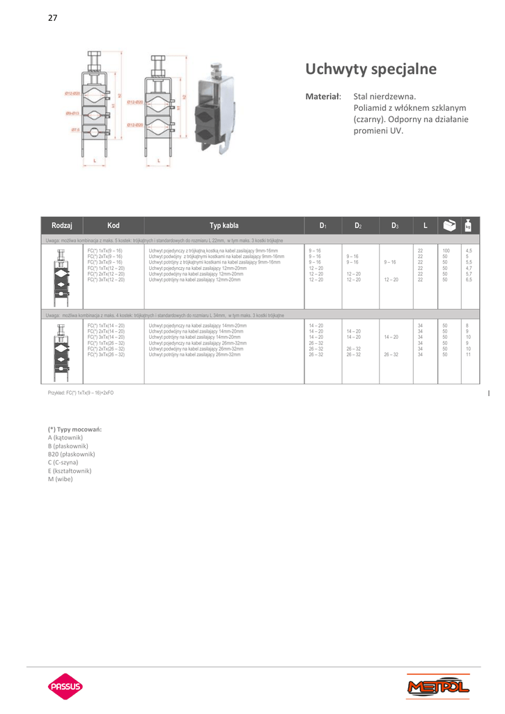 27 Uchwyty specjalne Materiał: Rodzaj Kod Typ kabla D1 Stal nierdzewna. Poliamid z włóknem szklanym (czarny). Odporny na działanie promieni UV. D2 D3 L Uwaga: możliwa kombinacja z maks. 5 kostek: trójkątnych i standardowych do rozmiaru L 22mm, w tym maks. 3 kostki trójkątne FC(*) 1xTx(9 – 16) FC(*) 2xTx(9 – 16) FC(*) 3xTx(9 – 16) FC(*) 1xTx(12 – 20) FC(*) 2xTx(12 – 20) FC(*) 3xTx(12 – 20) Uchwyt pojedynczy z trójkątną kostką na kabel zasilający 9mm-16mm Uchwyt podwójny z trójkątnymi kostkami na kabel zasilający 9mm-16mm Uchwyt potrójny z trójkątnymi kostkami na kabel zasilający 9mm-16mm Uchwyt pojedynczy na kabel zasilający 12mm-20mm Uchwyt podwójny na kabel zasilający 12mm-20mm Uchwyt potrójny na kabel zasilający 12mm-20mm 9 – 16 9 – 16 9 – 16 12 – 20 12 – 20 12 – 20 9 – 16 9 – 16 9 – 16 12 – 20 12 – 20 12 – 20 14 – 20 14 – 20 14 – 20 26 – 32 26 – 32 26 – 32 22 22 22 22 22 22 100 50 50 50 50 50 4,5 5 5,5 4,7 5,7 6,5 34 34 34 34 34 34 50 50 50 50 50 50 8 9 10 9 10 11 Uwaga: możliwa kombinacja z maks. 4 kostek: trójkątnych i standardowych do rozmiaru L 34mm, w tym maks. 3 kostki trójkątne FC(*) 1xTx(14 – 20) FC(*) 2xTx(14 – 20) FC(*) 3xTx(14 – 20) FC(*) 1xTx(26 – 32) FC(*) 2xTx(26 – 32) FC(*) 3xTx(26 – 32) Przykład: FC(*) 1xTx(9 – 16)+2xFO (*) Typy mocowań: A (kątownik) B (płaskownik) B20 (płaskownik) C (C-szyna) E (kształtownik) M (wibe) Uchwyt pojedynczy na kabel zasilający 14mm-20mm Uchwyt podwójny na kabel zasilający 14mm-20mm Uchwyt potrójny na kabel zasilający 14mm-20mm Uchwyt pojedynczy na kabel zasilający 26mm-32mm Uchwyt podwójny na kabel zasilający 26mm-32mm Uchwyt potrójny na kabel zasilający 26mm-32mm 14 – 20 14 – 20 14 – 20 26 – 32 26 – 32 26 – 32