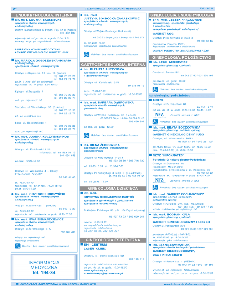 24 ENDOKRYNOLOGIA, INTERNA n lek. med. LUCYNA BAUKNECHT specjalista chorób wewnêtrznych, endokrynolog Olsztyn ul.Wañkowicza 5 Przych. Rej. Nr 8 (Nagórki) 606 482 682 rejestracja tel. od pn. do pt. w godz.10.00-13.00 terminy wizyt po uzgodnieniu telefonicznym l lek. med. JUSTYNA SOCHOCKA-¯AGA£KOWICZ specjalista chorób wewnêtrznych, endokrynolog Olsztyn Al.Wojska Polskiego 39 (Lancet) 89 535 72 80 (w godz 12-18) / 691 709 971 n lek. MARIOLA GOGOLEWSKA-HOSAJA endokrynolog, specjalista chorób wewnêtrznych GASTROENTEROLOGIA, INTERNA Kêtrzyn ul.Traugutta 7 r.pt. 15.00-17.00 rejestracja tel. codziennie w godz. 10.00-15.00 czw. po rejestracji tel. rej. 660 70 20 20 tel. 606 22 22 77 Olsztyn ul. Kociuszki 21/1 89 533 59 15 specjalista chorób wewnêtrznych, gastroenterolog pn.czw. 17.00-18.00 __________________________________________ Olsztyn ul. Wiolarska 4 - Likusy Przychodnia "Zygota" 89 543 61 06 r. 16.00-18.00 rejestracja tel. pn.r.czw. 15.00-18.00, wt.pt. 9.00-16.00 l lek. med. GRZEGORZ MUSZYÑSKI specjalista chorób wewnêtrznych, endokrynolog 89 543 10 22 r. 17.00-19.00 rejestracja tel. codziennie w godz. 8.00-15.00 med. EWA SIEMASZKIEWICZ specjalista chorób wewnêtrznych, endokrynolog Olsztyn ul.¯eromskiego 8 A 532 605 483 wizyty po rejestracji tel. rejestracja codziennie Gabinet bez barier architektonicznych n ginekologia, po³o¿nictwo n BINPOL Olsztyn ul.Partyzantów 80 Zawarta umowa z NFZ Poradnia bez barier architektonicznych GABINET GINEKOLOGICZNY I USG Olsztyn, ul. Warszawska 80/82 89 535 13 34 / 605 281 127 pn.15.00-19.00, wt. 8.30-13.00, r. 15.00-19.00, czw. 13.00-19.00, pt. 8.30-13.00 specjalista chorób wewnêtrznych, gastroenterolog Olsztyn ul.Ko³obrzeska 14c/13 89 533 28 50 / 503 716 720 wt. 15.00-16.00, r. 15.30-17.00 Olsztyn Pl.Konstytucji 3 Maja 3 (Sp.Zdrowie) 89 533 65 14 / 89 533 28 50 GINEKOLOGIA DZIECIÊCA n lek. med. KRYSTYNA CIECHANOWICZ-BARTO Al.Wojska Polskiego 35 p.5 (Sz.Psychiatryczny) 89 527 73 73 / 602 620 261 Poradnia Ginekologiczno-Po³o¿nicza Olsztyn ul.Dworcowa 4A (naprzeciw McDonalds) Przychodnia przeniesiona z ul. Kopernika 30 89 533 56 62 rejestracja tel. codziennie w godz. 8.00-18.00 n lek. med. DARIUSZ KOCHANOWICZ specjalista chorób kobiecych, po³o¿nictwa-cytolog Olsztyn ul.Opolska 20A (Os. Mazurskie) 601 661 526 / 89 534 17 25 wizyty codziennie po rejestracji tel. l lek. med. BOGDAN KULA specjalista ginekolog - po³o¿nik Olsztyn ul.Partyzantów 76/1 89 521 25 00 / 607 229 601 GINEKOLOGIA ESTETYCZNA n EPI - CENTRUM LASER CLINIC pn.wt.czw. 8.00-13.00, 15.00-18.00, r. 8.00-12.00, pt. 8.00-14.00 rejestracja tylko telefoniczna l lek. STANIS£AW MARIAK specjalista chorób kobiecych i po³o¿nictwa GABINET GINEKOLOGICZNY, USG I KRIOTERAPII 503 125 716 rejestracja telefoniczna lub osobista od pn. do pt. w godz. 10.00-18.00 www.epi-olsztyn.pl e-mail:[email protected] Poradnia bez barier architektonicznych GABINET GINEKOLOGICZNY I USG 4D pn.czw. 15.00-18.00 po uzgodnieniu telefonicznym rejestracja telefoniczna 89 527 73 73, 602 620 261 INFORMACJA ROZSZERZONA W OG£OSZENIU RAMKOWYM n NZOZ "HIPOKRATES" Zawarta umowa z NFZ pn. od godz. 15.00 Olsztyn, ul. Samulowskiego 3B INFORMACJA MEDYCZNA tel. 194-34 Gabinet bez barier architektonicznych specjalista ginekolog, po³o¿nik, cytolog Gabinet bez barier architektonicznych specjalista ginekologii i po³o¿nictwa specjalista endokrynolog Olsztyn ul.Janowicza 1 (Medyk) pn.czw.pt. od godz. 15.00 rejestracja codziennie n lek. med. BEATA BOCZKOWSKA pn.czw. od godz. 13.30 l lek. IRENA ¯EBROWSKA Olsztyn ul. Kociuszki 21/1 Informacja tel. 89 533 59 15 604 054 952 specjalista ginekolog - po³o¿nik 89 535 12 77 od pn. do pt. w godz. 8.00-13.30, 15.45-18.00 Olsztyn ul.Wojska Polskiego 39 (Lancet) 89 535 72 80 po 13.00 / 89 524 21 20 692 466 891 l lek. med. JOANNA KUCZYÑSKA-KOS specjalista chorób wewnêtrznych, endokrynolog GINEKOLOGIA, PO£O¯NICTWO n lek. LECH MICKIEWICZ 89 542 67 40 / 601 952 165 l lek. med. BARBARA D¥BROWSKA I³awa ul. Bandurskiego 1 Olsztyn Pl.Konstytucji 3 Maja 3 Olsztyn ul. Barcza 48/1L specjalista chorób wewnêtrznych i gastroenterologii Szczytno ul.Pi³sudskiego 30 (Eskulap) rej. 660 70 20 20 tel. 606 22 22 77 wt. po rejestracji tel. GABINET USG LAUREAT PLEBISCYTU LEKARZ NIEZWYK£Y 2005 Gabinet bez barier architektonicznych Olsztyn ul.Kopernika 1C lok. 16 (parter) rej. 660 70 20 20 tel. 606 22 22 77 pn.r. i inne dni po rejestracji rejestracja tel. w godz. 8.00-18.00 sob. po rejestracji tel. endokrynolog, specjalista ginekologii i po³o¿nictwa, specjalista ginekologii onkologicznej (naprzeciw Dworca PKP) rejestracja telefoniczna codziennie l lek. EL¯BIETA BUCZYÑSKA rej. 660 70 20 20 tel. 606 22 22 77 GINEKOLOGIA, ENDOKRYNOLOGIA l dr n. med. LESZEK FR¥CKOWIAK 89 533 58 85 r. od godz. 14.00 obowi¹zuje rejestracja telefoniczna LAUREATKA HONOROWEGO TYTU£U LEKARZ PRZYJACIELEM KOBIETY 2002 n lek. Tel. 194-34 TELEFONICZNA INFORMACJA MEDYCZNA Olsztyn ul.Janowicza 1 (MEDYK) 89 543 10 22 / 602 199 896 wt.czw.pt. po rejestracji telefonicznej rejestracja tel. od pn. do pt. w godz. 8.00-18.00 www.InformacjaMedyczna.olsztyn.pl