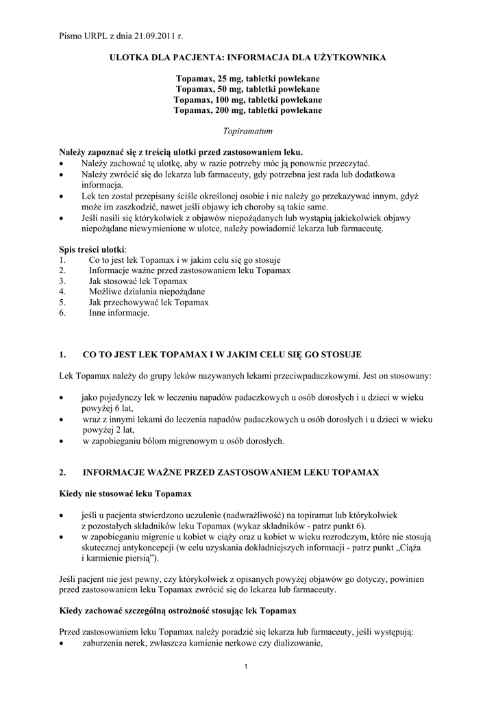 Pismo URPL z dnia 21.09.2011 r. ULOTKA DLA PACJENTA: INFORMACJA DLA UŻYTKOWNIKA Topamax, 25 mg, tabletki powlekane Topamax, 50 mg, tabletki powlekane Topamax, 100 mg, tabletki powlekane Topamax, 200 mg, tabletki powlekane Topiramatum Należy zapoznać się z treścią ulotki przed zastosowaniem leku. • Należy zachować tę ulotkę, aby w razie potrzeby móc ją ponownie przeczytać. • Należy zwrócić się do lekarza lub farmaceuty, gdy potrzebna jest rada lub dodatkowa informacja. • Lek ten został przepisany ściśle określonej osobie i nie należy go przekazywać innym, gdyż może im zaszkodzić, nawet jeśli objawy ich choroby są takie same. • Jeśli nasili się którykolwiek z objawów niepożądanych lub wystąpią jakiekolwiek objawy niepożądane niewymienione w ulotce, należy powiadomić lekarza lub farmaceutę. Spis treści ulotki: 1. Co to jest lek Topamax i w jakim celu się go stosuje 2. Informacje ważne przed zastosowaniem leku Topamax 3. Jak stosować lek Topamax 4. Możliwe działania niepożądane 5. Jak przechowywać lek Topamax 6. Inne informacje. 1. CO TO JEST LEK TOPAMAX I W JAKIM CELU SIĘ GO STOSUJE Lek Topamax należy do grupy leków nazywanych lekami przeciwpadaczkowymi. Jest on stosowany: • • jako pojedynczy lek w leczeniu napadów padaczkowych u osób dorosłych i u dzieci w wieku powyżej 6 lat, wraz z innymi lekami do leczenia napadów padaczkowych u osób dorosłych i u dzieci w wieku powyżej 2 lat, w zapobieganiu bólom migrenowym u osób dorosłych. 2. INFORMACJE WAŻNE PRZED ZASTOSOWANIEM LEKU TOPAMAX • Kiedy nie stosować leku Topamax • • jeśli u pacjenta stwierdzono uczulenie (nadwrażliwość) na topiramat lub którykolwiek z pozostałych składników leku Topamax (wykaz składników - patrz punkt 6). w zapobieganiu migrenie u kobiet w ciąży oraz u kobiet w wieku rozrodczym, które nie stosują skutecznej antykoncepcji (w celu uzyskania dokładniejszych informacji - patrz punkt „Ciąża i karmienie piersią”). Jeśli pacjent nie jest pewny, czy którykolwiek z opisanych powyżej objawów go dotyczy, powinien przed zastosowaniem leku Topamax zwrócić się do lekarza lub farmaceuty. Kiedy zachować szczególną ostrożność stosując lek Topamax Przed zastosowaniem leku Topamax należy poradzić się lekarza lub farmaceuty, jeśli występują: • zaburzenia nerek, zwłaszcza kamienie nerkowe czy dializowanie, 1 Pismo URPL z dnia 21.09.2011 r. • • • • • nieprawidłowości we krwi i płynach ustrojowych (kwasica metaboliczna), zaburzenia wątroby, zaburzenia wzroku, zwłaszcza jaskra, zaburzenia wzrostu jeśli stosowana jest dieta wysokotłuszczowa (dieta ketogenna). Jeśli pacjent nie jest pewny, czy którykolwiek z opisanych powyżej objawów go dotyczy, powinien przed zastosowaniem leku Topamax zwrócić się do lekarza lub farmaceuty. Ważne jest, aby pacjent nie zaprzestał przyjmowania leku bez uprzedniej konsultacji z lekarzem prowadzącym. Pacjent powinien skonsultować się z lekarzem prowadzącym przed przyjęciem jakiegokolwiek leku zawierającego topiramat, wydanego mu jako zamiennik leku Topamax. W trakcie stosowania leku Topamax pacjent może stracić na wadze, dlatego w trakcie leczenia tym lekiem należy regularnie kontrolować masę ciała. Jeśli pacjent traci zbyt dużo na wadze lub gdy dziecko przyjmujące ten lek nie przybiera wystarczająco na wadze, należy skonsultować się z lekarzem prowadzącym. U niewielkiej liczby osób, u których stosowano leki przeciwpadaczkowe, takie jak lek Topamax, występowały myśli o zrobieniu sobie krzywdy lub popełnieniu samobójstwa. Jeśli kiedykolwiek wystąpią takie myśli, należy bezzwłocznie skontaktować się z lekarzem. Stosowanie leku Topamax z innymi lekami Należy powiedzieć lekarzowi lub farmaceucie o wszystkich przyjmowanych ostatnio lekach, również tych, które wydawane są bez recepty, łącznie z preparatami witaminowymi i produktami ziołowymi. Lek Topamax może wchodzić w interakcje z innymi lekami. W związku z tym niekiedy należy dostosować dawkę przyjmowanych przez pacjenta leków lub odpowiednio zmienić dawkę leku Topamax. W szczególności należy poinformować lekarza lub farmaceutę w razie stosowania: • innych leków, które mają szkodliwy wpływ lub obniżają proces myślenia, koncentrację lub koordynację mięśniową (na przykład: leki hamujące ośrodkowy układ nerwowy, takie jak leki rozkurczające mięśnie i leki uspokajające), • środków antykoncepcyjnych. Lek Topamax może zmniejszyć skuteczność działania środków antykoncepcyjnych. Należy powiadomić lekarza, jeśli podczas stosowania środków antykoncepcyjnych razem z lekiem Topamax nastąpiła zmiana w przebiegu krwawień miesięcznych. Należy zachować listę wszystkich przyjmowanych leków. Podczas rozpoczynania terapii nowym lekiem należy tę listę pokazać lekarzowi i farmaceucie. Stosowanie innych leków, takich jak leki przeciwpadaczkowe, rysperydon, lit, hydrochlorotiazyd, metformina, pioglitazon, gliburyd, amitriptylina, propranolol, diltiazem, wenlafaksyna, flunarazyna należy przedyskutować z lekarzem lub farmaceutą. Jeśli pacjent nie jest pewny, czy powyższy tekst go dotyczy, powinien przed zastosowaniem leku Topamax zwrócić się do lekarza lub farmaceuty. Stosowanie leku Topamax z jedzeniem i piciem Można przyjmować lek Topamax z pokarmem lub bez. Należy pić dużo płynów w czasie dnia, aby zapobiec tworzeniu się kamieni nerkowych podczas stosowania leku Topamax. W trakcie stosowania leku Topamax należy unikać spożywania alkoholu. 2 Pismo URPL z dnia 21.09.2011 r. Ciąża i karmienie piersią W okresie ciąży, w przypadku starania się o dziecko lub w okresie karmienia piersią należy przed zastosowaniem leku Topamax porozmawiać z lekarzem. Lekarz zadecyduje, czy w tym przypadku można zastosować lek Topamax. Jeśli lek Topamax jest stosowany w okresie ciąży, istnieje ryzyko, jak w przypadku stosowa