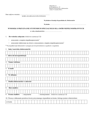 Załącznik nr 2 do Zarządzenia nr 29 Rektora Uniwersytetu w Białymstoku z dnia 27 września 2016 r. Data wpływu wniosku: …………..…………………………..………… (podpis, pieczątka pracownika dziekanatu) Wydziałowa Komisja Stypendialna ds. Doktorantów Wydziału …………………………………………………………………… WNIOSEK O PRZYZNANIE STYPENDIUM SPECJALNEGO DLA OSÓB NIEPEŁNOSPRAWNYCH w roku akademickim ………………………… 1. Do wniosku załączam (właściwe zaznaczyć X): orzeczenie o stopniu niepełnosprawności* orzeczenie traktowane na równi z orzeczeniem o stopniu niepełnosprawności* * W przypadku kopii dokumentów wymagane jest ich potwierdzenie za zgodność z oryginałem. 2. Imię i nazwisko doktoranta/ki: 3. Adres do korespondencji: 4. Numer telefonu: 5. E-mail: 6. Nr albumu: 7. Studia doktoranckie w zakresie: 8. Rok studiów: 9. Forma studiów: stacjonarne niestacjonarne (właściwe zaznaczyć X) 10. Proszę o dokonanie przelewu kwoty przyznanego stypendium na konto, którego jestem właścicielem: nr konta 11. Przyjmuję do wiadomości, że warunkiem wypłaty przyznanego stypendium jest złożenie oświadczenia o niepobieraniu stypendium specjalnego dla osób niepełnosprawnych na więcej niż jednych studiach doktoranckich. 12. OŚWIADCZENIE DOKTORANTA DO WNIOSKU O PRZYZNANIE STYPENDIUM SPECJALNEGO DLA OSÓB NIEPEŁNOSPRAWNYCH Oświadczam, że: (właściwe zakreślić) 1) nie złożyłem (am) wniosku o przyznanie stypendium specjalnego dla osób niepełnosprawnych na innej uczelni niż Uniwersytet w Białymstoku i nie ubiegam się o ww. stypendium na więcej niż jednych studiach doktoranckich. 2) jestem kandydatem na żołnierza zawodowego, żołnierzem zawodowym, funkcjonariuszem służb państwowych. 3) nie jestem kandydatem na żołnierza zawodowego, żołnierzem zawodowym, funkcjonariuszem służb państwowych, 4) zapoznałem (am) się z regulaminem przyznawania i wypłacania świadczeń pomocy materialnej doktorantom Uniwersytetu w Białymstoku, 5) zobowiązuję się do zwrotu nienależnie pobranych świadczeń z funduszu pomocy materialnej, 6) podane przeze mnie informacje i załączone dokumenty są prawdziwe, jestem świadomy(a) odpowiedzialności karnej za fałszywe zeznania z art. 233 § 1 ustawy z dnia 6 czerwca 1997 r. Kodeks karny (Dz. U. Nr 88, poz. 553 z późn. zm.) oraz odpowiedzialności cywilnej z art. 415 ustawy z dnia 23 kwietnia 1964 r. Kodeks cywilny (t.j. Dz.U. z 2016 r., poz. 380 z późn. zm.) za szkodę wyrządzoną niezgodnym z prawdą oświadczeniem. Białystok, dnia ………………………… ………………………………………… (czytelny podpis wnioskodawcy) Zgodnie z ustawą o ochronie danych osobowych wyrażam zgodę na przetwarzanie przez Uniwersytet w Białymstoku danych zawartych we wniosku oraz złożonych do wniosku dokumentach. Białystok, dnia ………………………… ………………………………………… (czytelny podpis wnioskodawcy)