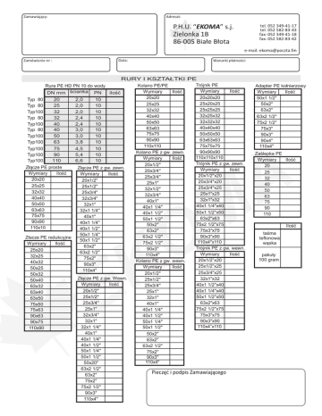 Adresat: Zamawiaj¹cy: P.H.U. “EKOMA” s.j. Zielonka 1B 86-005 Bia³e B³ota tel. 052 349-41-17 tel. 052 582-83-43 fax: 052 349-41-18 fax: 052 582-83-42 e-mail: [email protected] Data: Zamówienie nr : Warunki p³atnoœci: RURY I KSZTA£TKI PE Rura PE HD PN 10 do wody DN mm œcianka PN iloœæ Typ 80 Typ 80 Typ100 Typ 80 Typ100 Typ 80 Typ100 Typ100 20 25 32 32 40 40 50 63 2,0 2,0 2,0 2,4 2,4 3,0 3,0 3,8 10 10 10 10 10 10 10 10 Typ100 Typ100 Typ100 75 90 110 4,5 5,4 6,6 10 10 10 Z³¹cze PE proste Wymiary Iloœæ 20x20 25x25 32x32 40x40 50x50 63x63 75x75 90x90 110x10 Z³acze PE redukcyjne Wymiary Iloœæ 25x20 32x25 40x32 50x25 50x32 50x40 63x32 63x40 63x50 75x50 75x63 90x63 90x75 110x90 Z³¹cze PE z gw. zewn. Wymiary Iloœæ 20x1/2" 25x1/2" 25x3/4" 32x3/4" 32x1" 32x1 1/4" 40x1" 40x1 1/4" 40x1 1/2" 50x1 1/4" 50x1 1/2" 63x2" 63x2 1/2" 75x2" 90x3" 110x4" E Z³¹cze PE z gw. Wewn. Wymiary Iloœæ 20x1/2" 25x1/2" 25x3/4" 25x1" 32x3/4" 32x1" 32x1 1/4" 40x1" 40x1 1/4" 40x1 1/2" 50x1 1/4" 50x1 1/2" 50x20" 63x2 1/2" 63x2" 75x2" 75x2 1/2" 90x3" 110x4" Kolano PE/PE Wymiary Iloœæ 20x20 25x25 32x32 40x40 50x50 63x63 75x75 90x90 110x110 Kolano PE z gw. zewn. Wymiary Iloœæ 20x1/2" 20x3/4" 25x3/4" 25x1" 32x1/2" 32x3/4" 40x1" 40x1 1/4" 40x1 1/2" 50x1 1/2" 50x2" 63x2" 63x2 1/2" 75x2 1/2" 90x3" 110x4" Kolano PE z gw. wewn. Wymiary Iloœæ 20x1/2" 25x1/2" 25x3/4" 25x1" 32x1" 40x1" 40x1 1/4" 40x1 1/2" 50x1 1/4" 50x1 1/2" 50x2" 63x2" 63x2 1/2" 75x2" 90x3" 110x4" Trójnik PE Wymiary Iloœæ 20x20x20 25x20x25 25x25x25 32x25x32 32x32x32 40x40x40 50x50x50 63x63x63 75x75x75 90x90x90 110x110x110 Trójnik PE z gw. zewn. Wymiary Iloœæ 20x1/2"x20 20x3/4"x20 25x3/4"x25 25x1"x25 32x1"x32 40x1 1/4"x40 50x1 1/2"x50 63x2"x63 75x2 1/2"x75 75x3"x75 90x3"x90 110x4"x110 Trójnik PE z gw. wewn. Wymiary Iloœæ 20x1/2”x20 25x1/2”x25 25x3/4"x25 32x1"x32 40x1 1/2"x40 40x1 1/4"x40 50x1 1/2"x50 63x2"x63 75x2 1/2"x75 75x3"x75 90x3"x90 110x4”x110 Adapter PE ko³nierzowy Wymiary Iloœæ 50x1 1/2" 50x2" 63x2" 63x2 1/2" 75x2 1/2" 75x3" 90x3" 90x4" 110x4" Zaœlepka PE Wymiary Iloœæ 20 25 32 40 50 63 75 90 110 A M O K Pieczêæ i podpis Zamawiaj¹cego Iloœæ taœma teflonowa w¹ska paku³y 100 gram