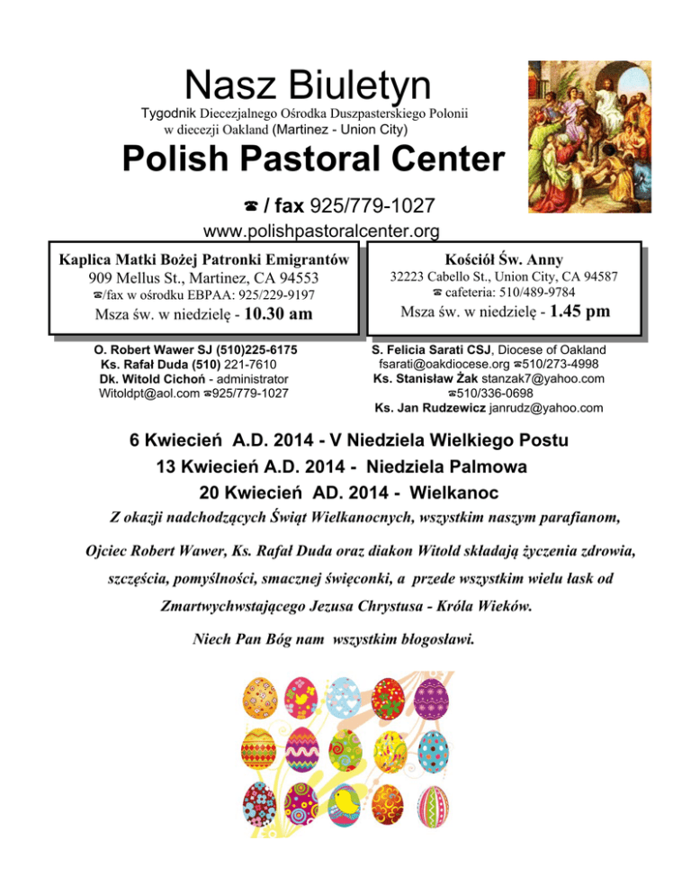 Nasz Biuletyn Tygodnik Diecezjalnego Ośrodka Duszpasterskiego Polonii w diecezji Oakland (Martinez - Union City) Polish Pastoral Center ? / fax 925/779-1027 www.polishpastoralcenter.org Kaplica Matki Bożej Patronki Emigrantów 909 Mellus St., Martinez, CA 94553 ?/fax w ośrodku EBPAA: 925/229-9197 Msza św. w niedzielę - 10.30 am O. Robert Wawer SJ (510)225-6175 Ks. Rafał Duda (510) 221-7610 Dk. Witold Cichoń - administrator [email protected] ?925/779-1027 Kościół Św. Anny 32223 Cabello St., Union City, CA 94587 ? cafeteria: 510/489-9784 Msza św. w niedzielę - 1.45 pm S. Felicia Sarati CSJ, Diocese of Oakland [email protected] ?510/273-4998 Ks. Stanisław Żak [email protected] ?510/336-0698 Ks. Jan Rudzewicz [email protected] 6 Kwiecień A.D. 2014 - V Niedziela Wielkiego Postu 13 Kwiecień A.D. 2014 - Niedziela Palmowa 20 Kwiecień AD. 2014 - Wielkanoc Z okazji nadchodzących Świąt Wielkanocnych, wszystkim naszym parafianom, Ojciec Robert Wawer, Ks. Rafał Duda oraz diakon Witold składają życzenia zdrowia, szczęścia, pomyślności, smacznej święconki, a przede wszystkim wielu łask od Zmartwychwstającego Jezusa Chrystusa - Króla Wieków. Niech Pan Bóg nam wszystkim błogosławi. Rozkaz Dziś kapelan wojskowy dostał rozkaz od Boga, że dusze z Katynia rozgrzeszyć potrzeba, na ich wieczny spoczynek, na ich drogę do nieba. Błogosławię was panowie za oddanie Polsce, za haniebną drogę w zwierzęcych wagonach, odmrożone ciała, zawszone baraki, za miesiące katorgi w bolszewickiej toni, i obrazek Pani Ostrobramskiej, w zimnej, martwej dłoni. Muszę też rozgrzeszyć te bezmyślne bydlęta, z krasną gwiazdą na czapce, pijanych od wódki, we krwi ubryzganych, gdy wiązali drutem zniewolone ręce, a potem strzelali, bohatersko w tył głowy, albo prosto w serce. Bóg w swym miłosierdziu, uczy kochać i przebaczać, puścić w zapomnienie tę wojenną trwogę, lecz ludobójcom z Moskwy co kazali mordować … rozgrzeszenia dać nie mogę. Kwiecień 2001 Paweł Janikowski „Mszę Święta Dziękczynna w Wigilię Kanonizacji Ojca Świętego Jana Pawła II oraz Jana XXIII w Katedrze Chrystusa Światła w Oakland odprawi Biskup naszej diecezji Michael C. Barber SJ, w dniu 26 Kwietnia o godz. 5:30 PM Nasza grupa etniczna jest gospodarzem tej uroczystości i po Mszy Św. zapraszamy wszystkich uczestnikow na skromny poczęstunek. Już dziś zapraszamy wszystkich wiernych na wspaniała uroczystość. Z Sponsorzy “Naszego Biuletynu” Z Ogłoszenia różne: Praca - Kupno - Sprzedaż - Usługi - Rozrywka- Informacj- Podziękowania W dniu 18 Kwietnia przypada Wielki Piątek, a więc tym dniu obowiazuje nas post ilosciowy i jakosciowy dla wiernych od 14 do 65 roku zycia. Chorzy sa zwolnieni z tego obowiązku. Tegoroczne Triduum Paschalne przypada w dniach od 17 do 19 Kwietnia. Wiernych zapraszamy do przygotowania Grobu Panskiego w Wielki Czwartek, na obrzędy Wielkiego Piątku oraz do przygotowania Kaplicy na okres Świąt Wielkanocnych, również o dostarczenie jak zwykle kwiatów. W Wielką Sobotę w Kaplicy w Martinez święcenie pokarmów w godz. od 10am do 2pm (co pół godz). Harcerzy, dzieci i młodzież szkolną zapraszamy na adorację i wartę przy Grobie Pana Jezusa. W Union City w Kościele Św. Anny święcenie pokarów w Wielką Sobotę o godz. 12:30pm do 2:00 pm (sala numer 104) Spowiedź / Sakrament pojednania będzie dostępna również w czasie trwania Triduum Paschalnego. Ojciec Robert będzie dostępny tak przed jak i po obrzędach Triduum. W dalszym ciągu prowadzimy zbieranie jałmużny dla Zakładu dzieci i młodzieży niepełnosprawnej, którymi opiekują się Siostry Józefitki w Wierzbicach k/Wrocławia. Puszka wystawiona przed Ołtarzem, w okresie Wielkopostno - Wielkanocnym. Za wszystkie ofiary, serdeczne Bóg zapłać. Tomik “Niewiniątkoʺ Zapraszamy polskich poetów,malarzy,grafików i fotografów emigracyjnych z całego świata do wzięcia udziału w naszym nowym tomiku „Niewiniątko ”,który bedzie wydany pod koniec 2014 roku. Całkowity dochód ze sprzedaży tomiku przeznaczony będzie na pomoc polskiemu harcerstwu w Kazachstanie.Tematem tegorocznego tomiku jest „Dziecko” Prosimy o przesłanie do nas wierszy, kopii obrazow, rysunkow lub artystycznej fotografii związanych z tematem drogą elektroniczną do Bogusi Kizior Od 1 maja do 30 czerwca 2014 na email adres: Bogulka@comcast. Informacje o Akcji Charytatywnej ZHP w Kalifornii, można uzyskać u hm. Ryszarda Urbaniaka, email: [email protected] Kaplica Matki Bożej Patronki Emigrantów w Martinez hhh Liturgia hhh -6 IV V Niedziela Postu 10:30 am ks. Robert: Za Żołnierzy Wojska Polskiego zamordowanych w Katyniu oraz ofiary katastrofy lotniczej w Smolensku (zam. Harcerze) -------------------------------------------------------------13 IV Niedziela Palmowa 10:30 am Ks. Robert: + Stanisław Śliwak w 2 r. śm Triduum Paschalne -17 IV Wielki Czwartek 7:30 pm ks. Robert: intencja wolna -18 IV Wielki Piatek 7:30 pm ks. Robert: Nabożenstwo Krzyża -19 IV Wielka Sobota Święcenie pokarmów Wielkanocnych co pół godz. od 10:00 am do 2:00 pm i adoracja Wigilia Rezurekcyjna o godz 7:30 pm ks. Robert: + + Janina i Władysław Wołowicz oraz + Czesława Różycka - 20 IV Niedziela Wielkanocna 10:30 am ks. Robert: + Stanisław 25 r. śm. i Anna 3 r. śm. Grobelny -26 IV Msza Św. Katedra Chrystusa Światła celebr przez Bp. Michael C. Barber upam. Kanoniz. Jana Pawla II I Jana XXIII 5:30 pm - 27 IV Święto Miłosierdzia Bożego 10:30 am ks. Robert: intencja wolna -2 V 1-szy Piatek miesiaca 7:30 pm Ks. Robert: + Sandy Taylor - 4 V III Niedziela Wielkanocna 10:30 am ks. Robert: -11 V IV Niedziela Wielkanocna 10:30 am ks. Robert: o Boże błog i wszelkie łaski dla Leokadii Markiel w 80 r. urodzin Kościół Świętej Anny w Union City hhh Liturgia hhh -6 IV V Niedziela Postu 1:45pm ks. Robert: intencja wolna ----------------------------------------------------------- - 13 IV Niedziela P