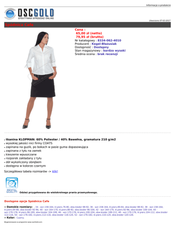 Informacje o produkcie Utworzono 07-03-2017 Spódnica Cafe Cena : 65,00 zł (netto) 79,95 zł (brutto) Nr katalogowy : 8334-062-4010 Producent : Kegel-Błażusiak Dostępność : Dostępny Stan magazynowy : bardzo wysoki Średnia ocena : brak recenzji ● ● ● ● ● ● ● ● tkanina KLOPMAN: 60% Poliester / 40% Bawełna, gramatura 210 g/m2 wysokiej jakości nici firmy COATS zapinana na guzik, po bokach w pasie guma dopasowująca zapinana z tyłu na zamek kieszenie wpuszczane rozporek zakładany z tyłu dół wykończony obrębem dostępna w kolorze czarnym Szczegółowa tabela rozmiarów -> klik! Odzież przygotowana do wielokrotnego prania przemysłowego. Dostępne opcje Spódnica Cafe » Damskie rozmiary: , 34 - wzr.158-164, kl.piers.76-80, obw.bioder 88-92, 36 - wzr.158-164, kl.piers.80-84, obw.bioder 88-92, 38 - wzr.158-164, kl.piers.84-88, obw.bioder 92-96, 40 - wzr.164-170, kl.piers.88-92, obw.bioder 96-100, 42 - wzr.164-170, kl.piers.92-96, obw.bioder 100-104, 44 wzr.170-176, kl.piers.96-100, obw.bioder 104-108, 46 - wzr.170-176, kl.piers.100-104, obw.bioder 108-112, 48 - wzr.170-176, kl.piers.104-112, obw.bioder 112-116, 50 - wzr.176-182, kl.piers.112-116, obw.bioder 116-120, 52 - wzr.176-182, kl.piers.116-124, obw.bioder 120-128. » Kolor: Czarny. Wygenerowano w programie www.oscGold.com