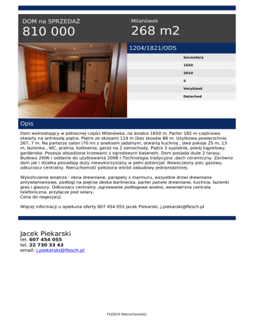 DOM na SPRZEDAŻ 810 000 Milanówek 268 m2 1204/1821/ODS Secondary 1650 2010 5 VeryGood Detached Opis Dom wolnostojący w północnej części Milanówka, na działce 1650 m. Parter 182 m częściowo otwarty na antresolę piętra. Piętro ze skosami 114 m (bez skosów 86 m. Użytkowa powierzchnia 267, 7 m. Na parterze salon (70 m) z aneksem jadalnym, otwartą kuchnią , dwa pokoje 25 m, 13 m, łazienka , WC, pralnia, kotłownia, garaż na 2 samochody. Piętro 3 sypialnie, pokój kąpielowy, garderoba .Posesja obsadzona krzewami z ogrodowym basenem. Dom posiada duże 2 tarasy. Budowa 2006 r oddanie do użytkowania 2008 r.Technologia tradycyjna ,dach ceramiczny. Zarówno dom jak i działka posiadają duży niewykorzystany w pełni potencjał. Nowoczesny piec gazowy, odkurzacz centralny. Nieruchomość położona wśród zabudowy jednorodzinnej. Wykończenie wnętrza : okna drewniane, parapety z marmuru, wszystkie drzwi drewniane antywłamaniowe, podłogi na piętrze deska barlinecka, parter panele drewniane, kuchnia, łazienki gres i glazury. Odkurzacz centralny ,ogrzewanie podłogowe wodne, wewnętrzna centrala telefoniczna, przyłącze pod solary. Cena do negocjacji. Więcej informacji u opiekuna oferty 607 454 055 Jacek Piekarski, [email protected] Jacek Piekarski tel. 607 454 055 tel. 22 730 33 43 email: [email protected] FLESCH Nieruchomości Powered by TCPDF (www.tcpdf.org)