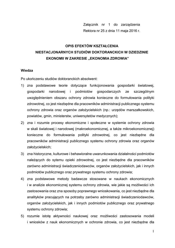 Załącznik nr 1 do zarządzenia Rektora nr 25 z dnia 11 maja 2016 r. OPIS EFEKTÓW KSZTAŁCENIA NIESTACJONARNYCH STUDIÓW DOKTORANCKICH W DZIEDZINIE EKONOMII W ZAKRESIE „EKONOMIA ZDROWIA” Wiedza Po ukończeniu studiów doktoranckich absolwent: 1) zna podstawowe teorie dotyczące funkcjonowania gospodarki światowej, gospodarki narodowej i podmiotów gospodarczych ze szczególnym uwzględnieniem obszaru ochrony zdrowia konieczne do formułowania polityki zdrowotnej, co jest niezbędne dla pracowników administracji publicznego systemu ochrony zdrowia oraz organów założycielskich (np.: urzędów marszałkowskich, powiatów, gmin, ministerstw, uniwersytetów medycznych); 2) zna i rozumie procesy ekonomiczne i społeczne w systemie ochrony zdrowia w skali światowej i narodowej (makroekonomicznej, a także mikroekonomicznej) konieczne do formułowania polityki zdrowotnej, co jest niezbędne dla pracowników administracji publicznego systemu ochrony zdrowia oraz organów założycielskich; 3) zna historyczne, kulturowe i behawioralne uwarunkowania działalności podmiotów należących do sytemu opieki zdrowotnej, co jest niezbędne dla pracowników zarówno administracji świadczeniodawców, organów założycielskich, jak i innych podmiotów publicznego oraz prywatnego systemu ochrony zdrowia; 4) zna podstawowe metody badawcze stosowane w naukach ekonomicznych i w analizie ekonomicznej systemu ochrony zdrowia, wie jakie są możliwości ich zastosowania oraz zna sposoby poprawnego wnioskowania, co jest niezbędne dla analityków pracujących na potrzeby zarówno administracji świadczeniodawców, organów założycielskich, jak i innych podmiotów publicznego oraz prywatnego systemu ochrony zdrowia; 5) rozumie istotę aktywności naukowej oraz możliwości zastosowania modeli i wniosków z nauk ekonomicznych w ochronie zdrowia, co jest niezbędne dla 1 analityków pracujących na potrzeby zarówno administracji świadczeniodawców, organów założycielskich, jak i innych podmiotów publicznego oraz prywatnego systemu ochrony zdrowia; 6) zna podmioty tworzące infrastrukturę ochrony zdrowia w Polsce oraz podstawy polityki zdrowotnej państwa, co jest niezbędne dla pracowników zarówno administracji świadczeniodawców, organów założycielskich, jak i innych podmiotów publicznego oraz prywatnego systemu ochrony zdrowia; 7) ma wiedzę na temat ryzyka w działalności podmiotów należących do sytemu ochrony zdrowia, co jest niezbędne dla pracowników zarówno administracji świadczeniodawców, organów założycielskich, jak i innych podmiotów publicznego oraz prywatnego systemu ochrony zdrowia; 8) potrafi wykorzystywać analizę ekonomiczną do podejmowania efektywnych decyzji na rynku usług zdrowotnych, co jest niezbędne dla pracowników zarówno administracji świadczeniodawców, jak i innych podmiotów publicznego oraz prywatnego systemu ochrony zdrowia; 9) zna najnowsze wyniki badań z obszaru ekonomii zdrowia, opublikowane w kluczowych publikacjach naukowych o zasięgu międzynarodowym, co jest niezbędne dla analityków pracujących na potrzeby zarówno administracji świadczeniodawców, organów założycielskich, jak i innych podmiotów publicznego oraz prywatnego systemu ochrony zdrowia. Umiejętności Absolwent po ukończeniu studiów: 1) umie wyszukiwać literaturę z zakresu prowadzonych badań oraz posiada umiejętność gromadzenia danych, co jest niezbędne dla analityków pracujących na potrzeby zarówno administracji świadczeniodawców, organów założycielskich, jak i innych podmiotów publicznego oraz prywatnego systemu ochrony zdrowia; 2) umie prowadzić badania naukowe (sformułować temat i hipotezy badawcze, wybrać odpowiednią metodę badawczą, gromadzić dane, przeprowadzić analizy i wyciągać wnioski), co jest niezbędne dla analityków pracujących na potrzeby zarówno administracji świadczeniodawców, organów założycielskich, jak i innych podmiotów publicznego oraz prywatnego systemu ochrony zdrowia; 2 3) potrafi w sposób krytyczny podejść do istniejących teorii ekonomii zdrowia, umiejętnie prowadzić dyskusje naukowe i prezentować własne osiągnięcia naukowe w komunikatywnej formie (również przy wykorzystaniu nowoczesnych form przekazu), co jest niezbędne dla analityków pracujących na potrzeby zarówno administracji świadczeniodawców, organów założycielskich, jak i innych podmiotów publicznego oraz prywatnego systemu ochrony zdrowia; 4) potrafi dokonywać krytycznej oceny procesów na rynku usług zdrowotnych oraz umie wykorzystać wiedzę teoretyczną w proponowaniu rozwiązań mających na celu wzrost efektywności systemu ochrony zdrowia, co jest niezbędne dla pracowników zarówno świadczeniodawców, administracji organów założycielskich, jak i innych podmiotów publicznego oraz prywatnego systemu ochrony zdrowia; 5) posiada umiejętność pracy w grupie powołanej w celu prowadzenia badań naukowych lub realizacji projektów dotyczących systemu ochrony zdrowia, co jest niezbędne dla pracowników zarówno administracji świadczeniodawców, organów założycielskich, jak i innych podmiotów publicznego oraz prywatnego systemu ochrony zdrowia; 6) jest przygotowany do kierowania zespołem badawczym, co jest niezbędne dla analityków pracujących na potrzeby zarówno administracji świadczeniodawców, organów założycielskich, jak i innych podmiotów publicznego oraz prywatnego systemu ochrony zdrowia; 7) ma umiejętność konwersatoriów, prowadzenia seminariów, zajęć ćwiczeń dydaktycznych/szkoleń lub warsztatów z w formie wykorzystaniem najnowszych środków nauczania, co jest niezbędne dla pracowników zarówno administracji świadczeniodawców, organów założycielskich, jak i innych podmiotów publicznego oraz prywatnego systemu ochrony zdrowia; 8) umiejętnie uczestniczy w dyskusjach naukowych dotyczących ochrony zdrowia i potrafi, zgodnie z zasadami warsztatu naukowego, przygotowywać p