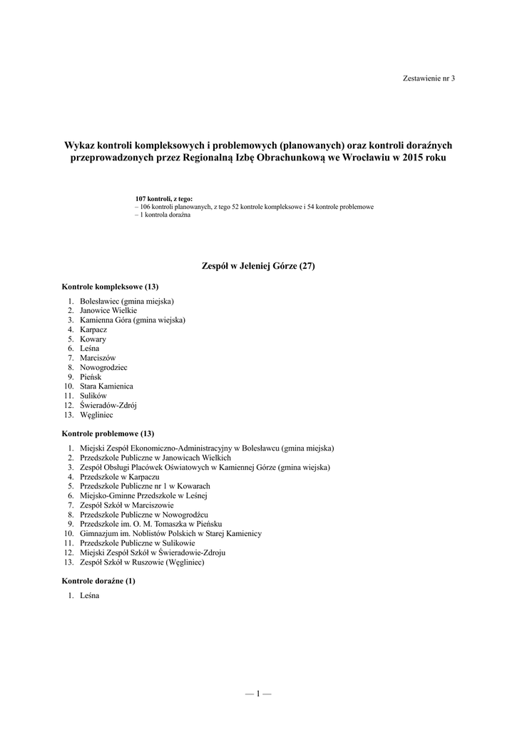 Zestawienie nr 3 Wykaz kontroli kompleksowych i problemowych (planowanych) oraz kontroli doraźnych przeprowadzonych przez Regionalną Izbę Obrachunkową we Wrocławiu w 2015 roku 107 kontroli, z tego: – 106 kontroli planowanych, z tego 52 kontrole kompleksowe i 54 kontrole problemowe – 1 kontrola doraźna Zespół w Jeleniej Górze (27) Kontrole kompleksowe (13) 1. 2. 3. 4. 5. 6. 7. 8. 9. 10. 11. 12. 13. Bolesławiec (gmina miejska) Janowice Wielkie Kamienna Góra (gmina wiejska) Karpacz Kowary Leśna Marciszów Nowogrodziec Pieńsk Stara Kamienica Sulików Świeradów-Zdrój Węgliniec Kontrole problemowe (13) 1. 2. 3. 4. 5. 6. 7. 8. 9. 10. 11. 12. 13. Miejski Zespół Ekonomiczno-Administracyjny w Bolesławcu (gmina miejska) Przedszkole Publiczne w Janowicach Wielkich Zespół Obsługi Placówek Oświatowych w Kamiennej Górze (gmina wiejska) Przedszkole w Karpaczu Przedszkole Publiczne nr 1 w Kowarach Miejsko-Gminne Przedszkole w Leśnej Zespół Szkół w Marciszowie Przedszkole Publiczne w Nowogrodźcu Przedszkole im. O. M. Tomaszka w Pieńsku Gimnazjum im. Noblistów Polskich w Starej Kamienicy Przedszkole Publiczne w Sulikowie Miejski Zespół Szkół w Świeradowie-Zdroju Zespół Szkół w Ruszowie (Węgliniec) Kontrole doraźne (1) 1. Leśna —1— Zespół w Legnicy (30) Kontrole kompleksowe (15) 1. 2. 3. 4. 5. 6. 7. 8. 9. 10. 11. 12. 13. 14. 15. Chocianów Chojnów (gmina miejska) Chojnów (gmina wiejska) Gromadka Jawor Jerzmanowa Legnickie Pole Lubin (gmina miejska) Lubin (gmina wiejska) Mściwojów Paszowice Polkowice Warta Bolesławiecka Zagrodno Żukowice Kontrole problemowe (15) 1. 2. 3. 4. 5. 6. 7. 8. 9. 10. 11. 12. 13. 14. 15. Miejski Zakład Gospodarki Komunalnej i Mieszkaniowej w Chocianowie Szkoła Podstawowa nr 4 im. J. Korczaka w Chojnowie (gmina miejska) Gminny Zakład Gospodarki Komunalnej i Mieszkaniowej w Chojnowie (gmina wiejska) Zespół Szkół w Gromadce Przedszkole Publiczne nr 4 w Jaworze Przedszkole Gminne w Jerzmanowej Zespół Szkół w Legnickim Polu Poradnia Psychologiczno-Pedagogiczna w Lubinie (gmina miejska) Gminny Ośrodek Pomocy Społecznej w Lubinie (gmina wiejska) Szkoła Podstawowa w Targoszynie (Mściwojów) Szkoła Podstawowa im. W. Broniewskiego w Paszowicach Przedsiębiorstwo Gospodarki Mieszkaniowej i Komunalnej w Polkowicach Gminny Ośrodek Pomocy Społecznej w Raciborowicach Górnych (Warta Bolesławiecka) Gminny Ośrodek Pomocy Społecznej w Zagrodnie Gminny Ośrodek Pomocy Społecznej w Żukowicach Zespół w Wałbrzychu (20) Kontrole kompleksowe (10) 1. 2. 3. 4. 5. 6. 7. 8. 9. 10. Boguszów-Gorce Czarny Bór Głuszyca Jaworzyna Śląska Kłodzko (gmina miejska) Kłodzko (gmina wiejska) Nowa Ruda (gmina miejska) Nowa Ruda (gmina wiejska) Polanica-Zdrój Walim Kontrole problemowe (10) 1. 2. 3. 4. 5. 6. 7. 8. 9. 10. Miejska Biblioteka Publiczna Centrum Kultury w Boguszowie-Gorcach Gminna Biblioteka Publiczna w Czarnym Borze Gimnazjum Publiczne w Głuszycy Szkoła Podstawowa im. M. Konopnickiej w Jaworzynie Śląskiej Szkoła Podstawowa nr 3 w Kłodzki (gmina miejska) Szkoła Podstawowa w Krosnowicach (Kłodzko gmina wiejska) Miejski Zespół Szkół nr 1 w Nowej Rudzie (gmina miejska) Publiczne Gimnazjum nr 1 w Jugowie (Nowa Ruda gmina wiejska) Miejska Biblioteka Publiczna w Polanicy-Zdroju Gminny Zespół Obsługi Szkół w Walimiu —2— Zespół we Wrocławiu (30) Kontrole kompleksowe (14) 1. 2. 3. 4. 5. 6. 7. 8. 9. 10. 11. 12. 13. 14. Bierutów Brzeg Dolny Ciepłowody Dziadowa Kłoda Góra Jemielno Oborniki Śląskie Oleśnica (gmina miejska) Oleśnica (gmina wiejska) Stoszowice Syców Wiązów Ziębice Żmigród Kontrole problemowe (16) 1. 2. 3. 4. 5. 6. 7. 8. 9. 10. 11. 12. 13. 14. 15. 16. Zarząd Oświaty Samorządowej w Bierutowie Dolnobrzeski Ośrodek Kultury w Brzegu Dolnym Gminny Ośrodek Kultury i Promocji w Ciepłowodach Gimnazjum w Dziadowej Kłodzie Dom Kultury w Górze Gminny Ośrodek Upowszechniania Kultury w Jemielnie Publiczne Przedszkole w Obornikach Śląskich Miejski Ośrodek Kultury i Sportu w Oleśnicy (gmina miejska) Gimnazjum Gminy Oleśnica im. Szarych Szeregów (gmina wiejska) Ośrodek Pomocy Społecznej w Stoszowicach Centrum Kultury w Sycowie Szkoła Muzyczna I Stopnia w Witowicach (Wiązów) Ziębickie Centrum Kultury Zespół Placówek Kultury w Żmigrodzie Powiat Ząbkowicki Województwo Dolnośląskie —3—