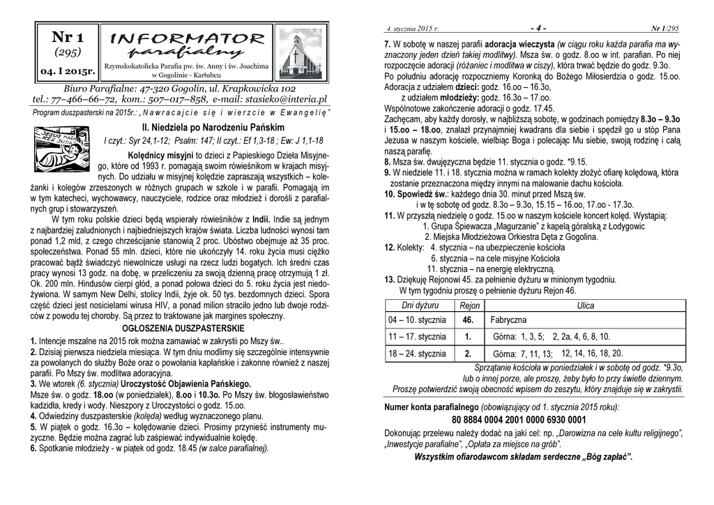 (295) 04. I 2015r. -4- 4. stycznia 2015 r. Nr 1 Rzymskokatolicka Parafia pw. św. Anny i św. Joachima w Gogolinie - Karłubcu Biuro Parafialne: 47-320 Gogolin, ul. Krapkowicka 102 tel.: 77–466–66–72, kom.: 507–017–858, e-mail: [email protected] Program duszpasterski na 2015r.: „ N a w r a c a j c i e s i ę i w i e r z c i e w E w a n g e l i ę ” II. Niedziela po Narodzeniu Pańskim I czyt.: Syr 24,1-12; Psalm: 147; II czyt.: Ef 1,3-18 ; Ew: J 1,1-18 Kolędnicy misyjni to dzieci z Papieskiego Dzieła Misyjnego, które od 1993 r. pomagają swoim rówieśnikom w krajach misyjnych. Do udziału w misyjnej kolędzie zapraszają wszystkich – koleżanki i kolegów zrzeszonych w różnych grupach w szkole i w parafii. Pomagają im w tym katecheci, wychowawcy, nauczyciele, rodzice oraz młodzież i dorośli z parafialnych grup i stowarzyszeń. W tym roku polskie dzieci będą wspierały rówieśników z Indii. Indie są jednym z najbardziej zaludnionych i najbiedniejszych krajów świata. Liczba ludności wynosi tam ponad 1,2 mld, z czego chrześcijanie stanowią 2 proc. Ubóstwo obejmuje aż 35 proc. społeczeństwa. Ponad 55 mln. dzieci, które nie ukończyły 14. roku życia musi ciężko pracować bądź świadczyć niewolnicze usługi na rzecz ludzi bogatych. Ich średni czas pracy wynosi 13 godz. na dobę, w przeliczeniu za swoją dzienną pracę otrzymują 1 zł. Ok. 200 mln. Hindusów cierpi głód, a ponad połowa dzieci do 5. roku życia jest niedożywiona. W samym New Delhi, stolicy Indii, żyje ok. 50 tys. bezdomnych dzieci. Spora część dzieci jest nosicielami wirusa HIV, a ponad milion straciło jedno lub dwoje rodziców z powodu tej choroby. Są przez to traktowane jak margines społeczny. OGŁOSZENIA DUSZPASTERSKIE 1. Intencje mszalne na 2015 rok można zamawiać w zakrystii po Mszy św.. 2. Dzisiaj pierwsza niedziela miesiąca. W tym dniu modlimy się szczególnie intensywnie za powołanych do służby Boże oraz o powołania kapłańskie i zakonne również z naszej parafii. Po Mszy św. modlitwa adoracyjna. 3. We wtorek (6. stycznia) Uroczystość Objawienia Pańskiego. Msze św. o godz. 18.oo (w poniedziałek), 8.oo i 10.3o. Po Mszy św. błogosławieństwo kadzidła, kredy i wody. Nieszpory z Uroczystości o godz. 15.oo. 4. Odwiedziny duszpasterskie (kolęda) według wyznaczonego planu. 5. W piątek o godz. 16.3o – kolędowanie dzieci. Prosimy przynieść instrumenty muzyczne. Będzie można zagrać lub zaśpiewać indywidualnie kolędę. 6. Spotkanie młodzieży - w piątek od godz. 18.45 (w salce parafialnej). Nr 1/295 7. W sobotę w naszej parafii adoracja wieczysta (w ciągu roku każda parafia ma wyznaczony jeden dzień takiej modlitwy). Msza św. o godz. 8.oo w int. parafian. Po niej rozpoczęcie adoracji (różaniec i modlitwa w ciszy), która trwać będzie do godz. 9.3o. Po południu adorację rozpoczniemy Koronką do Bożego Miłosierdzia o godz. 15.oo. Adoracja z udziałem dzieci: godz. 16.oo – 16.3o, z udziałem młodzieży: godz. 16.3o – 17.oo. Wspólnotowe zakończenie adoracji o godz. 17.45. Zachęcam, aby każdy dorosły, w najbliższą sobotę, w godzinach pomiędzy 8.3o – 9.3o i 15.oo – 18.oo, znalazł przynajmniej kwadrans dla siebie i spędził go u stóp Pana Jezusa w naszym kościele, wielbiąc Boga i polecając Mu siebie, swoją rodzinę i całą naszą parafię. 8. Msza św. dwujęzyczna będzie 11. stycznia o godz. *9.15. 9. W niedziele 11. i 18. stycznia można w ramach kolekty złożyć ofiarę kolędową, która zostanie przeznaczona między innymi na malowanie dachu kościoła. 10. Spowiedź św.: każdego dnia 30. minut przed Mszą św. i w tę sobotę od godz. 8.3o – 9.3o, 15.15 – 16.oo, 17.oo - 17.3o. 11. W przyszłą niedzielę o godz. 15.oo w naszym kościele koncert kolęd. Wystąpią: 1. Grupa Śpiewacza „Magurzanie” z kapelą góralską z Łodygowic 2. Miejska Młodzieżowa Orkiestra Dęta z Gogolina. 12. Kolekty: 4. stycznia – na ubezpieczenie kościoła 6. stycznia – na cele misyjne Kościoła 11. stycznia – na energię elektryczną. 13. Dziękuję Rejonowi 45. za pełnienie dyżuru w minionym tygodniu. W tym tygodniu proszę o pełnienie dyżuru Rejon 46. Dni dyżuru Rejon Ulica 04 – 10. stycznia 46. Fabryczna 11 – 17. stycznia 1. Górna: 1, 3, 5; 2, 2a, 4, 6, 8, 10. Górna: 7, 11, 13; 12, 14, 16, 18, 20. Sprzątanie kościoła w poniedziałek i w sobotę od godz. *9.3o, lub o innej porze, ale proszę, żeby było to przy świetle dziennym. Proszę potwierdzić swoją obecność wpisem do zeszytu, który znajduje się w zakrystii. 18 – 24. stycznia 2. Numer konta parafialnego (obowiązujący od 1. stycznia 2015 roku): 80 8884 0004 2001 0000 6930 0001 Dokonując przelewu należy dodać na jaki cel: np. „Darowizna na cele kultu religijnego”, „Inwestycje parafialne”, „Opłata za miejsce na grób”. Wszystkim ofiarodawcom składam serdeczne „Bóg zapłać”.