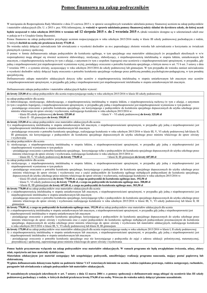 Pomoc finansowa na zakup podręczników W nawiązaniu do Rozporządzenia Rady Ministrów z dnia 23 czerwca 2015 r. w sprawie szczegółowych warunków udzielania pomocy finansowej uczniom na zakup podręczników i materiałów edukacyjnych (Dz. U. z 2015 r. poz. 938) informujemy, że wnioski w sprawie udzielania pomocy finansowej należy składać do dyrektora szkoły, do której uczeń będzie uczęszczał w roku szkolnym 2015/2016 w terminie od 12 sierpnia 2015 r. do 2 września 2015 r. (druki wniosków dostępne są w sekretariatach szkół oraz w pokoju nr 6 w Urzędzie Gminy Burzenin). Pomoc finansowa na zakup podręczników przysługuje uczniom rozpoczynającym w roku szkolnym 2015/2016 naukę w klasie III szkoły podstawowej pochodzącym z rodzin, w których dochód na osobę nie przekracza kwoty 574,00 zł. Do wniosku należy dołączyć zaświadczenie lub oświadczenie o wysokości dochodów za m-c poprzedzający złożenie wniosku lub zaświadczenie o korzystaniu ze świadczeń pieniężnych z pomocy społecznej. O pomoc w formie dofinansowania zakupu podręczników do kształcenia ogólnego, w tym specjalnego oraz materiałów edukacyjnych (w przypadkach określonych w w/w rozporządzeniu) mogą ubiegać się również uczniowie słabowidzący, niesłyszący, słabosłyszący, z niepełnosprawnością intelektualną w stopniu lekkim, umiarkowanym lub znacznym, z niepełnosprawnością ruchową (w tym z afazją), z autyzmem (w tym z zespołem Aspergera) oraz uczniowie z niepełnosprawnościami sprzężonymi, w przypadku, gdy jedną z niepełnosprawności jest niepełnosprawność wymieniona wyżej, posiadający orzeczenie o potrzebie kształcenia specjalnego, o którym mowa w art. 71 b ust. 3 ustawy z dnia 7 września 1991 r. o systemie oświaty, uczęszczający w roku szkolnym 2015/2016 do szkoły podstawowej lub gimnazjum. W tym przypadku do wniosku zamiast zaświadczenia o wysokości dochodów należy dołączyć kopię orzeczenia o potrzebie kształcenia specjalnego wydanego przez publiczną poradnię psychologiczno-pedagogiczną, w tym poradnię specjalistyczną. Dofinansowanie zakupu materiałów edukacyjnych dotyczy tylko uczniów z niepełnosprawnością intelektualną w stopniu umiarkowanym lub znacznym oraz uczniów z niepełnosprawnościami sprzężonymi, w przypadku gdy jedną z niepełnosprawności jest niepełnosprawność intelektualna w stopniu umiarkowanym lub znacznym. Dofinansowanie zakupu podręczników i materiałów edukacyjnych będzie wynosić: do kwoty 225,00 zł na zakup podręczników dla ucznia rozpoczynającego naukę w roku szkolnym 2015/2016 w klasie III szkoły podstawowej na zakup podręczników dla ucznia 1) słabowidzącego, niesłyszącego, słabosłyszącego, z niepełnosprawnością intelektualną w stopniu lekkim, z niepełnosprawnością ruchową (w tym z afazją), z autyzmem (w tym z zespołem Aspergera), z niepełnosprawnościami sprzężonymi, w przypadku gdy jedną z niepełnosprawności jest niepełnosprawność wymieniona w tym punkcie - posiadającego orzeczenie o potrzebie kształcenia specjalnego, nie korzystającego z podręczników do kształcenia specjalnego dopuszczonych do użytku szkolnego przez ministra właściwego do spraw oświaty i wychowania, realizującego kształcenie w roku szkolnym 2015/2016 w: ▫ klasie III szkoły podstawowej do kwoty 225,00 zł ▫ klasie V – VI szkoły podstawowej do kwoty 325,00 zł ▫ klasie II - III gimnazjum do kwoty 350,00 zł do kwoty 225,00 zł na zakup podręczników oraz materiałów edukacyjnych dla ucznia 1) z niepełnosprawnością intelektualną w stopniu umiarkowanym lub znacznym, z niepełnosprawnościami sprzężonymi, w przypadku gdy jedną z niepełnosprawności jest niepełnosprawność intelektualna w stopniu umiarkowanym lub znacznym - posiadającego orzeczenie o potrzebie kształcenia specjalnego, realizującego kształcenie w roku szkolnym 2015/2016 w klasie III, V, VI szkoły podstawowej lub klasie II, III gimnazjum, nie korzystającego z podręczników do kształcenia specjalnego dopuszczonych do użytku szkolnego przez ministra właściwego do spraw oświaty i wychowania na zakup podręczników dla ucznia 1) niesłyszącego, z niepełnosprawnością intelektualną w stopniu lekkim, z niepełnosprawnościami sprzężonymi, w przypadku gdy jedną z niepełnosprawności jest niepełnosprawność wymieniona w tym punkcie - posiadającego orzeczenie o potrzebie kształcenia specjalnego, korzystającego tylko z podręczników do kształcenia specjalnego dopuszczonych do użytku szkolnego przez ministra właściwego do spraw oświaty i wychowania, realizującego kształcenie w roku szkolnym 2015/2016 w: ▫ klasie III, V, VI szkoły podstawowej do kwoty 770,00 zł ▫ klasie II, III gimnazjum do kwoty 607,00 zł na zakup podręczników dla ucznia 1) niesłyszącego, z niepełnosprawnością intelektualną w stopniu lekkim, z niepełnosprawnościami sprzężonymi, w przypadku gdy jedną z niepełnosprawności jest niepełnosprawność wymieniona w tym punkcie - posiadającego orzeczenie o potrzebie kształcenia specjalnego, korzystającego z podręczników do kształcenia specjalnego dopuszczonych do użytku szkolnego przez ministra właściwego do spraw oświaty i wychowania oraz z części podręczników do kształcenia ogólnego niebędących podręcznikami do kształcenia specjalnego, dopuszczonych do użytku szkolnego przez ministra właściwego do spraw oświaty i wychowania, realizującego kształcenie w roku szkolnym 2015/2016 w: ▫ klasie III szkoły podstawowej do kwoty 770,00 zł, z czego na podręczniki do kształcenia ogólnego max. 192,50 zł ▫ klasie V, VI szkoły podstawowej do kwoty 770,00 zł, z czego na podręczniki do kształcenia ogólnego max. 308,00 zł ▫ klasie II, III gimnazjum do kwoty 607,00 zł, z czego na podręczniki do kształcenia ogólnego max. 303,50 zł do kwoty 770,00 zł na zakup podręczników oraz materiałów edukacyjnych dla u