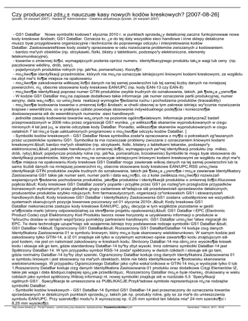 Czy producenci zd±¿± nauczuæ kasy nowych kodów kreskowych? [2007-08-26] (pi±tek, 24 sierpieñ 2007) - Nades³a³ Administrator - Ostatnia aktualizacja (pi±tek, 24 sierpieñ 2007) - GS1 DataBar Nowe symboliki kodowe1 stycznia 2010 r. w punktach sprzeda¿y detalicznej zaczn± funkcjonowaæ nowe kody kreskowe – GS1 DataBar. Oznacza to, ¿e do tej daty wszystkie sieci handlowe i inne sklepy detaliczne musz± byæ przygotowane organizacyjnie i technicznie do poprawnego odczytu i interpretowania kodów DataBar. ZastosowanieNowe kody zosta³y opracowane w celu rozwi±zania problemów zwi±zanych z kodowaniem: - bardzo ma³ych obiektów (np. strzykawki, fiolki, blistry z tabletkami, podzespo³y elektroniczne, elementy telekomunikacyjne), - towarów o zmiennej ilo¶ci, wymagaj±cych podania oprócz numeru identyfikacyjnego produktu tak¿e wagi lub ceny (np. paczkowane wêdliny, drób, sery), - pojedynczych produktów rolnych (np. jab³ka, pomarañcze). Korzy¶ci - mo¿liwo¶æ identyfikacji przedmiotów, których nie mo¿na oznaczyæ istniej±cymi liniowymi kodami kreskowymi, ze wzglêdu na zbyt ma³± ilo¶æ miejsca na opakowaniu - mo¿liwo¶æ zakodowania wiêkszej ilo¶ci danych na tej samej powierzchni lub tej samej liczby danych na mniejszej powierzchni, ni¿ obecnie stosowane kody kreskowe EAN/UPC (np. kody EAN-13 czy EAN-8) - mo¿liwo¶æ identyfikacji poprzez numer GTIN produktów zwykle trudnych do oznakowania, takich, jak ¶wie¿a ¿ywno¶æ - W kodzie GS1 DataBar mo¿na zapisaæ dodatkowo takie informacje jak numer oznaczenie partii produkcyjnej, numer seryjny, data wa¿no¶ci, co umo¿liwia realizacji wymogów ¶ledzenia ruchu i pochodzenia produktów (traceability) - mo¿liwo¶æ kodowania towarów o zmiennej ilo¶ci – w chwili obecnej w tym zakresie istniej± wy³±cznie rozwi±zania krajowe i wewnêtrzne, co w praktyce czêsto powoduje stosowanie indywidualnego podej¶cia i konieczno¶æ dostosowywania siê do wewnêtrznych numerów sieci handlowych - jednolite zasady kodowania towarów wa¿onych na poziomie ogólno¶wiatowym. Informacje praktyczneZ badañ przeprowadzonych w 2006 roku przez organizacjê GS1 wynika, ¿e wiêkszo¶æ skanerów wyprodukowanych w ci±gu minionych 4 lat jest ju¿ w stanie odczytaæ kody DataBar. Ponadto, wiêkszo¶æ skanerów wyprodukowanych w ci±gu ostatnich 7 lat mo¿e byæ uaktualnionych programowo o mo¿liwo¶æ odczytu kodów DataBar. ] - Symboliki kodów kreskowych - GS1 DataBar Nowa symbolika zosta³a opracowana z my¶l± o potrzebach zg³aszanych przez uczestników systemu GS1. Symbolika ta ma rozwi±zaæ problemy zwi±zane z oznaczaniem liniowymi kodami kreskowymi:• bardzo ma³ych obiektów (np. strzykawki, fiolki, blistery z tabletkami lekarstw, podzespo³y elektroniczne),• jednostek handlowych o zmiennej ilo¶ci, wymagaj±cych pe³nej identyfikacji produktu (np. miêso, drób, ryby),• pojedyncze produkty rolne (np. jab³ka, pomarañcze, brzoskwinie).Symboliki te mog± byæ stosowane do identyfikacji przedmiotów, których nie mo¿na oznaczyæ istniej±cymi liniowymi kodami kreskowymi ze wzglêdu na zbyt ma³± ilo¶æ miejsca na opakowaniu.Kody kreskowe GS1 DataBar mog± zawieraæ wiêcej danych na tej samej powierzchni lub t± sam± liczbê danych na mniejszej powierzchni ni¿ obecnie stosowane kody kreskowe EAN/UPC.RSS umo¿liwia identyfikacjê GTIN produktów zwykle trudnych do oznakowania, takich jak ¶wie¿a ¿ywno¶æ i mo¿e zawieraæ Identyfikatory Zastosowania GS1 takie jak numer serii, numer partii i data wa¿no¶ci, co z kolei zwiêksza mo¿liwo¶ci rozwi±zañ wspieraj±cych ¶ledzenie pochodzenia produktów, jako¶æ produktów i identyfikacjê produktów o zmiennej ilo¶ci.Kluczowe pojêcia:• Kody kreskowe GS1 DataBar zosta³y poparte i przyjête przez GS1 po rozleg³ym przegl±dzie przypadków biznesowych wykonanych przez globalne grupy zadaniowe sk³adaj±ce siê przedstawicieli sprzedawców detalicznych, producentów produktów szybko rotuj±cych, firm farmaceutycznych, organizacji cz³onkowskich GS1 i stowarzyszeñ handlowych;• Kody kreskowe GS1 DataBar i Identyfikatory Zastosowania GS1 zostan± udostêpnione we wszystkich systemach skanuj±cych pozycje towarowe pocz±wszy od 01 stycznia 2010r.;• Kody kreskowe GS1 DataBar niekoniecznie zast±pi± kody kreskowe EAN/UPC, gdy¿ decyzja w tym wzglêdzie pozostanie w gestii w³a¶ciciela marki (strony odpowiedzialnej za okre¶lenie projektu opakowania);• GS1 DataBar i EPC (Electronic Product Code) czyli Elektroniczny Kod Produktu tworz± nowe horyzonty w uzyskiwaniu informacji o produkcie w ³añcuchu dostaw w ramach wspó³pracy pomiêdzy partnerami handlowymi. GS1 DataBar umo¿liwi ³atw± migracjê do EPC. Te dwie technologie uzupe³niaj± siê wzajemnie.Istniej± trzy podstawowe rodzaje symboliki GS1 DataBar:• GS1 DataBar-14• Ograniczony GS1 DataBar• Rozszerzony GS1 DataBarDataBar-14 koduje ci±g danych Identyfikatora Zastosowania 01 w symbolu liniowym, który mo¿e byæ skanowany wielokierunkowo. W samym kodzie jest zakodowany tylko GTIN-14, a IZ 01 znajduje siê tylko w czytelnym wzrokowo opisie zawarto¶ci kodu znajduj±cym siê pod kodem, nie jest on natomiast zakodowany w kreskach kodu. Skrócony DataBar-14 ma obni¿on± wysoko¶æ kresek kodu i stosuje siê go tam, gdzie standardowy DataBar-14 by³by zbyt wysoki. Inn± odmian± symboliki DataBar-14 jest Spiêtrzony DataBar-14. W tym przypadku symbol RSS-14 zosta³ spiêtrzony w dwóch rzêdach i stosuje siê go tam, gdzie normalny DataBar-14 by³by zbyt szeroki. Ograniczony DataBar koduje ci±g danych Identyfikatora Zastosowania 01 w symbolu liniowym i jest stosowany na ma³ych obiektach, które nie bêd± identyfikowane w ¶rodowisku skanowania wielokierunkowego. W przypadku Ograniczonego DataBar jako cyfra wska¼nikowa w GTIN-14 mo¿e wyst±piæ tylko 0 lub 1.Rozszerzony DataBar koduje ci±g danych Identyfikatora Zastosowania 01 produktu oraz dodatkowe Ci±gi Elementów IZ, takie jak 