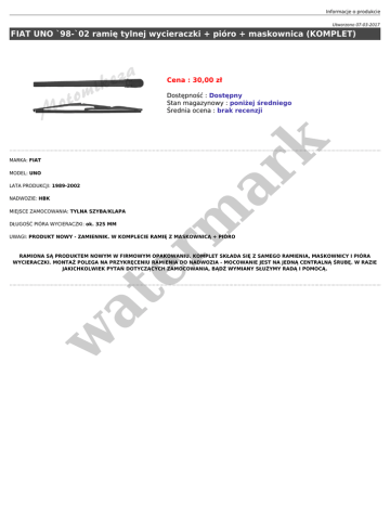 Informacje o produkcie Utworzono 07-03-2017 FIAT UNO `98-`02 ramię tylnej wycieraczki + pióro + maskownica (KOMPLET) Cena : 30,00 zł MARKA: FIAT MODEL: UNO LATA PRODUKCJI: 1989-2002 NADWOZIE: HBK er m ar k Dostępność : Dostępny Stan magazynowy : poniżej średniego Średnia ocena : brak recenzji MIEJSCE ZAMOCOWANIA: TYLNA SZYBA/KLAPA DŁUGOŚĆ PIÓRA WYCIERACZKI: ok. 325 MM UWAGI: PRODUKT NOWY - ZAMIENNIK. W KOMPLECIE RAMIĘ Z MASKOWNICĄ + PIÓRO w at RAMIONA SĄ PRODUKTEM NOWYM W FIRMOWYM OPAKOWANIU. KOMPLET SKŁADA SIĘ Z SAMEGO RAMIENIA, MASKOWNICY I PIÓRA WYCIERACZKI. MONTAŻ POLEGA NA PRZYKRĘCENIU RAMIENIA DO NADWOZIA - MOCOWANIE JEST NA JEDNĄ CENTRALNĄ ŚRUBĘ. W RAZIE JAKICHKOLWIEK PYTAŃ DOTYCZĄCYCH ZAMOCOWANIA, BĄDŻ WYMIANY SŁUŻYMY RADĄ I POMOCĄ.