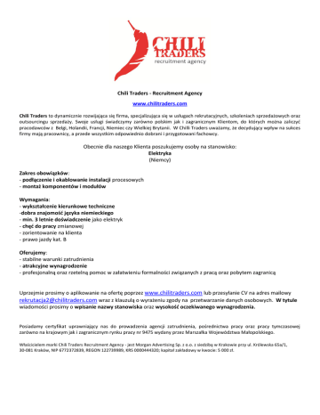 Chili Traders - Recruitment Agency www.chilitraders.com Chili Traders to dynamicznie rozwijająca się firma, specjalizująca się w usługach rekrutacyjnych, szkoleniach sprzedażowych oraz outsourcingu sprzedaży. Swoje usługi świadczymy zarówno polskim jak i zagranicznym Klientom, do których można zaliczyd pracodawców z Belgi, Holandii, Francji, Niemiec czy Wielkiej Brytanii. W Chilli Traders uważamy, że decydujący wpływ na sukces firmy mają pracownicy, a przede wszystkim odpowiednio dobrani i przygotowani fachowcy. Obecnie dla naszego Klienta poszukujemy osoby na stanowisko: Elektryka (Niemcy) Zakres obowiązków: - podłączenie i okablowanie instalacji procesowych - montaż komponentów i modułów Wymagania: - wykształcenie kierunkowe techniczne -dobra znajomośd języka niemieckiego - min. 3 letnie doświadczenie jako elektryk - chęd do pracy zmianowej - zorientowanie na klienta - prawo jazdy kat. B Oferujemy: - stabilne warunki zatrudnienia - atrakcyjne wynagrodzenie - profesjonalną oraz rzetelną pomoc w załatwieniu formalności związanych z pracą oraz pobytem zagranicą Uprzejmie prosimy o aplikowanie na ofertę poprzez www.chilitraders.com lub przesyłanie CV na adres mailowy [email protected] wraz z klauzulą o wyrażeniu zgody na przetwarzanie danych osobowych. W tytule wiadomości prosimy o wpisanie nazwy stanowiska oraz wysokośd oczekiwanego wynagrodzenia. Posiadamy certyfikat uprawniający nas do prowadzenia agencji zatrudnienia, pośrednictwa pracy oraz pracy tymczasowej zarówno na krajowym jak i zagranicznym rynku pracy nr 9475 wydany przez Marszałka Województwa Małopolskiego. Właścicielem marki Chili Traders Recruitment Agency - jest Morgan Advertising Sp. z o.o. z siedzibą w Krakowie przy ul. Królewska 65a/1, 30-081 Kraków, NIP 6772372839, REGON 122739989, KRS 0000444320; kapitał zakładowy w kwocie: 5 000 zł.