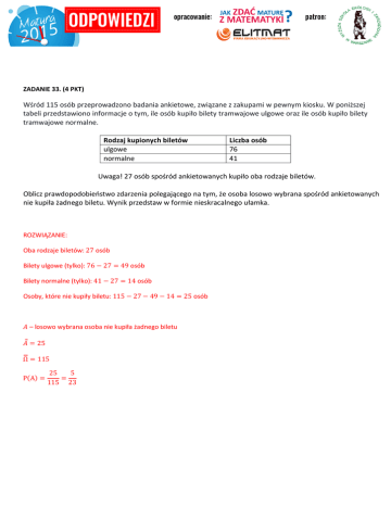 ZADANIE 33. (4 PKT) Wśród 115 osób przeprowadzono badania ankietowe, związane z zakupami w pewnym kiosku. W poniższej tabeli przedstawiono informacje o tym, ile osób kupiło bilety tramwajowe ulgowe oraz ile osób kupiło bilety tramwajowe normalne. Rodzaj kupionych biletów ulgowe normalne Liczba osób 76 41 Uwaga! 27 osób spośród ankietowanych kupiło oba rodzaje biletów. Oblicz prawdopodobieństwo zdarzenia polegającego na tym, że osoba losowo wybrana spośród ankietowanych nie kupiła żadnego biletu. Wynik przedstaw w formie nieskracalnego ułamka. ROZWIĄZANIE: Oba rodzaje biletów: 27 osób Bilety ulgowe (tylko): 76 − 27 = 49 osób Bilety normalne (tylko): 41 − 27 = 14 osób Osoby, które nie kupiły biletu: 115 − 27 − 49 − 14 = 25 osób 𝐴 – losowo wybrana osoba nie kupiła żadnego biletu 𝐴̿ = 25 ̿ = 115 Ω P(A) = 25 5 = 115 23