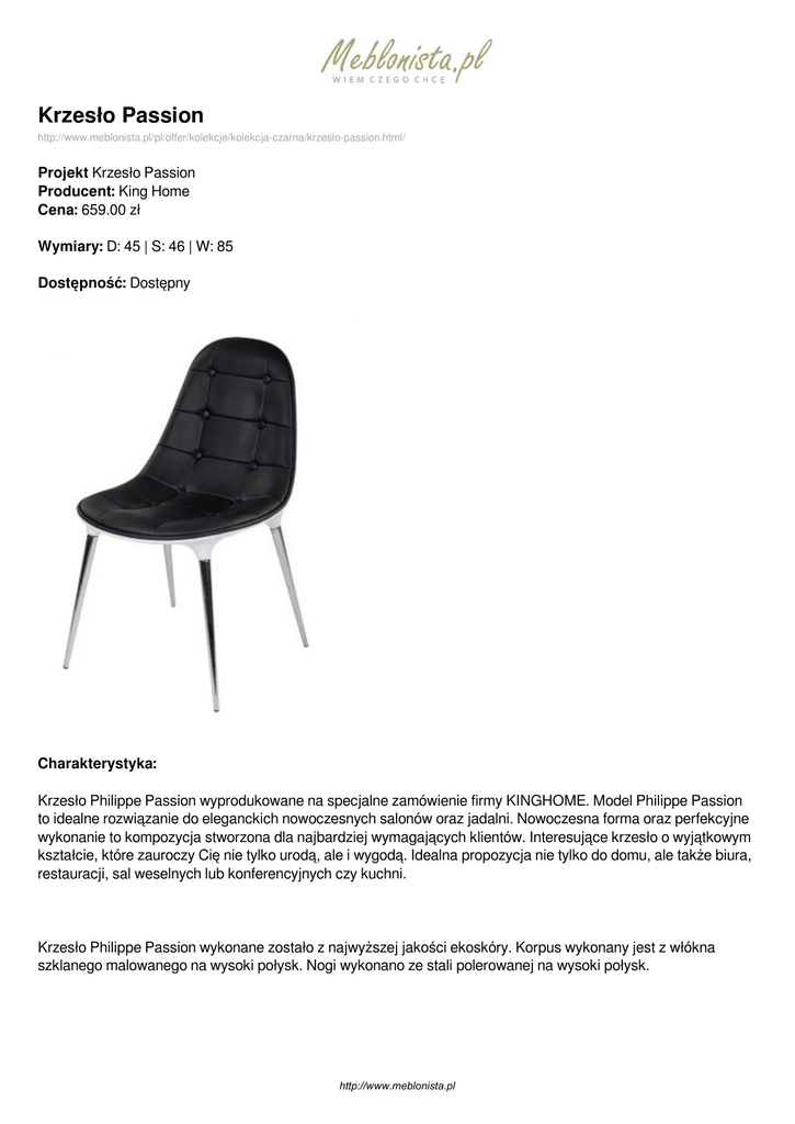 Krzesło Passion http://www.meblonista.pl/pl/offer/kolekcje/kolekcja-czarna/krzeslo-passion.html/ Projekt Krzesło Passion Producent: King Home Cena: 659.00 zł Wymiary: D: 45 | S: 46 | W: 85 Dostępność: Dostępny Charakterystyka: Krzesło Philippe Passion wyprodukowane na specjalne zamówienie firmy KINGHOME. Model Philippe Passion to idealne rozwiązanie do eleganckich nowoczesnych salonów oraz jadalni. Nowoczesna forma oraz perfekcyjne wykonanie to kompozycja stworzona dla najbardziej wymagających klientów. Interesujące krzesło o wyjątkowym kształcie, które zauroczy Cię nie tylko urodą, ale i wygodą. Idealna propozycja nie tylko do domu, ale także biura, restauracji, sal weselnych lub konferencyjnych czy kuchni. Krzesło Philippe Passion wykonane zostało z najwyższej jakości ekoskóry. Korpus wykonany jest z włókna szklanego malowanego na wysoki połysk. Nogi wykonano ze stali polerowanej na wysoki połysk. http://www.meblonista.pl Za dopłatą istnieje możliwość wykonania nóg w kolorze czarnym lub białym połysk/mat. W swojej ofercie posiadamy także fotele i hokery. http://www.meblonista.pl Dostępne wersje produktu: nazwa produktu Krzesło Passion warianty eko-skóra biała, korpus biały połysk, nogi chrom cena 659.00zł dostępne Dostępny Krzesło Passion eko-skóra czarna, 659.00zł korpus czarny połysk, nogi chrom Dostępny Krzesło Passion eko-skóra czarna, korpus biały połysk, nogi chrom Dostępny 659.00zł http://www.meblonista.pl Zdjęcia produktu: http://www.meblonista.pl Powered by TCPDF (www.tcpdf.org)