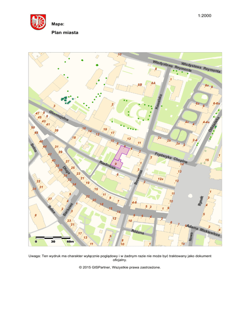 1:2000 Mapa: Plan miasta Uwaga: Ten wydruk ma charakter wyłącznie poglądowy i w żadnym razie nie może być traktowany jako dokument oficjalny. © 2015 GISPartner, Wszystkie prawa zastrzeżone.