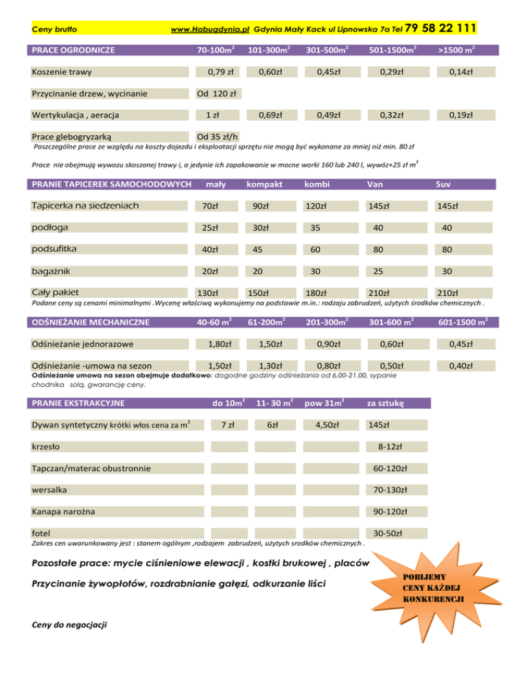 Ceny brutto www.Habugdynia.pl Gdynia Mały Kack ul Lipnowska 7a Tel 79 PRACE OGRODNICZE Koszenie trawy Przycinanie drzew, wycinanie Wertykulacja , aeracja Prace glebogryzarką 70-100m2 0,79 zł 58 22 111 101-300m2 301-500m2 501-1500m2 >1500 m2 0,60zł 0,45zł 0,29zł 0,14zł 0,69zł 0,49zł 0,32zł 0,19zł Od 120 zł 1 zł Od 35 zł/h Poszczególne prace ze względu na koszty dojazdu i eksploatacji sprzętu nie mogą być wykonane za mniej niż min. 80 zł Prace nie obejmują wywozu skoszonej trawy i, a jedynie ich zapakowanie w mocne worki 160 lub 240 l, wywóz+25 zł m3 PRANIE TAPICEREK SAMOCHODOWYCH mały kompakt kombi Van Suv Tapicerka na siedzeniach 70zł 90zł 120zł 145zł 145zł podłoga 25zł 30zł 35 40 40 podsufitka 40zł 45 60 80 80 bagażnik 20zł 20 30 25 30 130zł 150zł 180zł 210zł 210zł Cały pakiet Podane ceny są cenami minimalnymi .Wycenę właściwą wykonujemy na podstawie m.in.: rodzaju zabrudzeń, użytych środków chemicznych . ODŚNIEŻANIE MECHANICZNE 40-60 m2 61-200m2 201-300m2 301-600 m2 601-1500 m2 Odśnieżanie jednorazowe 1,80zł 1,50zł 0,90zł 0,60zł 0,45zł Odśnieżanie -umowa na sezon 1,50zł 1,30zł 0,80zł 0,50zł 0,40zł Odśnieżanie umowa na sezon obejmuje dodatkowo: dogodne godziny odśnieżania od 6.00-21.00, sypanie chodnika solą, gwarancję ceny. PRANIE EKSTRAKCYJNE Dywan syntetyczny krótki włos cena za m2 do 10m2 11- 30 m2 pow 31m2 7 zł 6zł 4,50zł za sztukę 145zł krzesło 8-12zł Tapczan/materac obustronnie 60-120zł wersalka 70-130zł Kanapa narożna 90-120zł fotel 30-50zł Zakres cen uwarunkowany jest : stanem ogólnym ,rodzajem zabrudzeń, użytych srodków chemicznych . Pozostałe prace: mycie ciśnieniowe elewacji , kostki brukowej , placów Przycinanie żywopłotów, rozdrabnianie gałęzi, odkurzanie liści Ceny do negocjacji POBIJEMY CENY KAŻDEJ KONKURENCJI