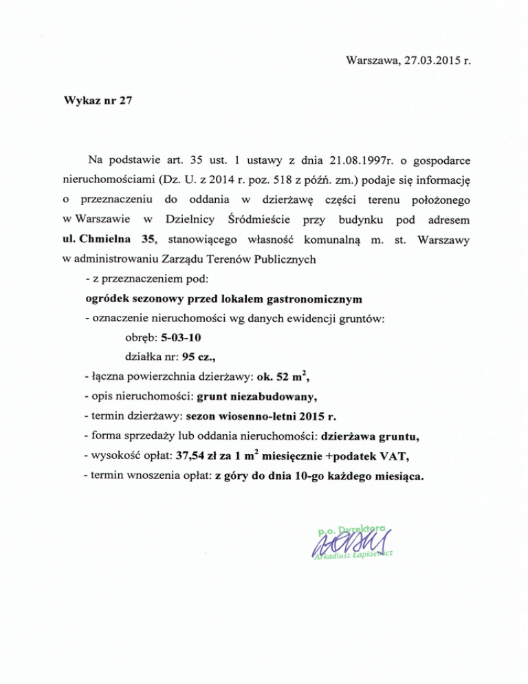 Warszawa, 27.03.2015 r. Wykaz nr 27 Na podstawie art. 35 ust. 1 ustawy z dnia 21.08.1997r. o gospodarce nieruchomościami (Dz. U. z 2014 r. poz. 518 z późń. zm.) podaje się informację o przeznaczemu do oddania w w Warszawie w Dzielnicy ul. Chmielna 35, stanowiącego dzierżawę Śródmieście własność części przy terenu budynku komunalną m. położonego pod st. adresem Warszawy w administrowaniu Zarządu Terenów Publicznych - z przeznaczeniem pod: ogródek sezonowy przed lokalem gastronomicznym - oznaczenie nieruchomości wg danych ewidencji gruntów: obręb: 5-03-10 działka nr: 95 cz., - łączna powierzchnia dzierżawy: ok. 52 m2, - opis nieruchomości: grunt niezabudowany, - termin dzierżawy: sezon wiosenno-letni 2015 r. - forma sprzedaży lub oddania nieruchomości: dzierżawa gruntu, - wysokość opłat: 37,54 zł za l m2 miesięcznie +podatek VAT, - termin wnoszenia opłat: z góry do dnia lO-go każdego miesiąca.