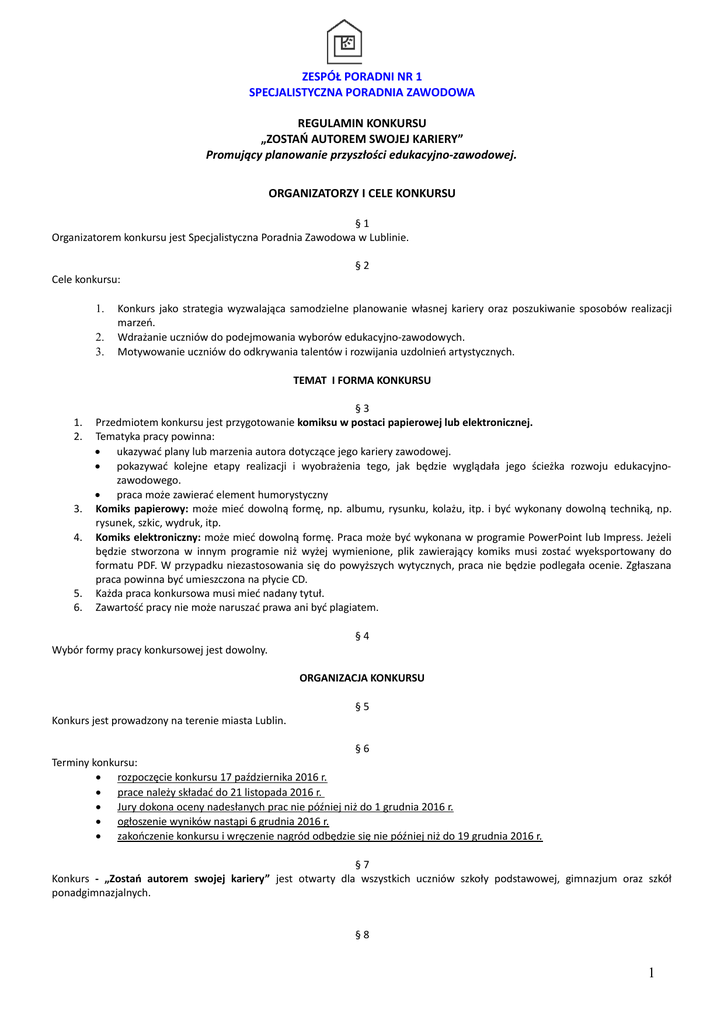 ZESPÓŁ PORADNI NR 1 SPECJALISTYCZNA PORADNIA ZAWODOWA REGULAMIN KONKURSU „ZOSTAŃ AUTOREM SWOJEJ KARIERY” Promujący planowanie przyszłości edukacyjno-zawodowej. ORGANIZATORZY I CELE KONKURSU §1 Organizatorem konkursu jest Specjalistyczna Poradnia Zawodowa w Lublinie. §2 Cele konkursu: 1. 2. 3. Konkurs jako strategia wyzwalająca samodzielne planowanie własnej kariery oraz poszukiwanie sposobów realizacji marzeń. Wdrażanie uczniów do podejmowania wyborów edukacyjno-zawodowych. Motywowanie uczniów do odkrywania talentów i rozwijania uzdolnień artystycznych. TEMAT I FORMA KONKURSU 1. 2. 3. 4. 5. 6. §3 Przedmiotem konkursu jest przygotowanie komiksu w postaci papierowej lub elektronicznej. Tematyka pracy powinna: ukazywać plany lub marzenia autora dotyczące jego kariery zawodowej. pokazywać kolejne etapy realizacji i wyobrażenia tego, jak będzie wyglądała jego ścieżka rozwoju edukacyjnozawodowego. praca może zawierać element humorystyczny Komiks papierowy: może mieć dowolną formę, np. albumu, rysunku, kolażu, itp. i być wykonany dowolną techniką, np. rysunek, szkic, wydruk, itp. Komiks elektroniczny: może mieć dowolną formę. Praca może być wykonana w programie PowerPoint lub Impress. Jeżeli będzie stworzona w innym programie niż wyżej wymienione, plik zawierający komiks musi zostać wyeksportowany do formatu PDF. W przypadku niezastosowania się do powyższych wytycznych, praca nie będzie podlegała ocenie. Zgłaszana praca powinna być umieszczona na płycie CD. Każda praca konkursowa musi mieć nadany tytuł. Zawartość pracy nie może naruszać prawa ani być plagiatem. §4 Wybór formy pracy konkursowej jest dowolny. ORGANIZACJA KONKURSU §5 Konkurs jest prowadzony na terenie miasta Lublin. §6 Terminy konkursu: rozpoczęcie konkursu 17 października 2016 r. prace należy składać do 21 listopada 2016 r. Jury dokona oceny nadesłanych prac nie później niż do 1 grudnia 2016 r. ogłoszenie wyników nastąpi 6 grudnia 2016 r. zakończenie konkursu i wręczenie nagród odbędzie się nie później niż do 19 grudnia 2016 r. §7 Konkurs - „Zostań autorem swojej kariery” jest otwarty dla wszystkich uczniów szkoły podstawowej, gimnazjum oraz szkół ponadgimnazjalnych. §8 1 W konkursie biorą udział prace realizowane samodzielnie, wykonane pod kierunkiem nauczyciela, podpisane przez nauczyciela i opatrzone pieczątką szkoły. §9 Zgłoszenia prac do konkursu może dokonać właściwa dla ucznia szkoła. Jedna osoba może przygotować tylko jedną pracę, ilość prac przesłanych ze szkoły nie jest ograniczona. § 10 Udział w konkursie jest dobrowolny. § 11 Regulamin Konkursu oraz Karta Zgłoszenia zostaną udostępnione na stronach internetowych: Specjalistycznej Poradni Zawodowej w Lublinie (www.zp1.lublin.pl) WARUNKI UDZIAŁU W KONKURSIE § 12 1. Zgłoszenie udziału w konkursie odbywa się poprzez wypełnienie Karty Zgłoszenia przez szkołę i przekazanie jej razem z pracami do Specjalistycznej Poradni Zawodowej przy ulicy Magnoliowej 8. 2. Zgłoszenie pracy do konkursu przez szkołę jest równoznaczne z udzieleniem zgody rodzica lub prawnego opiekuna uczestnika konkursu na jego udział w konkursie. 3. Prace zgłoszone do konkursu nie będą zwracane, przechodzą na własność Organizatorów i mogą być wykorzystywane bez ograniczeń nieodpłatnie. § 13 Prace należy składać w terminie do 21 listopada 2016 r. pod adresem: Specjalistyczna Poradnia Zawodowa w Lublinie, ul. Magnoliowa 8, tel. (81) 747 -35- 26, od poniedziałku do piątku, w godzinach od 8.00 do 18.00, w sekretariacie placówki. JURY I NAGRODY § 14 Prace będą oceniane przez Jury w składzie określonym przez Organizatorów. § 15 Jury dokona oceny nadesłanych prac oraz przyzna wyróżnienia. Nagrodą główną w konkursie jest publikacja pracy na stronie internetowej Specjalistycznej Poradni Zawodowej. § 16 Ocena będzie dokonana wg następujących równoważnych kryteriów: 1. 2. 3. Zgodność z tematem konkursu. Oryginalne i interesujące ujęcie tematu. Estetyka formy przekazu. § 17 Laureaci zostaną powiadomieni o wynikach konkursu za pośrednictwem szkoły. Wyniki będą podane również na stronie internetowej Specjalistycznej Poradni Zawodowej w Lublinie. § 18 Organizator zastrzega sobie prawo do: 1. Zmiany terminu zakończenia konkursu oraz pozostałych terminów. 2. Zmian w niniejszym regulaminie. 3. Opublikowania wybranych prac i podania nazwisk autorów. Organizator: Dyrektor SPZ w Lublinie Anna Morow 2