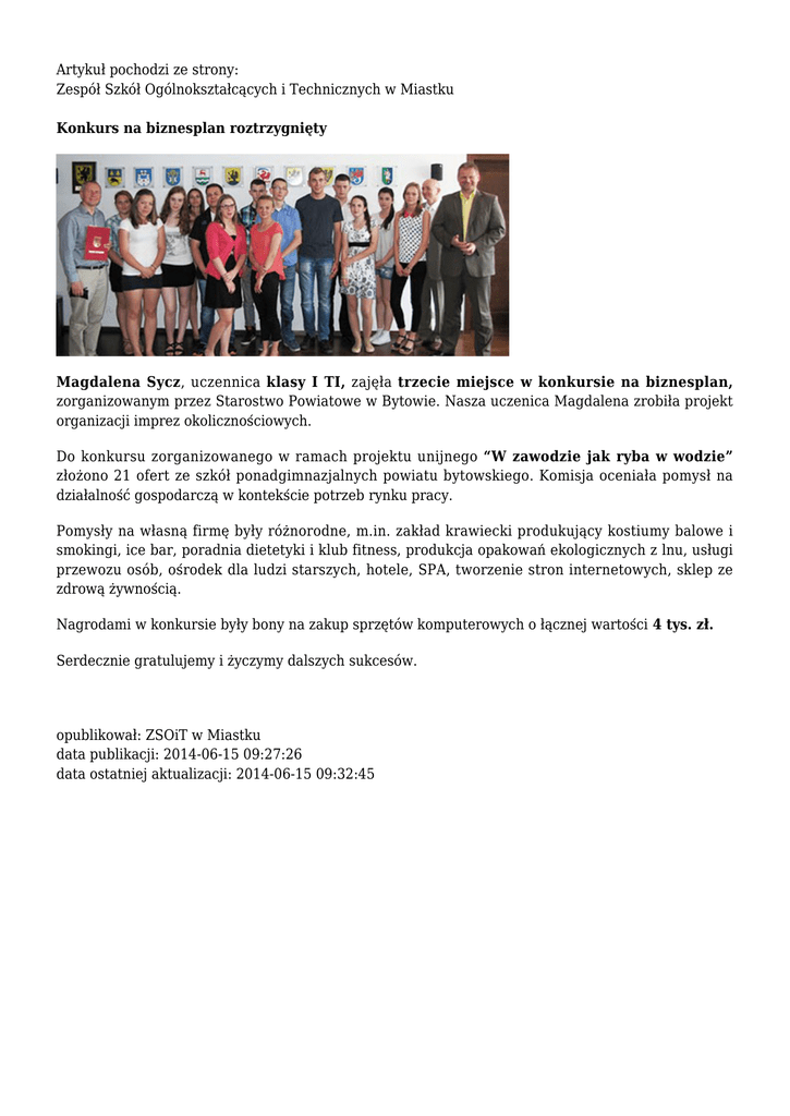 Artykuł pochodzi ze strony: Zespół Szkół Ogólnokształcących i Technicznych w Miastku Konkurs na biznesplan roztrzygnięty Magdalena Sycz, uczennica klasy I TI, zajęła trzecie miejsce w konkursie na biznesplan, zorganizowanym przez Starostwo Powiatowe w Bytowie. Nasza uczenica Magdalena zrobiła projekt organizacji imprez okolicznościowych. Do konkursu zorganizowanego w ramach projektu unijnego “W zawodzie jak ryba w wodzie” złożono 21 ofert ze szkół ponadgimnazjalnych powiatu bytowskiego. Komisja oceniała pomysł na działalność gospodarczą w kontekście potrzeb rynku pracy. Pomysły na własną firmę były różnorodne, m.in. zakład krawiecki produkujący kostiumy balowe i smokingi, ice bar, poradnia dietetyki i klub fitness, produkcja opakowań ekologicznych z lnu, usługi przewozu osób, ośrodek dla ludzi starszych, hotele, SPA, tworzenie stron internetowych, sklep ze zdrową żywnością. Nagrodami w konkursie były bony na zakup sprzętów komputerowych o łącznej wartości 4 tys. zł. Serdecznie gratulujemy i życzymy dalszych sukcesów. opublikował: ZSOiT w Miastku data publikacji: 2014-06-15 09:27:26 data ostatniej aktualizacji: 2014-06-15 09:32:45