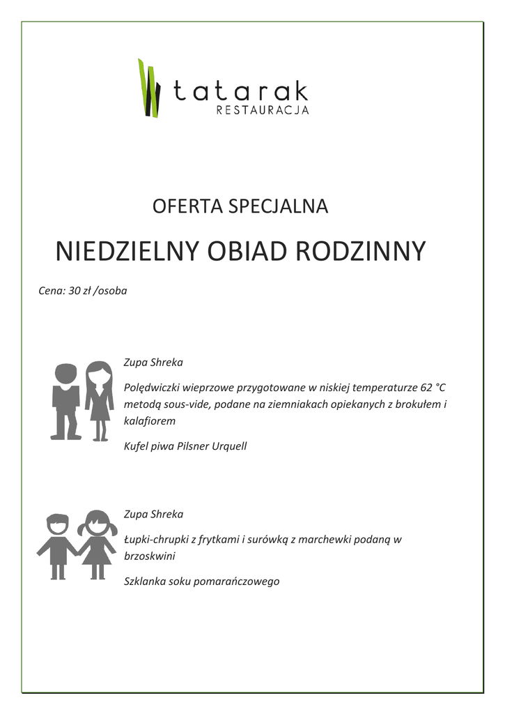 OFERTA SPECJALNA NIEDZIELNY OBIAD RODZINNY Cena: 30 zł /osoba Zupa Shreka Polędwiczki wieprzowe przygotowane w niskiej temperaturze 62 °C metodą sous-vide, podane na ziemniakach opiekanych z brokułem i kalafiorem Kufel piwa Pilsner Urquell Zupa Shreka Łupki-chrupki z frytkami i surówką z marchewki podaną w brzoskwini Szklanka soku pomarańczowego