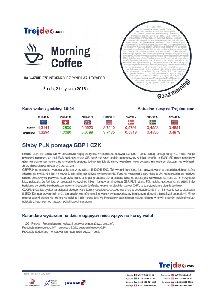 Środa, 21 stycznia 2015 r. Kursy walut z godziny: 10:24 KUPNO SPRZEDAŻ Aktualne kursy na Trejdoo.com EUR/PLN CHF/PLN GBP/PLN USD/PLN DKK/PLN SEK/PLN NOK/PLN 4,3141 4,3294 4,2900 4,3080 5,6520 5,6799 3,7240 3,7435 0,5791 0,5819 0,4553 0,4585 0,4851 0,4879 Słaby PLN pomaga GBP i CZK Kolejne plotki na temat QE w eurolandzie krążą po rynku. Wspomniana decyzja już jutro i coraz więcej emocji na rynku. Wells Fargo przekazał prognozę, że jeśli ECB zaskoczy skalą QE, bądź też rynek będzie rozczarowany w jakiś sposób, to EUR/USD może podejść w górę. Na pewno jest szansa na umocnienie złotego, jednak tak jak pisaliśmy wcześniej, taka sytuacja ma miejsce pierwszy raz w historii Strefy Euro, dlatego trzeba być ostrożnym. GBP/PLN od początku tygodnia waha się w przedziale 5,6200-5,6900. Tak wysoki kurs funta jest spowodowany tą słabością złotego, którą widzimy na rynku. Nie jest to nowość, ale takie jest jedyne wytłumaczenie. Funt na rynku jest słaby, dane z UK rozczarowują za każdym razem, perspektywa podwyżki stóp przed Bank of England oddaliła się, a słabość funta do dolara jest największa od lipca 2013. Powyższe fakty pokazują, że funt jest w najgorszej kondycji od kilku miesięcy, a mimo tego GBP/PLN rośnie. Póki polska gospodarka nie odbije i nie będziemy co chwilę bombardowani nowymi kłopotami (deflacja, kryzys na Ukrainie, wzrost CHF), to ta sytuacja nie ulegnie zmianie. CZK/PLN również zyskał na słabości złotego. Kurs korony czeskiej do złotego waha się w okolicach 0,1551, a 12 stycznia był w okolicach 0,1500. Do tego przypomnijmy, że ten spadek wartości czeskiej waluty był spowodowany tragicznymi danymi z tamtejszej gospodarki. Mimo tego iż czeski biznes nie ma się najlepiej to i tak korona jest wg inwestorów stabilniejszą walutą, dlatego w chwili słabości polskiej waluty uciekają z kapitałem do naszych południowych sąsiadów. Kalendarz wydarzeń na dziś mogących mieć wpływ na kursy walut 14:00 - Polska - Produkcja przemysłowa i budowlano-montażowa, grudzień. Produkcja przemysłowa (r/r) - prognoza 5,2%, poprzedni odczyt 0,3%. Produkcja budowlano-montażowa (r/r) - poprzedni odczyt -1,6%.
