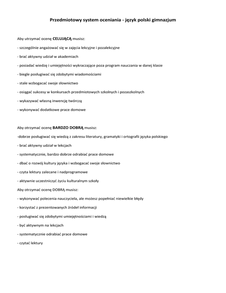 Przedmiotowy system oceniania - język polski gimnazjum Aby utrzymać ocenę CELUJĄCĄ musisz: - szczególnie angażować się w zajęcia lekcyjne i pozalekcyjne - brać aktywny udział w akademiach - posiadać wiedzę i umiejętności wykraczające poza program nauczania w danej klasie - biegle posługiwać się zdobytymi wiadomościami - stale wzbogacać swoje słownictwo - osiągać sukcesy w konkursach przedmiotowych szkolnych i pozaszkolnych - wykazywać własną inwencję twórczą - wykonywać dodatkowe prace domowe Aby otrzymać ocenę BARDZO DOBRĄ musisz: -dobrze posługiwać się wiedzą z zakresu literatury, gramatyki i ortografii języka polskiego - brać aktywny udział w lekcjach - systematycznie, bardzo dobrze odrabiać prace domowe - dbać o rozwój kultury języka i wzbogacać swoje słownictwo - czyta lektury zalecane i nadprogramowe - aktywnie uczestniczyć życiu kulturalnym szkoły Aby otrzymać ocenę DOBRĄ musisz: - wykonywać polecenia nauczyciela, ale możesz popełniać niewielkie błędy - korzystać z prezentowanych źródeł informacji - posługiwać się zdobytymi umiejętnościami i wiedzą - być aktywnym na lekcjach - systematycznie odrabiać prace domowe - czytać lektury Aby otrzymać ocenę DOSTATECZNĄ musisz: - opanować wymagania podstawowe z programu nauczania danej klasy - samodzielnie odpowiadać na proste pytania i wykonywać proste polecenia - samodzielnie konstruować poprawną wypowiedź ustną i pisemną - odrabiać prace domowe - starać się być aktywnym na lekcji - czytać lektury Aby otrzymać ocenę DOPUSZCZAJĄCĄ musisz: - częściowo opanować wymagania podstawowe - korzystając z pomocy udzielonej przez nauczyciela, odpowiedzieć na proste pytania i wykonać proste polecenia - posiadać regularnie prowadzony zeszyt - starać się odrabiać prace domowe - starać się być aktywnym na lekcji - wykazywać chęci poprawy ocen Jeśli natomiast: - masz lekceważący stosunek do przedmiotu - nie opanowałeś podstawowych wiadomości i umiejętności - na lekcji nie podejmujesz żadnych działań - nie potrafisz wykonać prostych poleceń nawet wtedy, gdy nauczyciel Ci pomaga - nie odrabiasz prac domowych i nie posiadasz zeszytu - masz zbyt duże zaległości w nauce niestety możesz otrzymać ocenę NIEDOSTATECZNĄ PRZEDMOIOTOWY SYSTEM OCENIANIA - JĘZYK POLSKI I. PRACE PISEMNE 1. SPRAWDZIANY SUMUJĄCE -obowiązkowe - po każdym dziale - zapowiedziane z tygodniowym wyprzedzeniem - poprzedzone lekcją powtórkową 2. SPRAWDZIANY BIEŻĄCE (KARTKÓWKI) - nie muszą być zapowiedziane - obejmują trzy ostatnie zagadnienia 3. WYPRACOWANIA KLASOWE - zapowiadane są wcześniej - muszą być pisane na kartkach formatu A4 *Nieobecność ucznia na sprawdzianie, wypracowaniu klasowym i zapowiedzianej kartkówce odnotowana jest w dzienniku jako „0” i nie jest liczona do średniej ocen . * Ocenę ze sprawdzianu, wypracowania i kartkówki można poprawić, obie oceny są wpisywane do dziennika. * Uczeń, który nie napisał sprawdzianu w wyznaczonym przez nauczyciela terminie, otrzymuje ocenę niedostateczną. * Uczeń, który otrzymał ocenę niedostateczną za nieuczciwe zachowanie na sprawdzianie, kartkówce, wypracowaniu (odpisywanie, rozmawianie, posiadanie „ściągi” itp.) traci prawo do jej poprawiania. * Na wniosek rodzica/ opiekuna sprawdziany i prace pisemne udostępniane są na spotkaniach z rodzicami i konsultacjach. 4. DYKTANDA - nie muszą być zapowiedziane 5. DŁUŻSZE PRACE DOMOWE - tematy prac są podane we wcześniejszym terminie Nauczyciel w ciągu 3 tygodni sprawdza prace pisemne. II ODPOWIEDZI USTNE * Odpowiedzi dotyczą trzech ostatnich tematów (nie lekcji) i nie muszą być zapowiadane przez nauczyciela. Sprawdzają przygotowanie uczniów do lekcji bieżącej. - uczeń może 2 razy w semestrze zgłosić nieprzygotowanie do lekcji - „np.” należy zgłosić przed rozpoczęciem lekcji III OBSERWACJA UCZNIA 1. PRZYGOTOWANIE DO LEKCJI (zadania domowe, zeszyt, podręczniki, wymagane przez nauczyciela pomoce) 2. PRACA NA LEKCJI (aktywność) - uczeń 2 razy w semestrze może być nieprzygotowany do zajęć - „bz” - brak zadania, zeszytu, ćwiczeń należy zgłosić przed rozpoczęciem lekcji - za każde kolejne nieprzygotowanie uczeń otrzymuje ocenę niedostateczną - za aktywność na lekcji można zdobyć „+”, pięć plusów to ocena bardzo dobra - za brak zainteresowania lekcją można dostać „-”, pięć minusów to ocena niedostateczna Uwaga! Prawo do zgłoszenia nieprzygotowania do lekcji i/lub braku zadania nie dotyczy zadań terminowych. Średnie ważone z języka polskiego Waga 5 - sprawdzian sumujący, testy, wypracowanie klasowe, konkursy międzyszkolne, jednorazowo w semestrze – systematyczny i aktywny udział w życiu kulturalnym szkoły, czyli: udział w konkursach, występach, przedstawieniach koła teatralnego, debatach, reprezentowanie szkoły na forum itp. Waga 3 - projekt edukacyjny, kartkówki, odpowiedzi ustne, recytacja, dłuższe prace domowe, konkursy szkolne(sukcesy), dyktanda, praktyczna praca na lekcji, projekt realizowany w klasie Waga 2 obserwacja - zadanie w grupach, zadanie domowe, aktywność na lekcji, zeszyt i notatki, udział w życiu kulturalnym szkoły, systematyczne uczęszczanie na zajęcia dodatkowe( liczymy obecności „+”; 5 x „+” = ocena bardzo dobra wagi 2) WYKAZ LEKTUR W GIMNAZJUM KLASA I GIMNAZJUM 1.”Biblia”, „ Księga Rodzaju”, „ Przypowieść o synu marnotrawnym”, „Hymn o miłości” 2. Mitologia – Jan Parandowski: „ Narodziny świata” , „ Orfeusz i Eurydyka” 3. Homer: „ Iliada’” i „Odyseja” ( fragm..) 4. Sofokles „ Antygona” 5. „ Pieśń o Rolandzie” ( fragm.) 6. Henryk Sienkiewicz „Krzyżacy” 7. William Szekspir „ Romeo i Julia” 8. Jan Kochanowski: fraszki, treny 9. Molier „ Skąpiec” KLASA II GIMNAZJUM 1. Ignacy Krasicki bajki 2 .Juliusz Słowacki ” Balladyna” 3. Adam Mickiewicz: Dziady c
