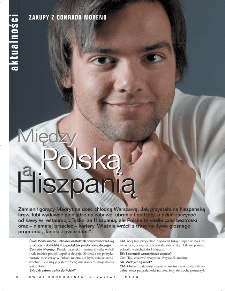 aktualnoÊci ZAKUPY Z CONRADO MORENO Mi´dzy Polskà a Hiszpanià Zamieni∏ goràcy Madryt na doÊç ch∏odnà Warszaw´. Jak przysta∏o na hiszpaƒskà krew, lubi wydawaç pieniàdze na zabaw´, ubrania i gad˝ety, a dzieƒ zaczynaç od kawy w restauracji. T´skni za Hiszpanià, ale Polska to wielki czas beztroski oraz – niema∏ej przecie˝ – kariery. W∏aÊnie wróci∏ z trasy na ˝ywo g∏oÊnego programu ,,Taniec z gwiazdami”. Âwiat Konsumenta: Jako dwunastolatek przeprowadzi∏eÊ si´ z rodzicami do Polski. Kto podjà∏ tak prze∏omowà decyzj´? Conrado Moreno: Przede wszystkim mama chcia∏a wróciç i tak rodzice podj´li wspólnà decyzj´. Zmieni∏a si´ polityka, nasta∏y inne czasy w Polsce, mo˝na ju˝ by∏o dzia∏aç samodzielnie... Zresztà ja jestem troch´ mieszaƒcem, moja mama jest z Porto. ÂK: Jak zatem trafi∏a do Polski? 8  W I A T K O N S U M E N T A w r z e s i e ƒ CM: Mój tata przyjecha∏ i wyk∏ada∏ tutaj hiszpaƒski na Uniwersytecie, a mama studiowa∏a iberystyk´. Tak si´ poznali, pobrali i wyjechali do Hiszpanii. ÂK: I porzucili wczeÊniejsze zaj´cia? CM: Tak, zostawili wszystko. Przyjació∏, rodzin´. ÂK: ˚adnych t´sknot? CM: Owszem, ale moja mama w swoim czasie zostawi∏a rodzin´, teraz przysz∏a kolej na tat´, ˝eby si´ troch´ pom´czy∏. 2 0 0 6 ÂK: Czujesz si´ bardziej Hiszpanem czy Polakiem? CM: Pó∏ na pó∏. Jako dziecko zastanawia∏em si´, czy jestem Polakiem czy Hiszpanem. Potrzebowa∏em swojej to˝samoÊci, tym bardziej, ˝e moi koledzy mieli jasnà sytuacj´, a ja nie. Ale ciàgnie mnie Hiszpania. Kiedy tylko mam czas, lec´ tam. Hiszpanie ˝yjà szybko i pozwalajà sobie na du˝y luz, tak˝e w pracy. Nie wyobra˝ajà sobie, ˝eby nie by∏o spotkaƒ poza pracà, ˝eby nie wyjÊç na kaw´, piwo czy obiad. Sà ciekawi siebie. ÂK: Lubià wydawaç pieniàdze? CM: Sà jednym z narodów, który najmniej oszcz´dza, przynajmniej w Europie. Biorà ogromne kredyty i sà zad∏u˝eni praktycznie do koƒca ˝ycia. W Polsce te˝ zaczà∏ si´ ten proces. ÂK: Na co najwi´cej wydajà? CM: Najwi´cej na restauracje, knajpy. Tu 20, tu 50 z∏... Ja sam jestem od tego uzale˝niony. Lubi´ wyjÊç na Êniadanie czy na kaw´ kilka razy w tygodniu. A Hiszpanie tak rozpoczynajà prawie ka˝dy dzieƒ. Du˝o te˝ kupujà ksià˝ek, gazet, p∏yt. Póêniej ubrania, mo˝e nie tak bardzo jak W∏osi, ale lubià dobrze si´ ubraç. Mnóstwo pieni´dzy poch∏aniajà mieszkania, sp∏acanie rat i samochody, tak jak wsz´dzie. ÂK: Czym kierujesz si´ podczas zakupów: cenà, markà czy jakoÊcià? CM: Nie kieruj´ si´ markà, nie do koƒca chyba te˝ jakoÊcià... Ostatnio polubi∏em kupowanie ubraƒ i szafa powoli zaczyna mi p´kaç w szwach. Okazuje si´, ˝e te ubrania nie sà tak trwa∏e. ÂK: A jakie marki preferujesz? CM: Lubi´ hiszpaƒskà Zar´, która w Polsce cieszy si´ du˝ym powodzeniem. Poza tym Diverse – majà niez∏e d˝insy. Polska firma Vistula ma bardzo fajne rzeczy. Z zapachów preferuj´ Fendi Life Essences, Bossa. ÂK: Co najbardziej uj´∏o Ci´ w Polsce? CM: Do Polski przyje˝d˝a∏em na wakacje, wi´c nie by∏a mi zupe∏nie obca. Kojarzy∏a si´ zawsze z latem, z wakacjami. Nie zna∏em polskiej zimy, jesieni. S∏owem, czas wielkiej beztroski... A˝ tu nagle musia∏em uczyç si´ j´zyka. Te spó∏g∏oski, dêwi´ki... nie u∏atwia∏y mi nauki. Natomiast zdziwi∏o mnie, ˝e tutaj jest tyle blondynek i blondynów, gdy˝ wi´kszoÊç Hiszpanów to bruneci. Taki maleƒki szok. Budzi∏o to mojà ciekawoÊç. ÂK: A coÊ Ci´ zniech´ci∏o? CM: Nie. Wr´cz przeciwnie, by∏em pozytywnie nastawiony, poniewa˝ w Hiszpanii bardzo nie lubi∏em szko∏y, ledwie zdawa∏em z klasy do klasy. Mia∏em du˝e problemy... Ta zmiana zmusi∏a mnie do wysi∏ku, zmotywowa∏a do pracy. I nagle, w Polsce, zaczà∏em dostawaç czwórki i piàtki. Mo˝e w Hiszpanii by∏em zbyt leniwy? ÂK: A poza szko∏à? CM: Jako kilkunastolatek nie zwraca∏em uwagi na wiele spraw. Z perspektywy czasu wydaje mi si´, ˝e Polacy za bardzo narzekajà. Mówi zresztà o tym wi´kszoÊç ludzi i sami Polacy si´ do tego przyznajà, wi´c chyba jest w tym du˝o prawdy. Ale kiedy je˝d˝´ do Hiszpanii, dochodz´ do wniosku, ˝e to cecha ludzka. ÂK: Co ró˝ni w takim razie Polaków i Hiszpanów? CM: Hiszpanie sà bardziej beztroscy, otwarci i spontaniczni.  W I A T Mniej martwià si´ na co dzieƒ. Majà oczywiÊcie swoje k∏opoty, ale sà bardziej pogodni. W Polsce spotykam si´ te˝ z zawiÊcià. ÂK: Czy nie sà to przypadkiem cz´sto powtarzane stereotypy? CM: KiedyÊ uwa˝a∏em, ˝e te stereotypy nie sà prawdziwe. To nie jest zawiÊç, która pojawia si´ w relacjach kole˝eƒskich czy przyjacielskich, a raczej na ulicach wÊród ludzi, którzy si´ nie znajà. W moim kraju te˝ si´ zdarza, ˝e twój przyjaciel okazuje si´ jedynie pozorantem. Takie podwójne dno. Polacy na poczàtku wydajà si´ zamkni´ci w sobie, ale prawdziwy przyjaciel jest prawdziwym przyjacielem. ÂK: Warto zamieniaç goràcà Hiszpani´ pe∏nà pla˝ i palm na nieco zimniejszà Polsk´? CM: Niczego osobiÊcie nie zamienia∏em. To by∏a decyzja rodziców, nie moja. Z perspektywy, twierdz´, ˝e by∏o warto. Dla turystów Hiszpania to pla˝a i palmy, ale sà te˝ problemy obyczajowe, chocia˝by zakrojona na szerokà skal´ narkomania, czego w Polsce jeszcze w ogóle nie widaç, na szcz´Êcie. ÂK: Czy˝by? CM: Nie, nie widaç ludzi, którzy k∏ujà si´ strzykawkami albo sà zniszczeni przez narkotyki. Skala jest nieporównywalna. KtoÊ, kto ˝y∏ w Hiszpanii, wie, ˝e to problemy bardzo istotne. Polaków na ogó∏ ∏àczy si´ z alkoholizmem, ale to i tak bez porównania. ÂK: Spodziewa∏eÊ si´ w Polsce takiego ˝ycia, kariery, takiego rozwoju wypadków? CM: Nigdy tego nie planowa∏em. Zawsze ˝y∏em dniem dzisiejszym, nie wybiega∏em myÊlami w przysz∏oÊç. Mam dopiero 24 lata, wi´c wszystko si´ kszta