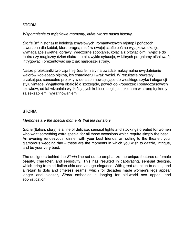 STORIA Wspomnienia to wyjątkowe momenty, które tworzą naszą historię. Storia (wł. historia) to kolekcja zmysłowych, romantycznych rajstop i pończoch stworzona dla kobiet, które pragną mieć w swojej szafie coś na wyjątkowe okazje, wymagające świetnej oprawy. Wieczorne spotkanie, kolacja z przyjaciółmi, wyjście do teatru czy magiczny dzień ślubu - to niezwykłe sytuacje, w których pragniemy olśniewać, intrygować i prezentować się z jak najlepszej strony. Nasze projektantki tworząc linię Storia miały na uwadze maksymalne uwydatnienie walorów kobiecego piękna, ich charakteru i wrażliwości. W rezultacie powstały urzekające, sensualne projekty w detalach nawiązujące do włoskiego szyku i elegancji stylu vintage. Wyjątkowa dbałość o szczegóły, powrót do kropeczek i ponadczasowych szewków, od lat wizualnie wydłużających kobiece nogi, jest ukłonem w stronę tęsknoty za seksapilem i wyrafinowaniem. STORIA Memories are the special moments that tell our story. Storia (Italian: story) is a line of delicate, sensual tights and stockings created for women who want something extra special for all those occasions which require simply the best. An evening rendezvous, dinner with your best friends, an outing to the theater, your glamorous wedding day – these are the moments in which you wish to dazzle, intrigue, and be your very best. The designers behind the Storia line set out to emphasize the unique features of female beauty, character, and sensitivity. This has resulted in captivating, sensual designs, which bring to mind Italian chic and vintage elegance. With great attention to detail, and a return to dots and timeless seams, which for decades made women’s legs appear longer and sleeker, Storia embodies a longing for old-world sex appeal and sophistication.