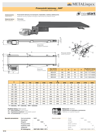 Przenośnik taśmowy - NAP Conveyor belt - NAP Przenośnik taśmowy do transportu materiałów, zasilany elektrycznie. Material convey System through a belt driven by electric force. Materiał taśmy: Belt material: Poliuretan Polyurethane 30 Zastosowanie: Application: 2 F 6 30 Wsporniki Support brackets 8 30 B 45 5 4 1 Pozycja silnika Motor position 8 7 C 30 8 A 3 E Wsporniki Support brakets D Typ silnika Motor type C D E F Prędkość taśmy Belt speed BOX-25 180 300 65 130 5,8 ÷ 11,7 m/min BOX-30 195 310 70 130 4,4 ÷ 11,7 m/min BOX-40 200 325 70 150 4,4 ÷ 8,8 m/min 500 750 1000 1250 1500 B 1750 2000 2250 2500 2750 3000 30 - 50 ● ● ● ● ● ● ● ● ● ● ● 75 - 100 ● ● ● ● ● ● ● ●● ●● ●● ●● 125 - 150 ●● ●● ●● ●● ●● ●● ●● ●● ●● ●● ●● 175 - 200 ●● ●● ●● ●● ●● ●● ●● ●● ●●● ●●● ●●● 225 - 250 ●● ●● ●● ●● ●● ●● ●●● ●●● ●●● ●●● ●●● 275 - 300 ●● ●● ●● ●● ●●● ●●● ●●● ●●● ●●● ●●● ●●● A 350 - 400 ●● ●● ●●● ●●● ●●● ●●● ●●● ●●● ●●● ●●● ●●● 450 - 500 ●●● ●●● ●●● ●●● ●●● ●●● ●●● ●●● ●●● ●●● ●●● 550 - 600 ●●● ●●● ●●● ●●● ●●● ●●● ●●● ●●● ●●● ●●● ●●● ● = BOX25, ●● = BOX30, ●●● = BOX40 Prędkoś taśmy / Belt speed: VF - stała prędkość / fixed speed VV - regulowana prędkość / adjustable speed VR - na zamówienie / on request Sposób zamawiania: K/12 Kod prznośnika Szerokość Długość Pozycja silnika Prędkość stała Wyłącznik Nr katalogowy - NAP200 1500 1 VF I - NAP-200-1500-1-VF-I Wyłącznik / Switch: Opcjonalnie na specjalne zamówienie Optional, on special request How to order: Code Width Lenght Motor position Fixed speed Swith Item no. - NAP200 1500 1 VF I - NAP-200-1500-1-VF-I