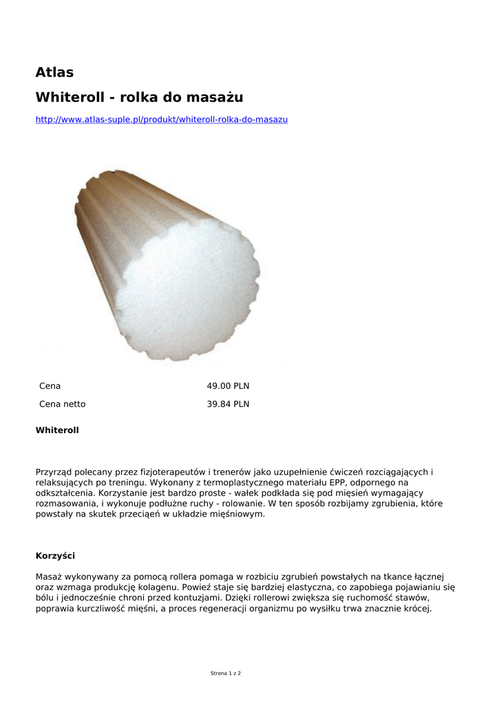 Atlas Whiteroll - rolka do masażu http://www.atlas-suple.pl/produkt/whiteroll-rolka-do-masazu Cena 49.00 PLN Cena netto 39.84 PLN Whiteroll Przyrząd polecany przez fizjoterapeutów i trenerów jako uzupełnienie ćwiczeń rozciągających i relaksujących po treningu. Wykonany z termoplastycznego materiału EPP, odpornego na odkształcenia. Korzystanie jest bardzo proste - wałek podkłada się pod mięsień wymagający rozmasowania, i wykonuje podłużne ruchy - rolowanie. W ten sposób rozbijamy zgrubienia, które powstały na skutek przeciąeń w układzie mięśniowym. Korzyści Masaż wykonywany za pomocą rollera pomaga w rozbiciu zgrubień powstałych na tkance łącznej oraz wzmaga produkcję kolagenu. Powieź staje się bardziej elastyczna, co zapobiega pojawianiu się bólu i jednocześnie chroni przed kontuzjami. Dzięki rollerowi zwiększa się ruchomość stawów, poprawia kurczliwość mięśni, a proces regeneracji organizmu po wysiłku trwa znacznie krócej. Strona 1 z 2 Technika wykonywania ćwiczeń Rozpocznij od mieśni, które najbardziej potrzebują masażu - najlepiej zacząć od dolnej części ciała. Jeśli chcesz romasować łydkę, połóż jedną nogę na whiteroll a druga noga może leżeć z boku. Jeśli potrzebujesz większego nacisku, podnieś drugą nogę w górę lub połóż ją na rolowanej nodze. W zależności od potrzeby, możesz rolować całą łydkę lub podzielić ją na części. Zatrzymaj masaż w miejscu gdzie czujesz największy dyskomfort na około 15 sekund. Możesz również dodać ruchy na boki. Podobnie wykonaj masaż na pozostałych częściach ciała. Strona 2 z 2