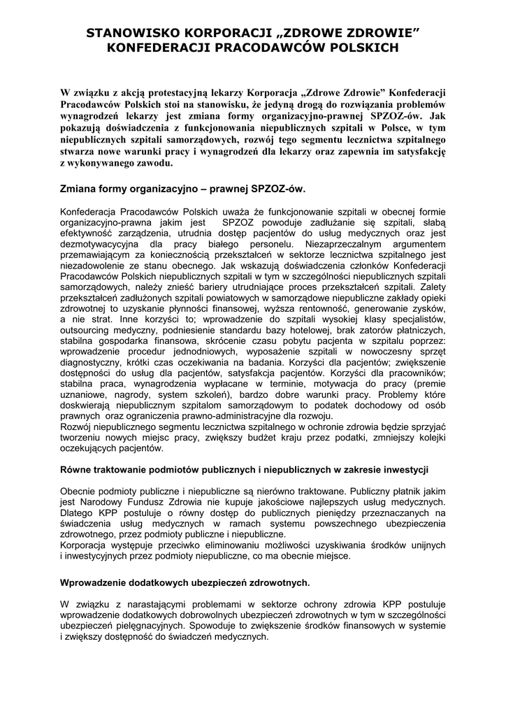STANOWISKO KORPORACJI „ZDROWE ZDROWIE” KONFEDERACJI PRACODAWCÓW POLSKICH W związku z akcją protestacyjną lekarzy Korporacja „Zdrowe Zdrowie” Konfederacji Pracodawców Polskich stoi na stanowisku, Ŝe jedyną drogą do rozwiązania problemów wynagrodzeń lekarzy jest zmiana formy organizacyjno-prawnej SPZOZ-ów. Jak pokazują doświadczenia z funkcjonowania niepublicznych szpitali w Polsce, w tym niepublicznych szpitali samorządowych, rozwój tego segmentu lecznictwa szpitalnego stwarza nowe warunki pracy i wynagrodzeń dla lekarzy oraz zapewnia im satysfakcję z wykonywanego zawodu. Zmiana formy organizacyjno – prawnej SPZOZ-ów. Konfederacja Pracodawców Polskich uwaŜa Ŝe funkcjonowanie szpitali w obecnej formie organizacyjno-prawna jakim jest SPZOZ powoduje zadłuŜanie się szpitali, słabą efektywność zarządzenia, utrudnia dostęp pacjentów do usług medycznych oraz jest dezmotywacycyjna dla pracy białego personelu. Niezaprzeczalnym argumentem przemawiającym za koniecznością przekształceń w sektorze lecznictwa szpitalnego jest niezadowolenie ze stanu obecnego. Jak wskazują doświadczenia członków Konfederacji Pracodawców Polskich niepublicznych szpitali w tym w szczególności niepublicznych szpitali samorządowych, naleŜy znieść bariery utrudniające proces przekształceń szpitali. Zalety przekształceń zadłuŜonych szpitali powiatowych w samorządowe niepubliczne zakłady opieki zdrowotnej to uzyskanie płynności finansowej, wyŜsza rentowność, generowanie zysków, a nie strat. Inne korzyści to; wprowadzenie do szpitali wysokiej klasy specjalistów, outsourcing medyczny, podniesienie standardu bazy hotelowej, brak zatorów płatniczych, stabilna gospodarka finansowa, skrócenie czasu pobytu pacjenta w szpitalu poprzez: wprowadzenie procedur jednodniowych, wyposaŜenie szpitali w nowoczesny sprzęt diagnostyczny, krótki czas oczekiwania na badania. Korzyści dla pacjentów; zwiększenie dostępności do usług dla pacjentów, satysfakcja pacjentów. Korzyści dla pracowników; stabilna praca, wynagrodzenia wypłacane w terminie, motywacja do pracy (premie uznaniowe, nagrody, system szkoleń), bardzo dobre warunki pracy. Problemy które doskwierają niepublicznym szpitalom samorządowym to podatek dochodowy od osób prawnych oraz ograniczenia prawno-administracyjne dla rozwoju. Rozwój niepublicznego segmentu lecznictwa szpitalnego w ochronie zdrowia będzie sprzyjać tworzeniu nowych miejsc pracy, zwiększy budŜet kraju przez podatki, zmniejszy kolejki oczekujących pacjentów. Równe traktowanie podmiotów publicznych i niepublicznych w zakresie inwestycji Obecnie podmioty publiczne i niepubliczne są nierówno traktowane. Publiczny płatnik jakim jest Narodowy Fundusz Zdrowia nie kupuje jakościowe najlepszych usług medycznych. Dlatego KPP postuluje o równy dostęp do publicznych pieniędzy przeznaczanych na świadczenia usług medycznych w ramach systemu powszechnego ubezpieczenia zdrowotnego, przez podmioty publiczne i niepubliczne. Korporacja występuje przeciwko eliminowaniu moŜliwości uzyskiwania środków unijnych i inwestycyjnych przez podmioty niepubliczne, co ma obecnie miejsce. Wprowadzenie dodatkowych ubezpieczeń zdrowotnych. W związku z narastającymi problemami w sektorze ochrony zdrowia KPP postuluje wprowadzenie dodatkowych dobrowolnych ubezpieczeń zdrowotnych w tym w szczególności ubezpieczeń pielęgnacyjnych. Spowoduje to zwiększenie środków finansowych w systemie i zwiększy dostępność do świadczeń medycznych.