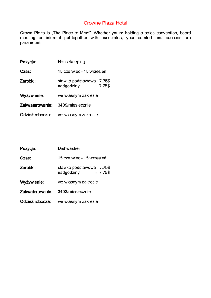 Crowne Plaza Hotel Crown Plaza is „The Place to Meet”. Whether you’re holding a sales convention, board meeting or informal get-together with associates, your comfort and success are paramount. Pozycja: Housekeeping Czas: 15 czerwiec – 15 wrzesień Zarobki: stawka podstawowa – 7.75$ nadgodziny - 7.75$ Wyżywienie: we własnym zakresie Zakwaterowanie: 340$/miesięcznie Odzież robocza: we własnym zakresie Pozycja: Dishwasher Czas: 15 czerwiec – 15 wrzesień Zarobki: stawka podstawowa – 7.75$ nadgodziny - 7.75$ Wyżywienie: we własnym zakresie Zakwaterowanie: 340$/miesięcznie Odzież robocza: we własnym zakresie