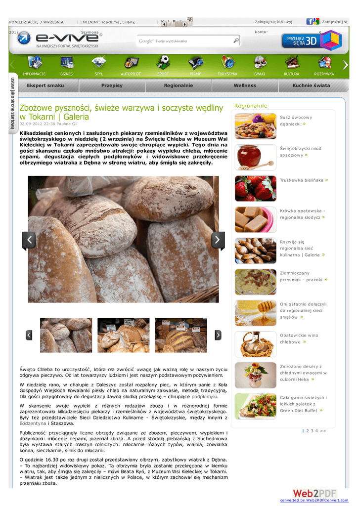 PO NIEDZIAŁEK, 3 W RZEŚNIA | IMIENINY: Joachim a, Liliany, 2012 | K I E L C E 2 3 ° C Szym ona INFORMACJE BIZNES Ekspert smaku STYL AUTOPILOT Przepisy SPORT FIRMY TURYSTYKA Regionalnie Zbożowe pyszności, świeże warzywa i soczyste wędliny w Tokarni | Galeria 02-09-2012 22:30 Paulina Gil Kilkadziesiąt cenionych i zasłużonych piekarzy rzemieślników z województwa świętokrzyskiego w niedzielę (2 września) na Święcie Chleba w Muzeum Wsi Kieleckiej w Tokarni zaprezentowało swoje chrupiące wypieki. Tego dnia na gości skansenu czekało mnóstwo atrakcji: pokazy wypieku chleba, młócenie cepami, degustacja ciepłych podpłomyków i widowiskowe przekręcenie olbrzymiego wiatraka z Dębna w stronę wiatru, aby śmigła się zakręciły. Zaloguj się lub użyj | Zarejestruj si k onta: ę SMAKI Wellness KULTURA ROZRYWKA Kuchnie świata Regionalnie Susz ow ocow y dębniacki » Św iętokrzyski miód spadziow y » Truskaw ka bielińska » Krów ka opatow ska regionalna słodycz » Rozw ija się regionalna sieć kulinarna | Galeria » Ziemniaczany przysmak – prazoki » Oni ostatnio dołączyli do regionalnej sieci smaków » Opatow ickie w ino chlebow e » Święto Chleba to uroczystość, która ma zwrócić uwagę jak ważną rolę w naszym życiu odgrywa pieczywo. Od lat towarzyszy ludziom i jest naszym podstawowym pożywieniem. W niedzielę rano, w chałupie z Daleszyc został rozpalony piec, w którym panie z Koła Gospodyń Wiejskich Kowalanki piekły chleb na naturalnym zakwasie, metodą tradycyjną. Dla gości przygotowały do degustacji dawną słodką przekąskę – chrupiące podpłomyki. W skansenie swoje wypieki z różnych rodzajów zboża i w różnorodnej formie zaprezentowało kilkudziesięciu piekarzy i rzemieślników z województwa świętokrzyskiego. Były też przedstawiciele Sieci Dziedzictwo Kulinarne - Świętokrzyskie, między innymi z Bodzentyna i Staszowa. Publiczność przyciągnęły liczne obrzędy związane ze zbożem, pieczywem, wypiekiem i dożynkami: młócenie cepami, przemiał zboża. A przed stodołą plebiańską z Suchedniowa była wystawa starych maszyn rolniczych: młocarnie różnych typów, wialnia, żniwiarka konna, sieczkarnie, silnik do młocarni. Zmrożone desery z chłodnymi ow ocami w cukierni Heka » Cała gama św ieżych i lekkich sałatek z Green Diet Buffet » 1 2 3 4 >> O godzinie 16.30 po raz drugi został przedstawiony olbrzymi, zabytkowy wiatrak z Dębna. – To najbardziej widowiskowy pokaz. Ta olbrzymia bryła zostanie przekręcona w kiernku wiatru, tak, aby śmigła się zakręciły – mówi Beata Ryń, z Muzeum Wsi Kieleckiej w Tokarni. – Wiatrak jest także jednym z nielicznych w Polsce, w którym zachował się mechanizm przemiału zboża. converted by Web2PDFConvert.com Na głównej scenie podczas Święta Chleba zaprezentowała się Genowefa Pigwa oraz wystąpił widowiskowy książę cygański Dziani wraz z zespołem. Główny blok muzycznotaneczny będzie należał do gminy Morawica, która zaprezentuje swój potencjał inwestycyjny oraz dorobek kulturalny. Patronat medialny nad imprezą objął portal E-VIVE. Lubię to! 0 0 Tweetnij 0 wykop + 0 Dodaj komentarz... Wty czka społecznościow a F acebooka Polecamy Wybór tygodnia – złoto i czerń W szystkie serw isy: Wielkie Domy Mody: GUC C I Witaj szkoło! Siedzimy zdrowo i... Zbożowe pyszności, świeże warzywa i... Radiofrekwencja – wyglądaj młodo Strona głów na | Regulamin informacje | biznes | styl | autopilot | sport | firmy | turystyka | smaki | kultura | rozryw ka | nie przegap | rodzice | plotki | plac zabaw | pogoda Redakcja ul. Robotnicza 5 25-662 Kielce [email protected] converted by Web2PDFConvert.com