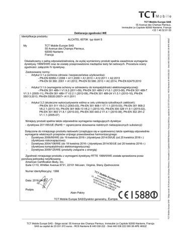 TCT Mobile Europe SAS 55 Avenue des Champs Pierreux, Immeuble Le Capitole 92000 Nanterre, Francja +33 1 46 52 61 00 Deklaracja zgodności WE ALCATEL 6070K typ Idol4 S My TCT Mobile Europe SAS 55 Avenue des Champs Pierreux, 92000 Nanterre Francja Oświadczamy z pełną odpowiedzialnością, że wyżej wymieniony produkt spełnia zasadnicze wymagania dyrektywy 1999/5/WE oraz że zostały przeprowadzone niezbędne testy fal radiowych. Procedura oceny zgodności: załącznik IV dyrektywy. Zastosowane normy: Artykuł 3.1.a (ochrona zdrowia i bezpieczeństwa użytkownika): - PN-EN 60950-1:2006 + A11:2009 + A1:2010 + A12:2011 + A2:2013 - PN-EN 50 360: 2001 + A1:2012, PN-EN 50 566: 2013 + AC:2014, PN-EN 62479:2010 Artykuł 3.1.b (wymagania ochrony w odniesieniu do kompatybilności elektromagnetycznej): - PN-EN 301 489-1 V1.9.2 (2011-09), PN-EN 301 489-3 V1.6.1 (2013-08), PN-EN 301 489-7 V1.3.1 (2005-11), PN-EN 301 489-17 V2.2.1 (2012-09), PN-EN 301 489-24 V1.5.1 (2010-10), PN-EN 55013:2013, PN-EN 55020:2007+ A11:2011 - - Artykuł 3.2 (skuteczne wykorzystywanie widma w celu uniknięcia szkodliwych zakłóceń): - PN-EN 301 511 V9.0.2 (2003-03), PN-EN 301 908-1 V7.1.1 (2015-03), PN-EN 301 908-2 V6.2.1 (2013-10), PN-EN 301 908-13 V6.2.1 (2013-10), PN-EN 300 328 V1.9.1 (2015-02), PN-EN 301 893 V1.8.1 (2015-03), PN-EN 300 440-2 V1.4.1 (2010-08), PN-EN 302 291-2 V1.1.1 (2005-07) Niniejszy produkt spełnia także odpowiednie wymagania następujących dyrektyw: - dyrektywa 2011/65/UE (RoHS – ograniczenie stosowania niektórych niebezpiecznych substancji) Dołączone do niniejszego produktu ładowarki (znajdujące się w opakowaniu) także spełniają odpowiednie wymagania właściwych przepisów unijnego prawodawstwa harmonizacyjnego: Dyrektywa 2006/95/WE (do 19 kwietnia 2016 r.)/dyrektywa 2014/35/UE (od 20 kwietnia 2016 r.) (dyrektywa niskonapięciowa) Dyrektywa 2004/108/WE (do 19 kwietnia 2016 r.)/dyrektywa 2014/30/UE (od 20 kwietnia 2016 r.) (dyrektywa kompatybilności elektromagnetycznej) Dyrektywa 2009/125/WE (produkty związane z energią) Zgodność niniejszego produktu z wymogami dyrektywy RTTE 1999/5/WE została sprawdzona przez poniższą jednostkę notyfikowaną: American Certification Body, Inc. Suite C110, Whittier Avenue 6731, 22101 McLean, Virginia, Stany Zjednoczone Numer identyfikacyjny: 1588 Data: 2016-04-20 Podpis Alain Pakiry TCT Mobile Europe SAS/Dyrektor generalny, Europa. ____________________________________________________________________________________________________________________ TCT Mobile Europe SAS - Siège social: 55 Avenue des Champs Pierreux, Immeuble Le Capitole 92000 Nanterre, Francja SAS au capital de 23 031 072 euros - RCS Nanterre B 440 038 222 - Siret 440 038 222 000 38 APE 4652Z TCT Mobile Europe SAS - Siège social: 55 Avenue des Champs Pierreux, Immeuble Le Capitole 92000 Nanterre, Francja SAS au capital de 23 031 072 euros - RCS Nanterre B 440 038 222 - Siret 440 038 222 000 38 APE 4652Z Identyfikacja produktu: