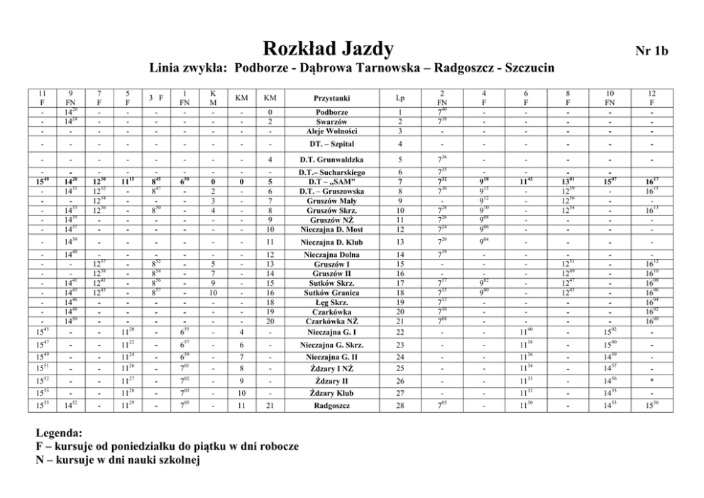 Rozkład Jazdy Nr 1b Linia zwykła: Podborze - Dąbrowa Tarnowska – Radgoszcz - Szczucin 11 F - 9 FN 1420 1424 - 7 F - 5 F - - 1 FN - K M - - - - - - - - - - - - - 3 F 1 2 3 2 FN 740 738 - 4 F - 6 F - 8 F - 10 FN - 12 F - DT. – Szpital 4 - - - - - - D.T. Grunwaldzka 5 736 - - - - - KM KM Przystanki Lp - 0 2 - Podborze Swarzów Aleje Wolności - - - - - 4 35 1540 - 1428 1431 1433 1435 1437 1230 1232 1234 1236 - 1115 - 845 847 850 - 650 - 0 2 3 4 - 0 - 5 6 7 8 9 10 D.T.– Sucharskiego D.T – ,,SAM” D.T. – Gruszowska Gruszów Mały Gruszów Skrz. Gruszów NŻ Nieczajna D. Most 6 7 8 9 10 11 12 7 732 730 728 726 724 918 915 912 910 908 906 1145 - 1301 1259 1256 1254 - 1507 - 1617 1615 1613 - - 1439 - - - - - - 11 Nieczajna D. Klub 13 720 904 19 - - - - 1545 14 1441 1443 1446 1448 1450 - 1237 1238 1241 1243 - 1120 852 854 856 857 - 655 5 7 9 10 - 4 12 13 14 15 16 18 19 20 - Nieczajna Dolna Gruszów I Gruszów II Sutków Skrz. Sutków Granica Łęg Skrz. Czarkówka Czarkówka NŻ Nieczajna G. I 14 15 16 17 18 19 20 21 22 7 717 715 713 710 708 - 902 900 - 1140 1251 1249 1247 1245 - 1502 1612 1610 1608 1606 1604 1602 1600 - 1547 - - 1122 - 657 - 6 - Nieczajna G. Skrz. 23 - - 1138 - 1500 - 24 59 36 59 40 49 15 1551 - - 11 1126 - 6 701 - 7 8 - Nieczajna G. II Żdzary I NŻ 24 25 - - 11 1134 - 14 1457 - 1552 - - 1127 - 702 - 9 - Żdzary II 26 - - 1133 - 1456 * - 11 28 - 7 03 - 11 32 - 14 55 - 11 29 7 05 11 30 14 53 1556 15 53 15 55 14 52 - - - 10 11 21 Legenda: F – kursuje od poniedziałku do piątku w dni robocze N – kursuje w dni nauki szkolnej Żdzary Klub Radgoszcz 27 - 28 05 7 - - Rozkład Jazdy Nr 1a Linia zwykła: Podborze — Dąbrowa Tarnowska – Radgoszcz – Szczucin F 19 F 17 1830 1832 1835 1836 1837 1839 1840 1842 1844 - 1640 1642 1645 1646 1647 1649 1650 1652 1654 - - - - - F 15 FSN 13 FK 11 F 9 F 7 FS 5 FMK 3 FN 1 745 748 745 750 753 754 756 757 800 - 610 615 617 618 620 622 624 - 620 625 627 628 630 632 634 636 638 639 640 641 643 655 647 650 GODZINY ODJAZDÓW - 1515 1520 1521 1523 1525 1527 1528 - 1420 1423 1425 1428 1431 1433 1434 1435 1438 1440 1442 1444 1446 1448 1450 1451 1452 1454 1456 1458 1500 1338 1343 1345 1348 1350 1351 1353 - 1150 1153 1155 1156 1157 1200 1203 1205 1207 - 930 933 935 936 937 940 942 944 946 - KM KM Lp. Przystanki KM 0 4 6 8 9 9,5 10 11 13 14 15 16 17 18 19 20 23 0 2 4 5 6 7 8 9 10 11 11,5 12 13 - 1. 2. 3. 4. 5. 6. 7. 8. 9. 10. 11. 12. 13. 14. 15. 16. 17. 18. 19. 20. 21. 22. 23. 24. 25. 26 27 Podborze Swarzów D.T. Aleje Wol. D.T. Szpital D.T. Grunwaldzka D.T. Sucharskiego D.T. „SAM” Gruszowska Gruszów Wielki Gruszów W. Nż Nieczajna D. Most Nieczajna Górna. I Nieczajna G. Skrz. Nieczajna .G.II Żdzary I NŻ Żdżary II Żdżary Klub Radgoszcz Poręba Skrz. Podlesie Sklep Podlesie II Podlesie III Małec Nowa Wieś Małec Szkoła Brzezówka Zabrnie Szczucin 28 27 26 25 24 23 19 17 15 14 Legenda: S – W dni wolne od nauki kursuje do przystanku D.T. „Centrum” F – kursuje od poniedziałku do piątku w dni robocze N – kursuje w dni nauki szkolnej M – kursuje w dni wolne od nauki K – kursuje w soboty 13,5 13 12 10 9 8 7 6 5 4 3 0 F N 2 FM 4 F 6 735 734 733 732 731 730 724 722 720 719 718 717 715 712 710 709 708 704 702 700 658 656 735 734 733 732 731 730 726 724 723 722 720 719 718 717 715 - 822 820 815 813 811 809 807 807 805 - F 8 F 10 FS K 12 FN 14 F 16 F 18 1538 1535 1533 1531 1529 1528 1527 1525 - 1708 1704 1702 1700 1659 1658 1657 1655 - F 20 GODZINY ODJAZDÓW 1008 1005 1003 1001 1059 1056 954 953 952 950 - 1224 1222 1220 1219 1217 1215 1214 1213 1212 1210 - 1415 1412 1410 1409 1408 1404 1402 1400 1359 1358 1357 1355 - 1538 1533 1530 1528 1526 1525 1524 1522 1520 1519 1518 1515 1514 1512 1510 1507 1505 1900 1854 1852 1850 1849 1848 1847 1845 -